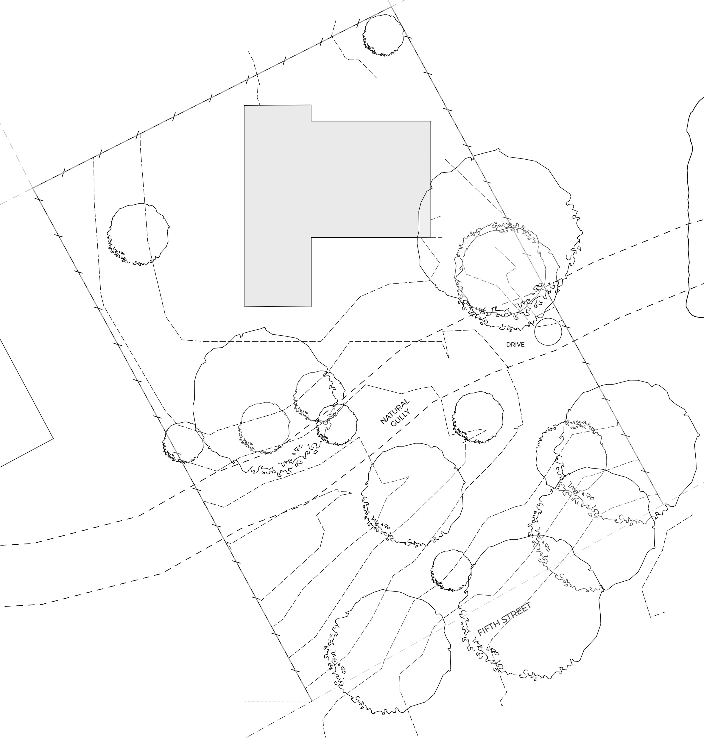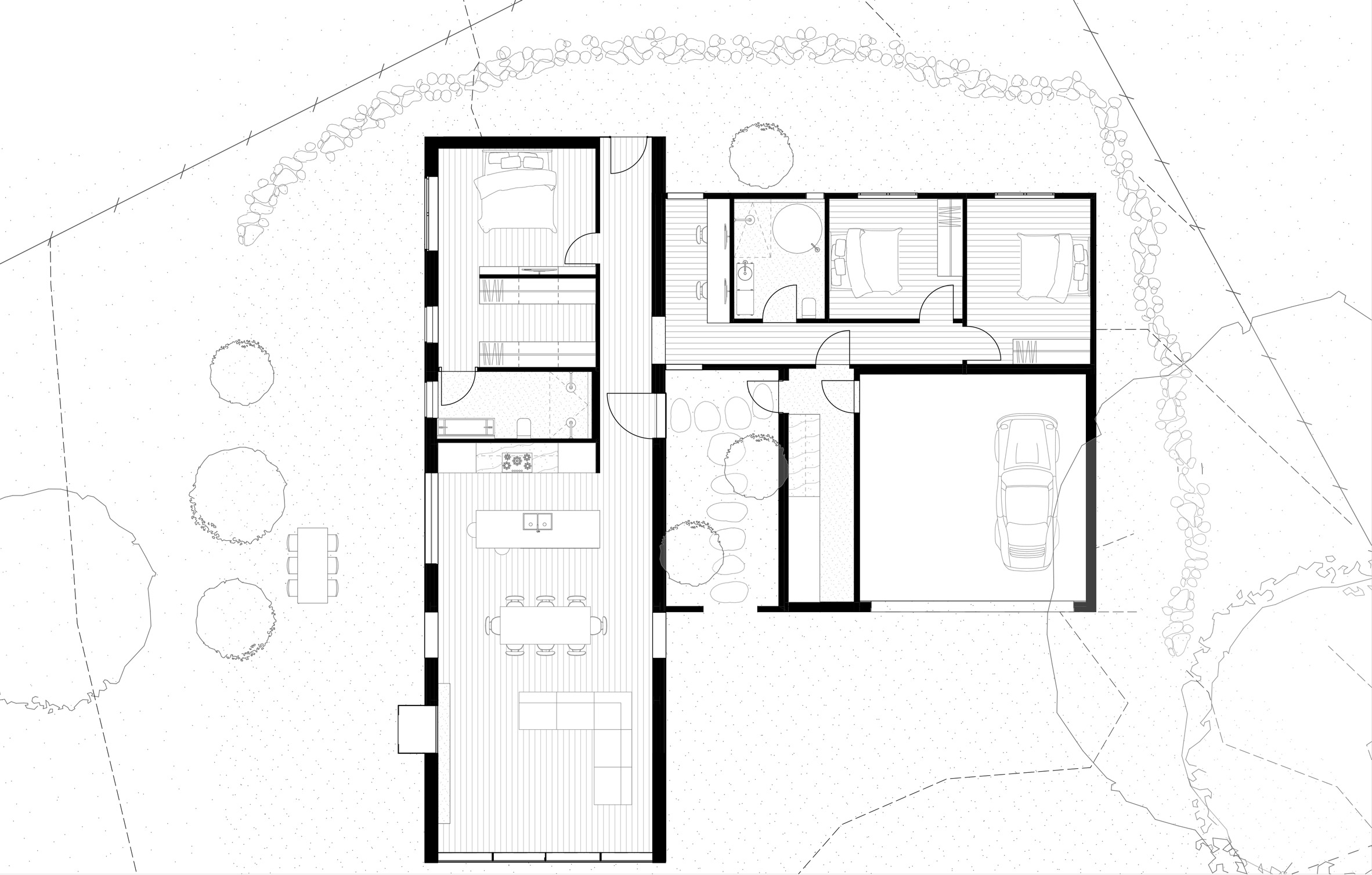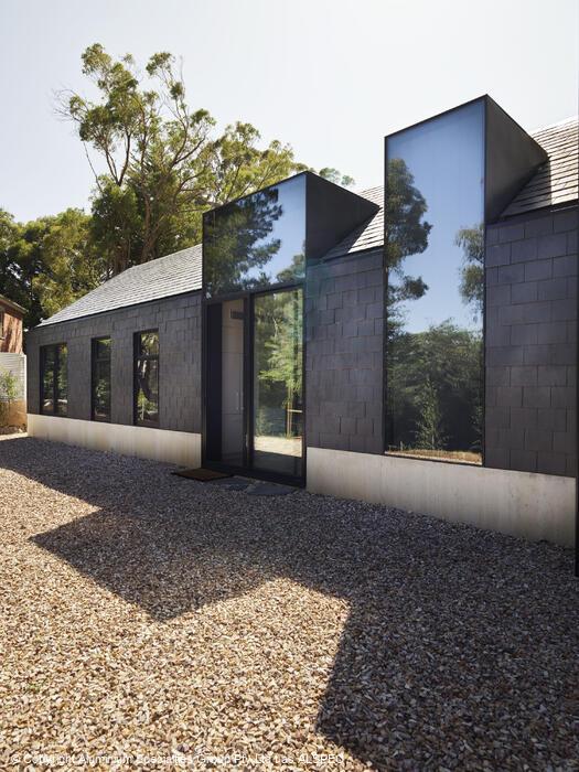 Projekt obejmuje dwa budynki ustawione prostopadle względem siebie, w tym jeden z dwuspadowym dachem obitym płytką łupkową, który kontrastuje z prostym, białym elementem przylegającym do niego. Niższa konstrukcja pełni funkcję skrzydła gościnnego oraz garażu. Ścieżka prowadząca do przeszklonych drzwi otwierających się na przestrzeń dzienną składa się z nieregularnych kamiennych płyt, które doskonale komponują się z otaczającym krajobrazem.