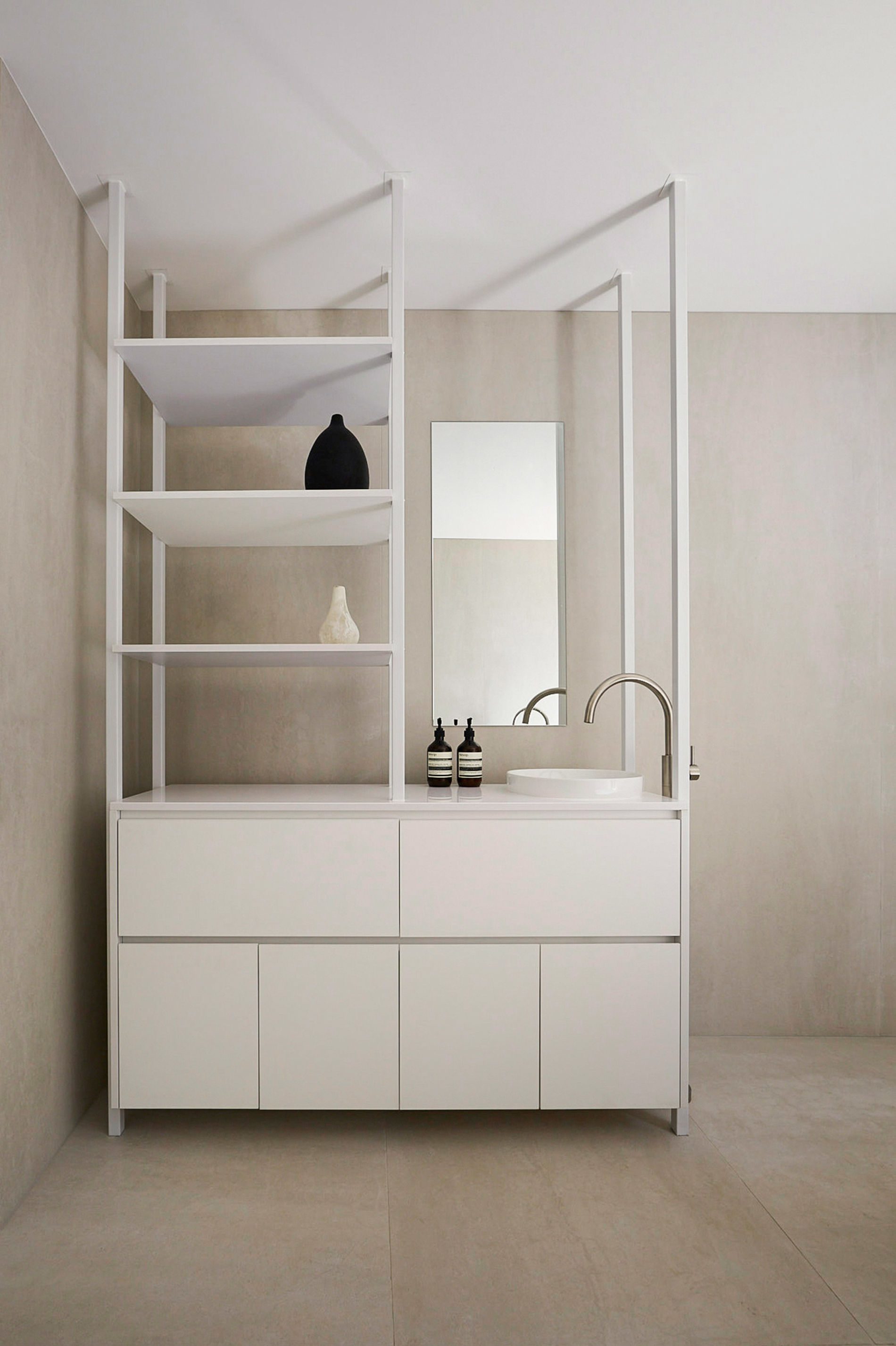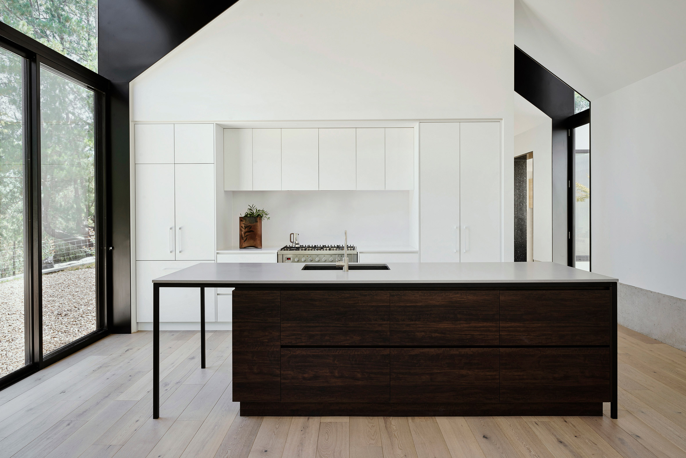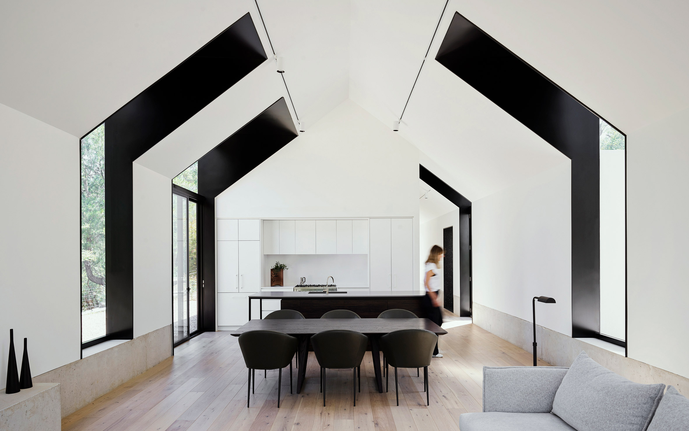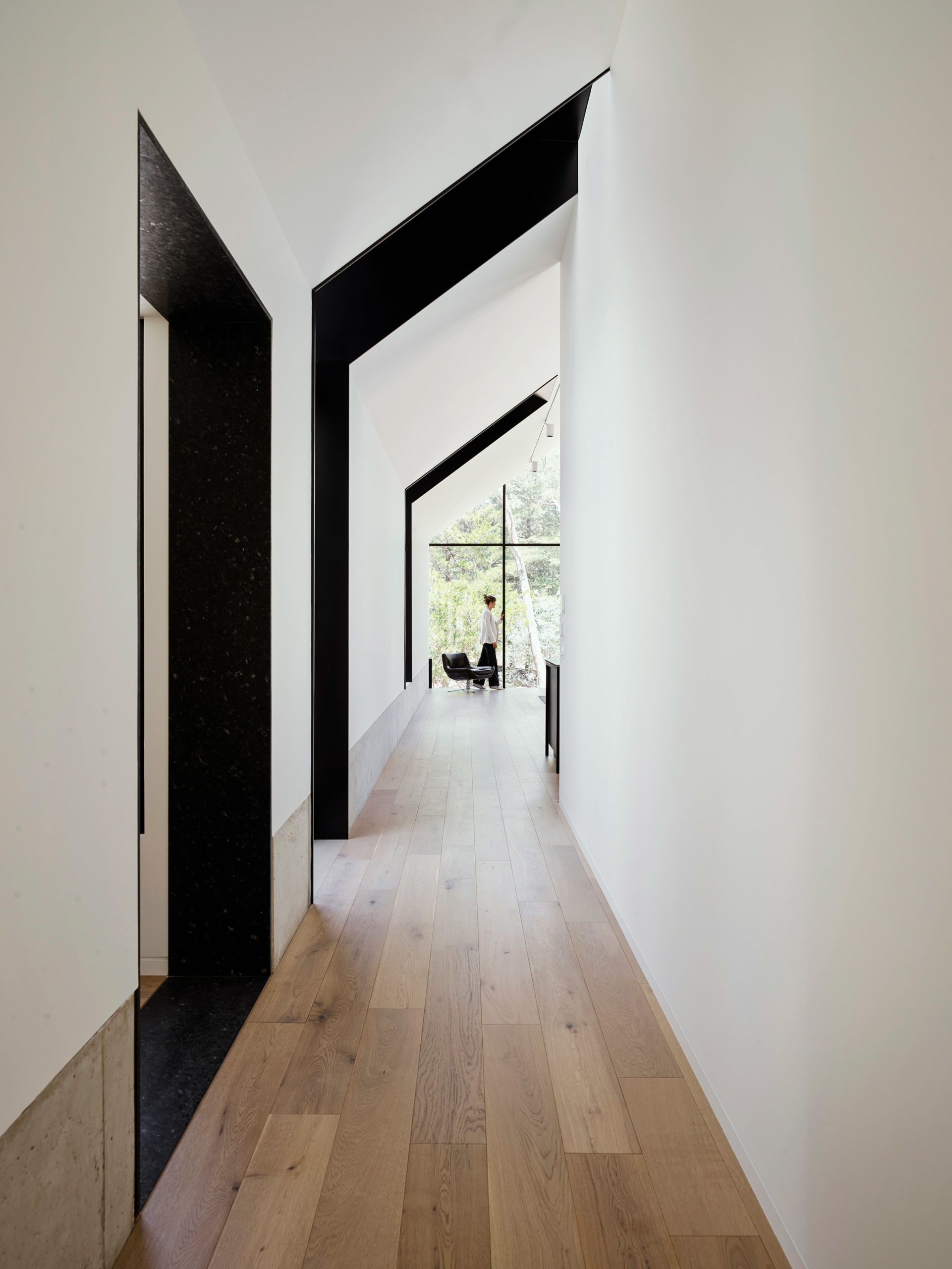 Salon z otwartym planem znajduje się w wyższej części budynku, gdzie zarys dwuspadowego dachu widoczny jest od środka. Wnętrze przecięte jest przez cztery duże okna, ciągnące się wzdłuż betonowej plinty, która nie tylko zakotwicza budynek w krajobrazie, ale także przełamuje przestronność wnętrza, tworząc wygodne wnęki do siedzenia przy oknach. Czarne ściany wokół okien stanowią kontrast do białego wnętrza, tworząc dodatkową ramę. Kolejnym elementem przełamującym biel przestrzeni jest wyspa kuchenna z ciemnego drewna, która wprowadza naturalny detal do przestronnych wnętrz. Za kuchnią znajduje się korytarz prowadzący do głównej sypialni, a czarny granit stanowi wyraźny próg między tą częścią domu a przestrzenią dzienną.