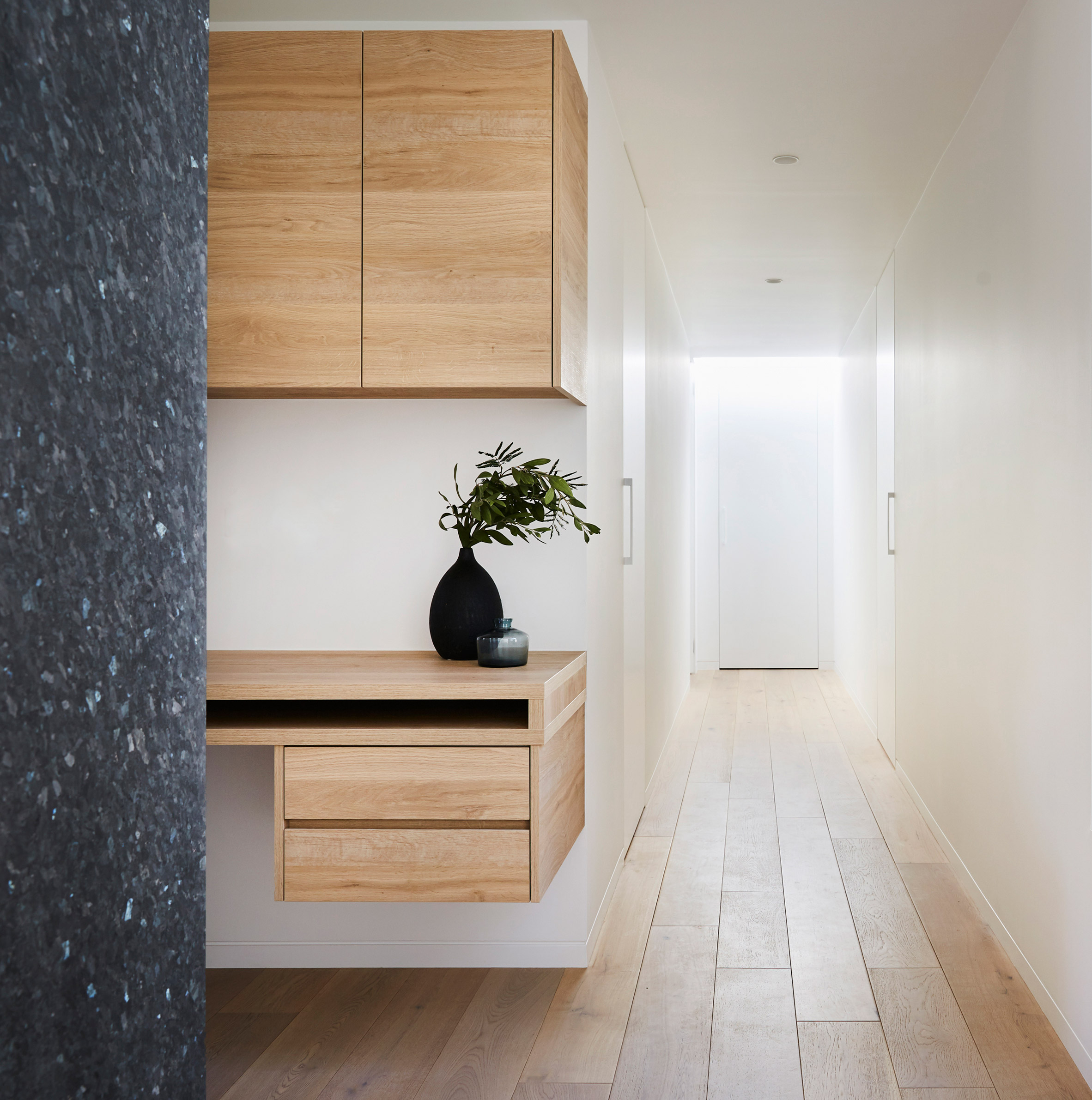 Skrzydło gościnne ma zupełnie inną skalę oraz paletę materiałów. Jego forma jest prostsza, a wnętrze bardziej kameralne, co wprowadza prywatną atmosferę. „Chcieliśmy, aby to skrzydło skupiło się na wnętrzu, a nie na otoczeniu. Jest niższe, bardziej wyciszone, ale światło i cień w tym budynku idealnie odzwierciedlają zewnętrzny krajobraz” – wyjaśnia Telha Clarke, odpowiedzialna za projekt. Kontrast w wielkości oraz materiałach podkreśla otwartość głównej przestrzeni. Przy wejściu do skrzydła gościnnego znajduje się przytulna przestrzeń do pracy z podwieszonym, drewnianym biurkiem. W niższej części budynku znajdują się dodatkowe sypialnie oraz duża łazienka.