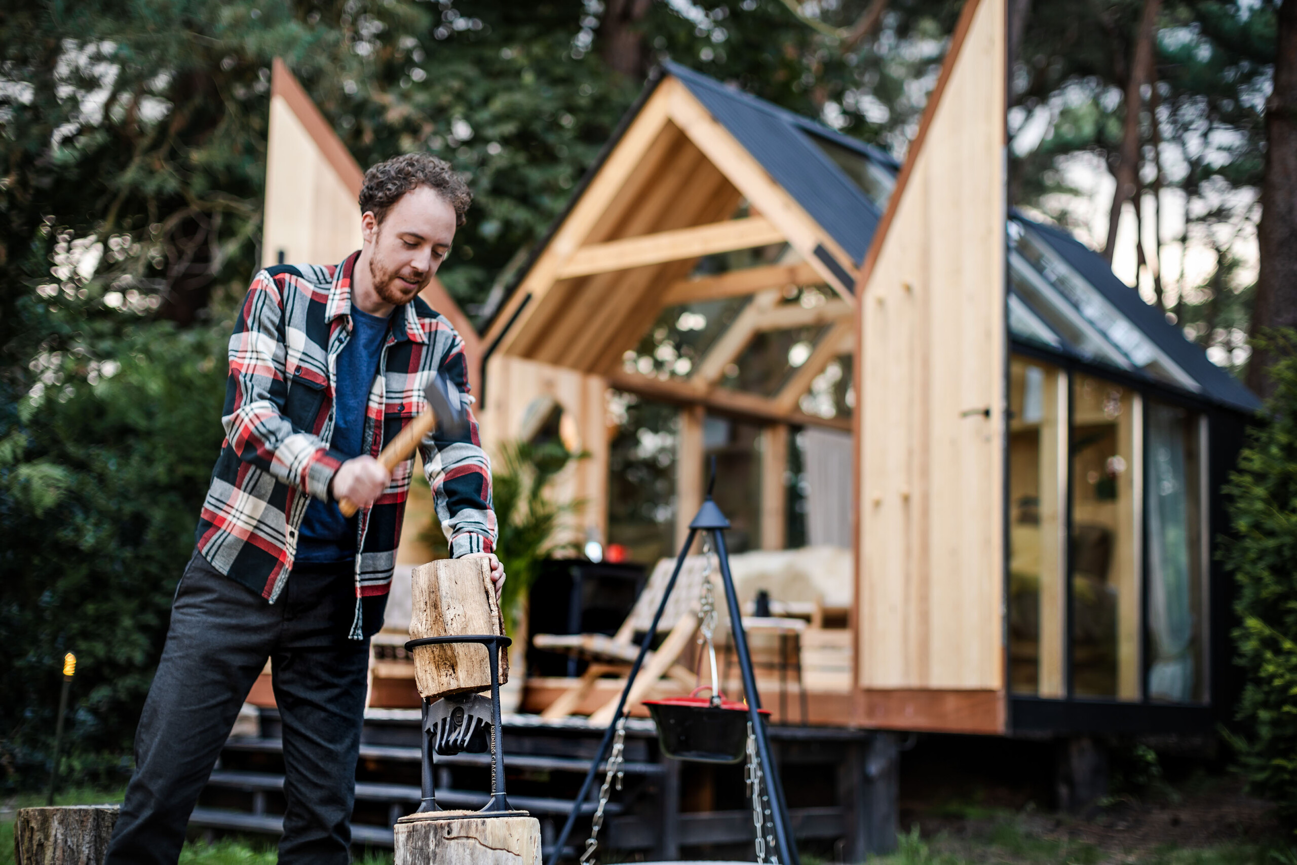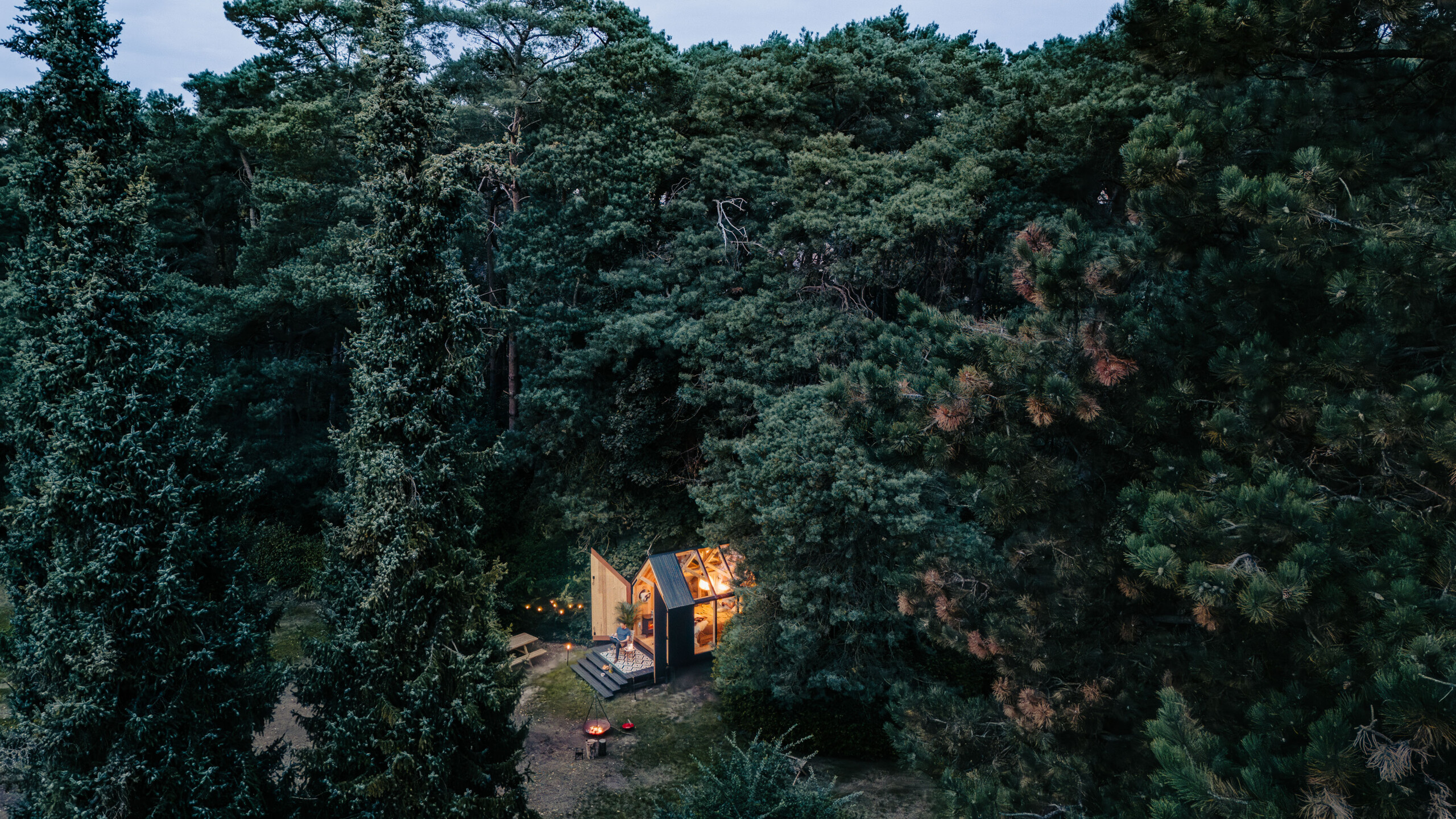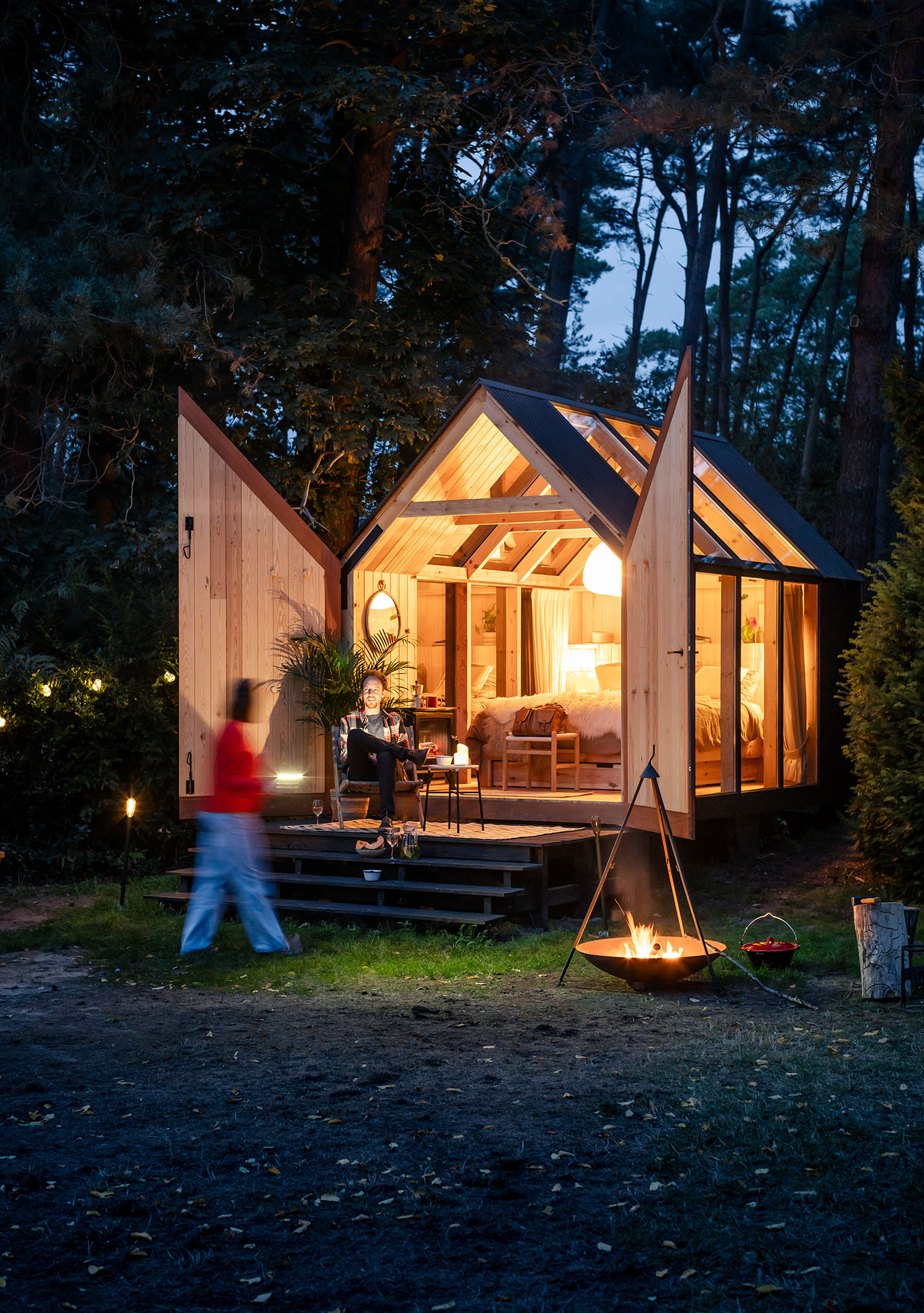 Pomimo niewielkiej skali, wnętrze oferuje wszystko, co niezbędne – wygodne łóżko, oświetlenie, ogrzewanie i wentylację. Na zewnątrz znajduje się miejsce na ognisko, które dodatkowo podkreśla wypoczynkowy, niemal biwakowy charakter tego miejsca.