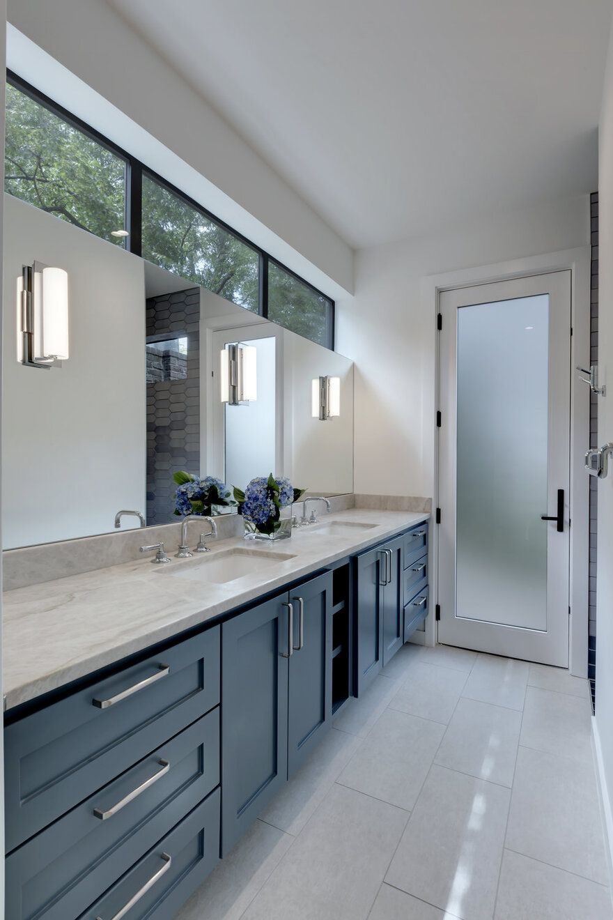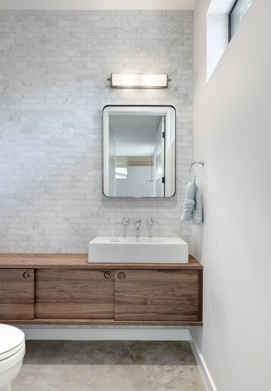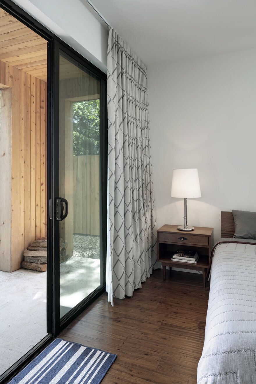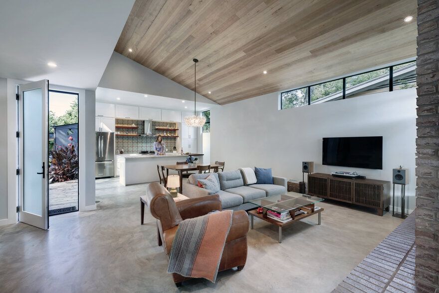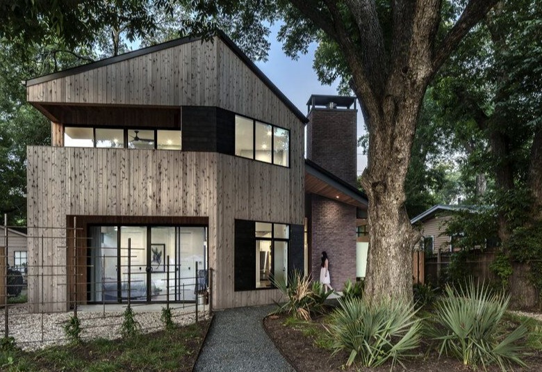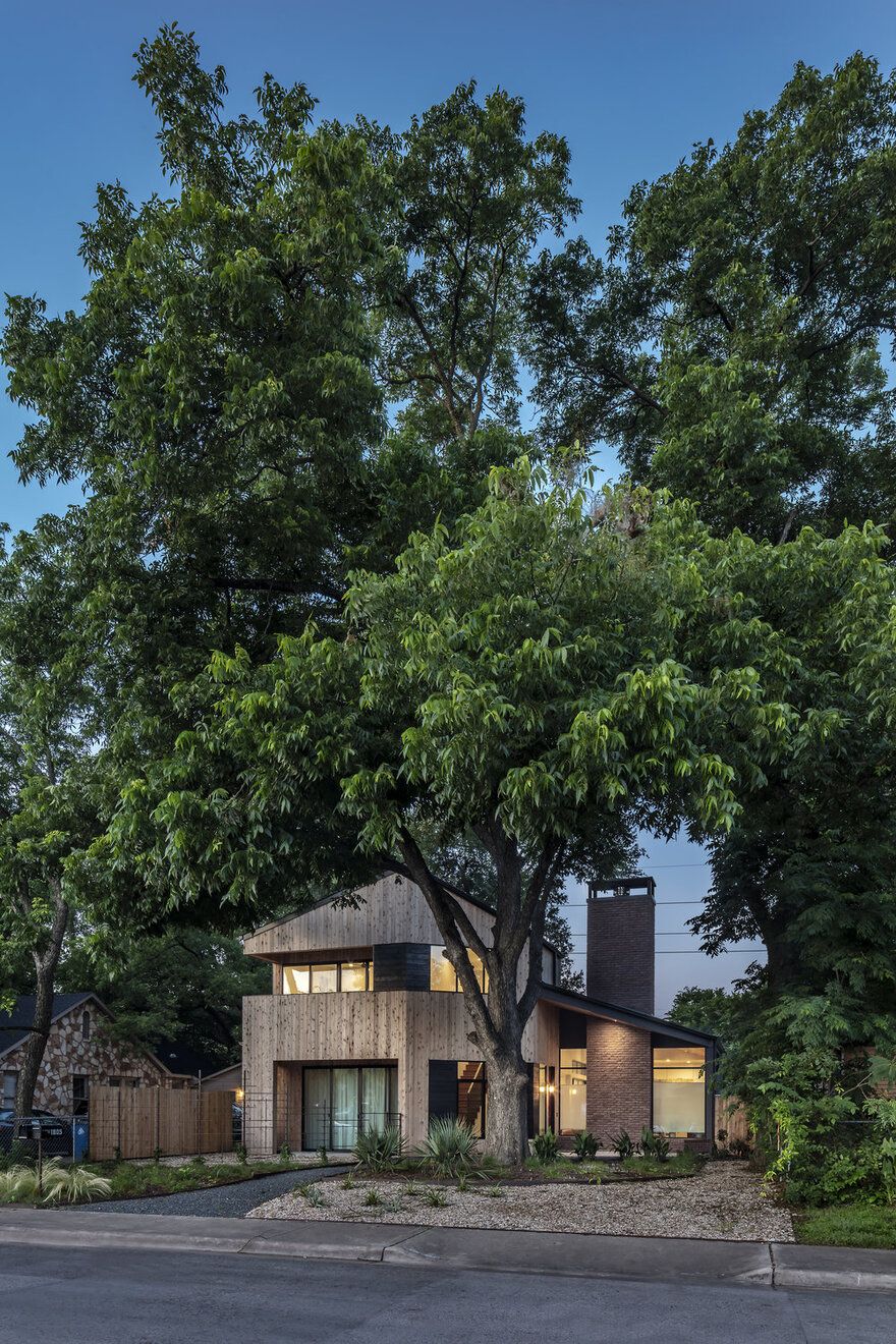 Inwestorzy marzyli o domu o ciepłej, znajomej formie, który jednocześnie dawałby im poczucie wakacyjnego luzu i bliskości natury. Punktem wyjścia stała się prosta forma drewnianej chaty z dwuspadowym dachem, drewnianą elewacją oraz wyrazistym kominkiem przypominającym palenisko. Architekci z Matt Fajkus Architecture przekształcili jednak rustykalny archetyp w nowoczesną stodołę o czystych liniach, prostych detalach i „ciosanej” bryle, lepiej wpisującej się w miejski kontekst. Geometria domu oraz jego plan zostały podporządkowane ukształtowaniu działki i istniejącym drzewom, które zapewniają naturalny cień i wzmacniają wrażenie domu ukrytego w lesie.