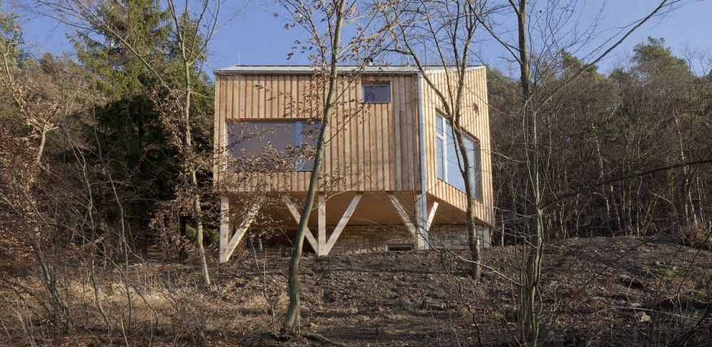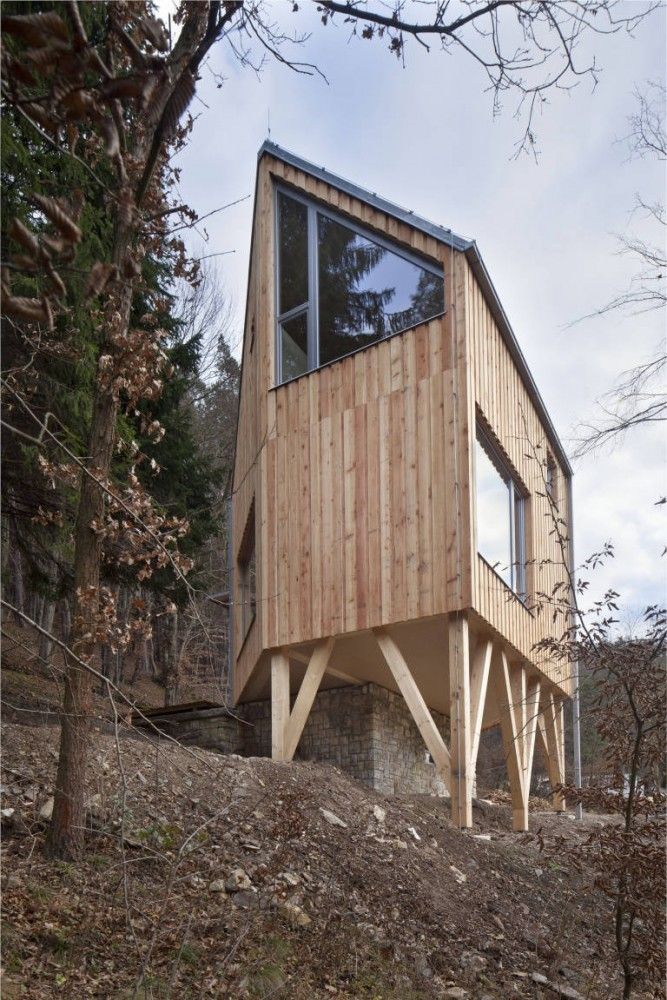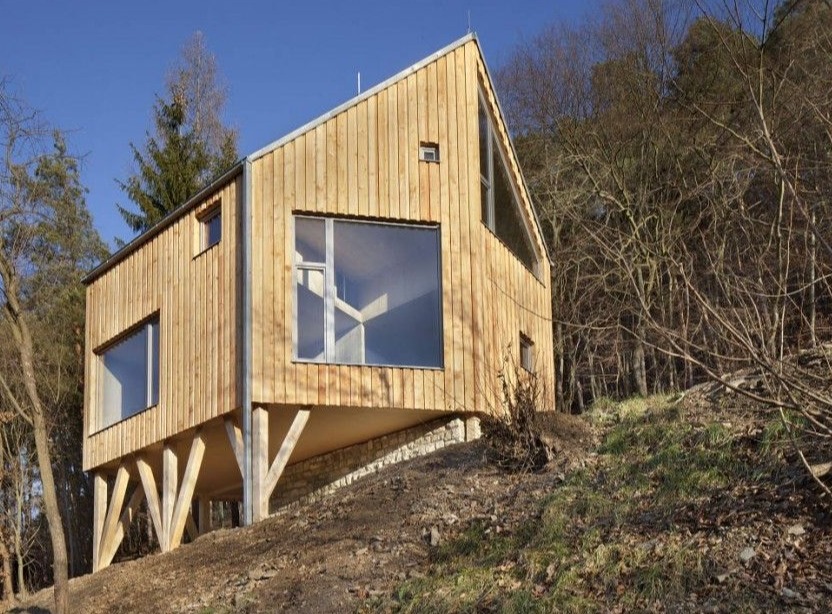 Ten niewielki, drewniany dom jednorodzinny autorstwa ALT Architecti powstał na zboczu w środkowych Czechach, w miejscu dawnego domku letniskowego z lat 50. XX wieku. Budynek zlokalizowano w strefie niebudowlanej, dlatego kluczowe było zachowanie maksymalnej powierzchni zabudowy do 50 m², co zaakceptowały lokalne władze. Architekci zaprojektowali sześciokątny dom z drewna z dwiema sypialniami, oparty częściowo na zachowanym kamiennym garażu, który pełni dziś funkcję użytkową. Konstrukcja wspiera się również na drewnianych kolumnach, tworząc zadaszoną strefę parkingową pod bryłą budynku. Całość wykonano z drewna modrzewiowego – zarówno elewację, jak i wnętrza wykończono sidingiem oraz olejowanymi panelami, co podkreśla naturalny, ekologiczny charakter inwestycji, często porównywany do idei, jaką niesie nowoczesna stodoła.