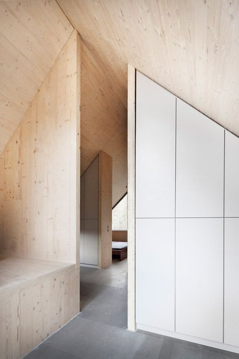 Wnętrze domu zostało zaprojektowane w sposób maksymalnie funkcjonalny mimo niewielkiej powierzchni. Na pierwszym poziomie znajduje się otwarta strefa dzienna, która okala centralny trzon z kuchnią i toaletą, a przez trójkątny szyb prowadzą metalowe, kręcone schody. Drugie piętro mieści dwie sypialnie, łazienkę, gabinet oraz niewielki, trójkątny pokój z dużym oknem, oferującym spektakularne widoki na krajobraz. Ze względu na ograniczone nasłonecznienie działki, sześciokątny rzut budynku okazał się najlepszym rozwiązaniem, zapewniającym optymalny dostęp światła od strony zachodniej oraz pełne wykorzystanie walorów otaczającej przyrody. To przykład przemyślanej architektury drewnianej, która łączy minimalizm, ekologię i nowoczesne podejście do projektowania małych domów.