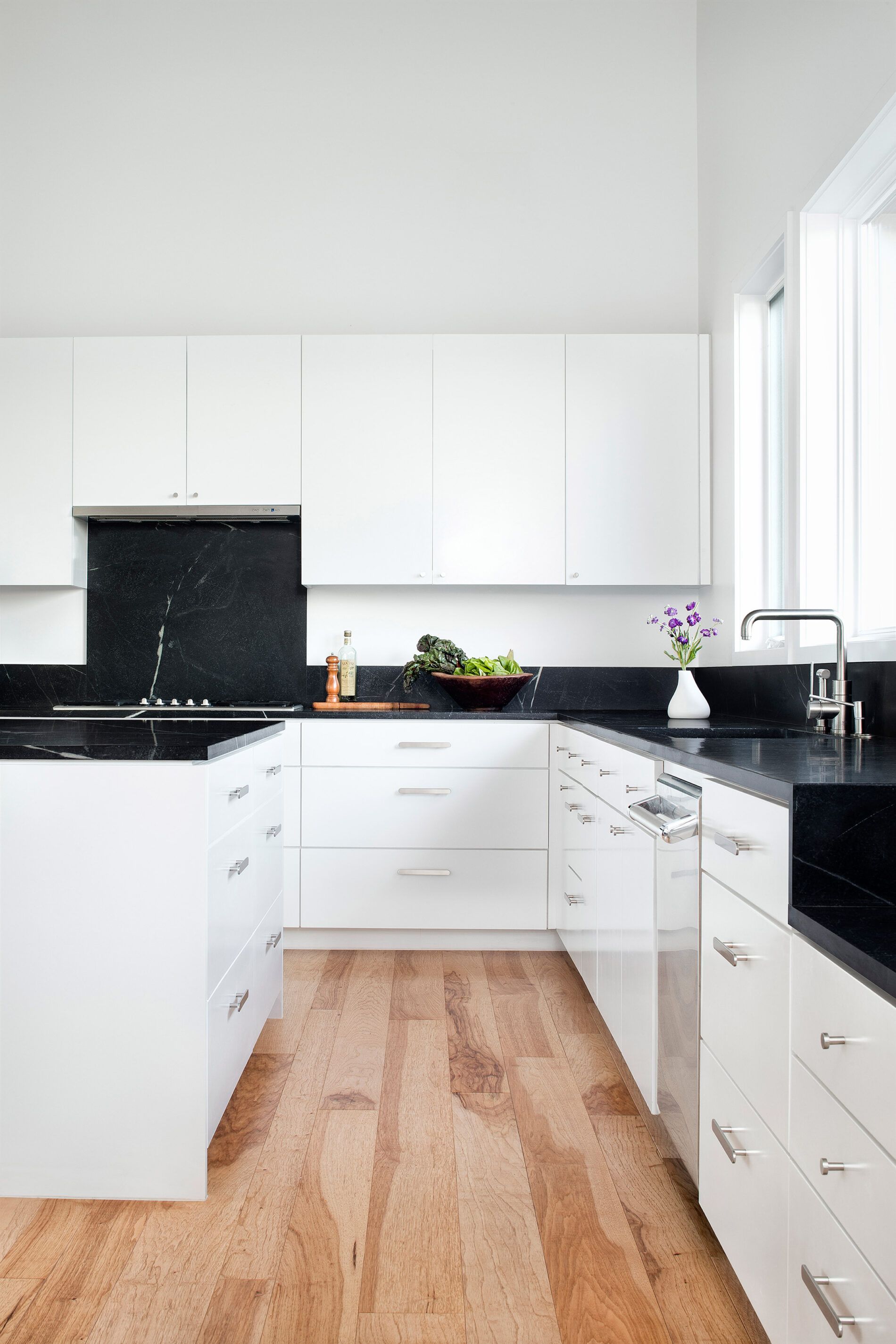 Jednopiętrowa konstrukcja o powierzchni 475 m² stoi na 19-hektarowej działce i została uniesiona na krótkich filarach, które pozwalają na przepływ wody podczas powodzi, co minimalizuje ingerencję w krajobraz łąki. Elewacje pokryto aluminiowymi panelami odpornymi na warunki atmosferyczne, a metalowy dach, wzmacniany specjalnym systemem mocowania, odzwierciedla nieregularną linię pobliskiego krajobrazu. Wnętrze nowoczesnej stodoły łączy przestrzenie prywatne i publiczne, z częścią dzienną na otwartym planie, wykończoną ciepłym drewnem leszczyny i kontrastującymi czarnymi blatami z lokalnego steatytu. Industrialny charakter domu harmonizuje z funkcjonalnością i białymi ścianami, sufitami i ramami okiennymi, tworząc spójną, nowoczesną estetykę budynku w zgodzie z naturą.