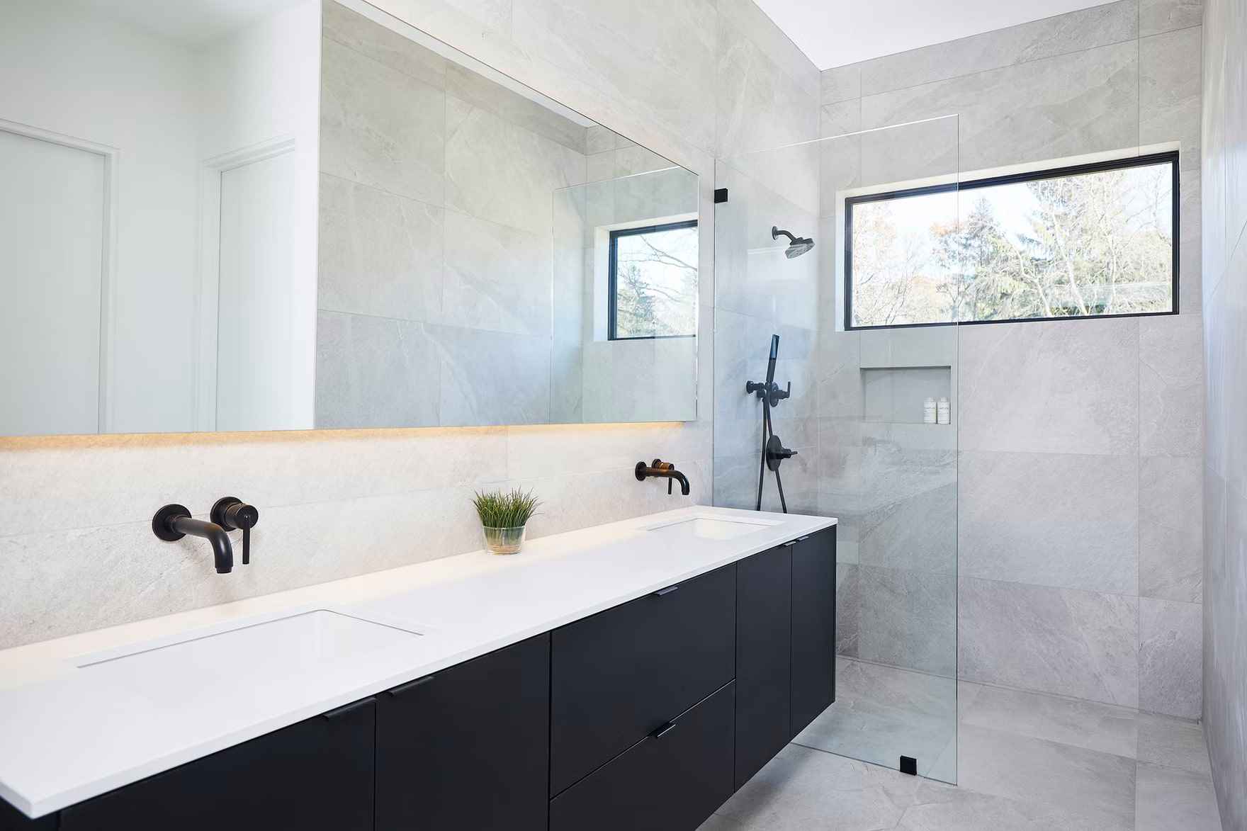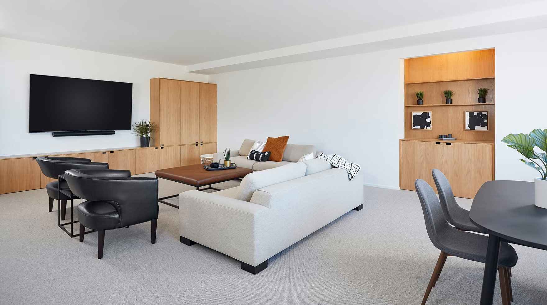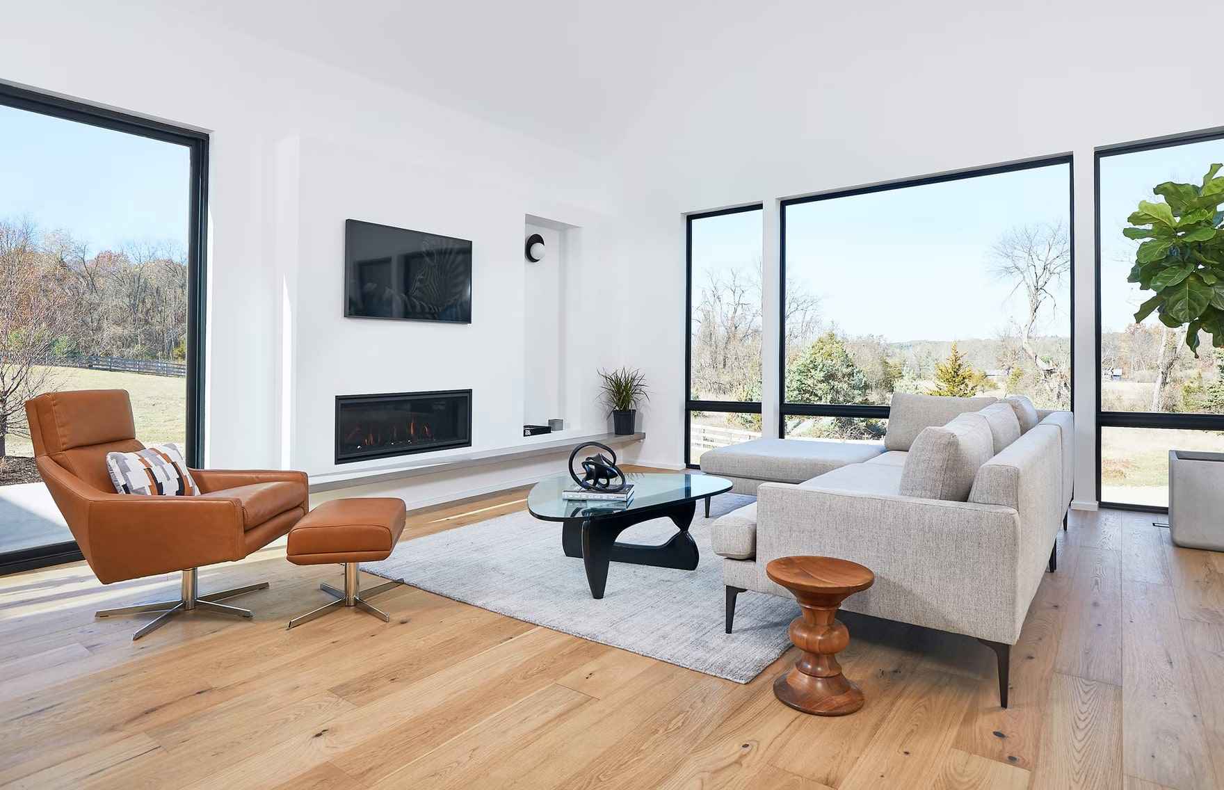 Wnętrza Hilltop Farm cechuje minimalizm, monochromatyzm i subtelne wykończenia, które podkreślają naturalny krajobraz. W każdej nowoczesnej stodole zastosowano inteligentne rozwiązania – sterowanie oświetleniem i roletami, systemy HVAC, ERV do cyrkulacji powietrza, podgrzewacze wody bez zbiornika i wbudowane głośniki sufitowe. Dbałość o wydajność i zrównoważony charakter budynków sprawia, że Hilltop Farm stanowi doskonały przykład nowoczesnej stodoły harmonijnie łączącej luksus, funkcjonalność i kontakt z naturą.