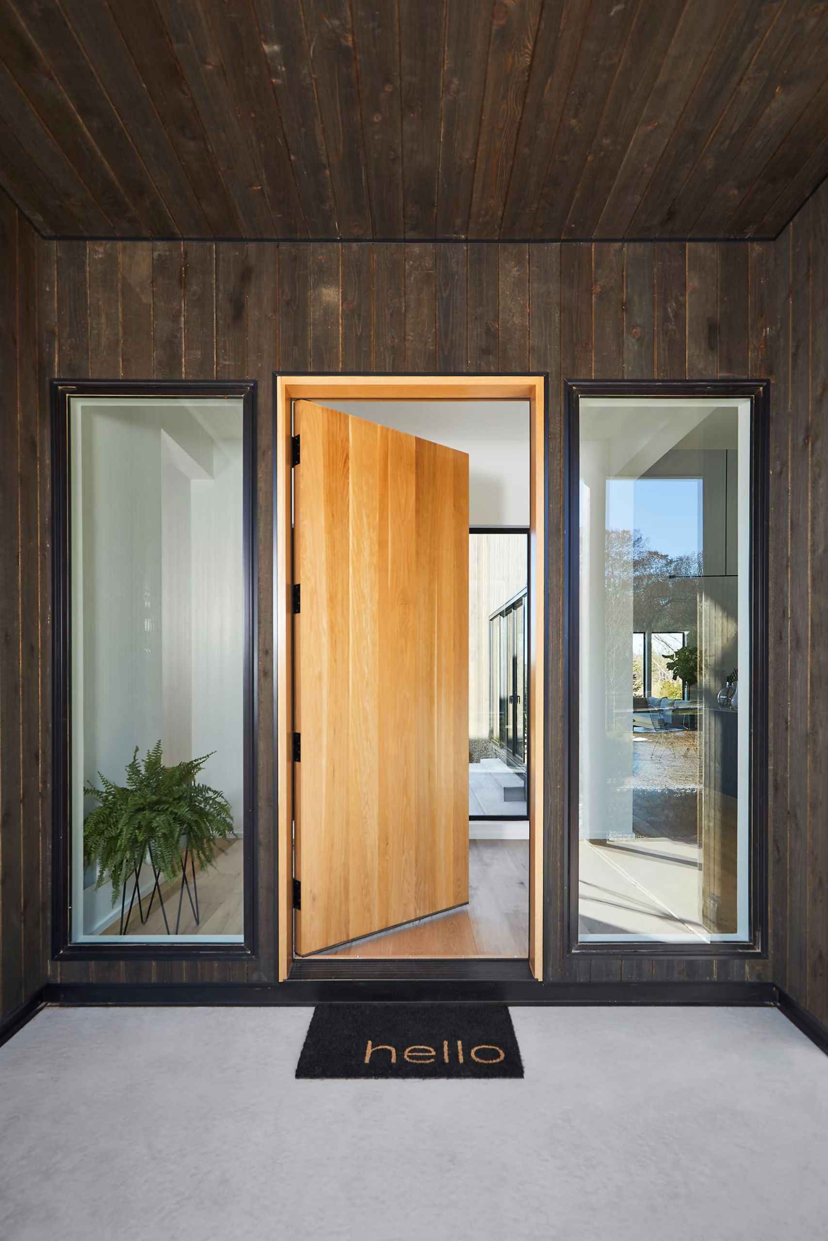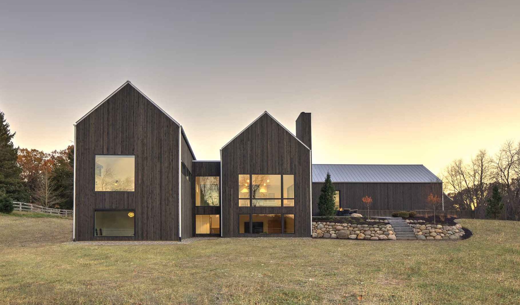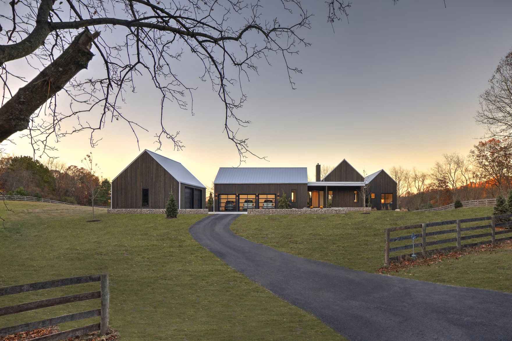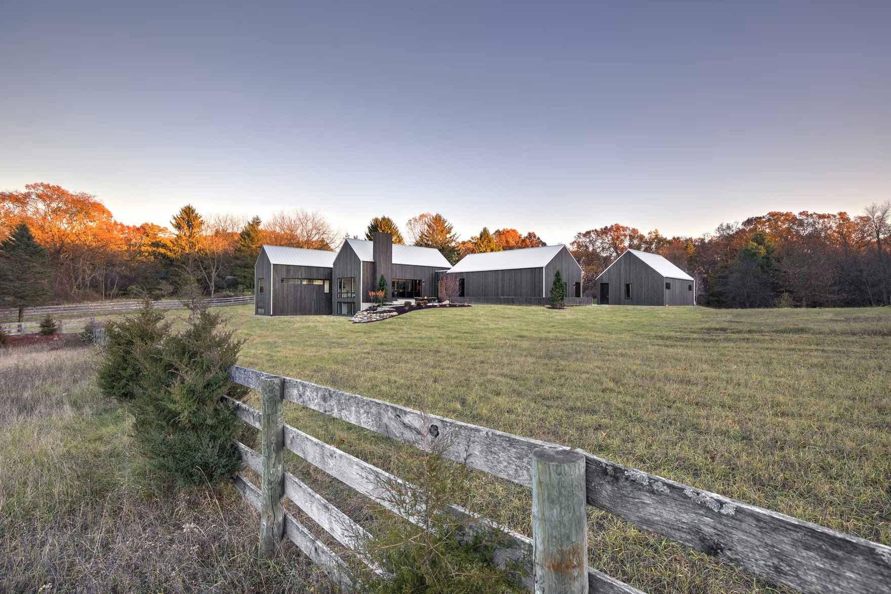 Hilltop Farm składa się z czterech budynków w formie nowoczesnej stodoły połączonych szklanymi przejściami. „The Living Barn” to Codzienna stodoła z elegancką kuchnią, jadalnią i przestronnym salonem, wypełnionym naturalnym światłem dzięki ogromnym przeszkleniom. „The Sleeping Barn” oferuje komfortowe sypialnie z prywatnymi łazienkami, natomiast „The Storage Barn” pełni funkcję przestrzeni garażowej z miejscem na trzy samochody oraz bezpośrednim dostępem do piwnicy. Ostatnia – „The Adventure Barn” – to wolnostojąca stodoła przygodowa, mieszcząca dodatkowe pomieszczenia gospodarcze i praktyczne rozwiązania przechowywania.