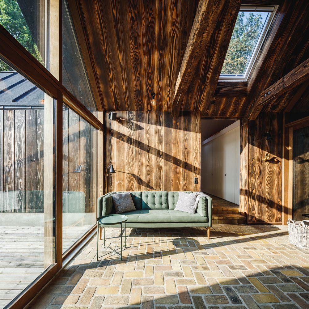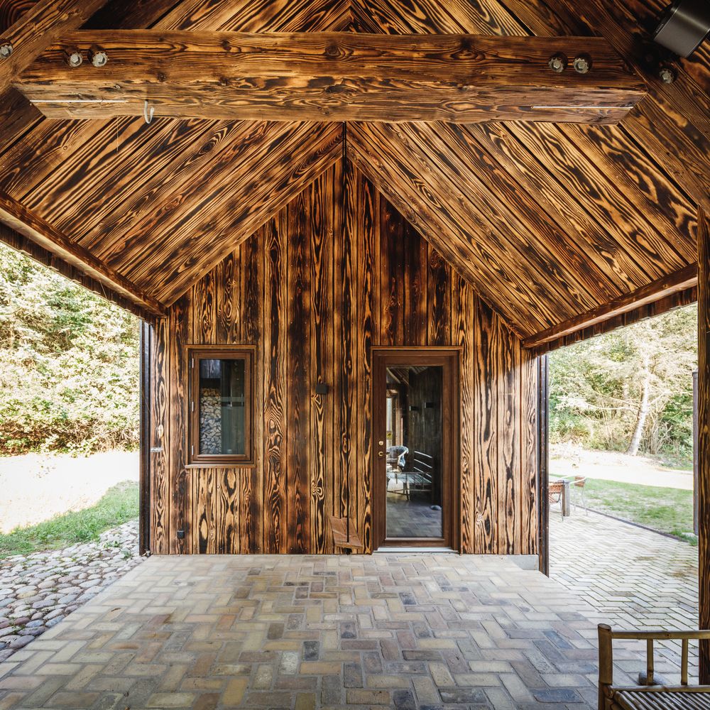 Wykorzystanie odpadów drewnianych jako materiał elewacyjny w klimacie nordyckim to nie lada wyzwanie. W tym miejscu kluczowa jest bowiem nie tylko estetyka, ale też trwałość i odporność materiałów. Firma zwraca więc ogromną uwagę na właściwe przygotowanie swoich drewnianych elementów. Stosuje technikę konserwacji drewna znaną w Japonii od 700 lat, która polega na przypalaniu powierzchni drewna. Tę samą technikę zastosowano dla desek montowanych na wybranych ścianach wewnątrz domu, choć tam powierzchnia drewna została dodatkowo wyszczotkowana i zabarwiona białym olejem, który podkreślił fakturę drewna.