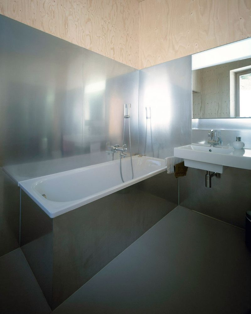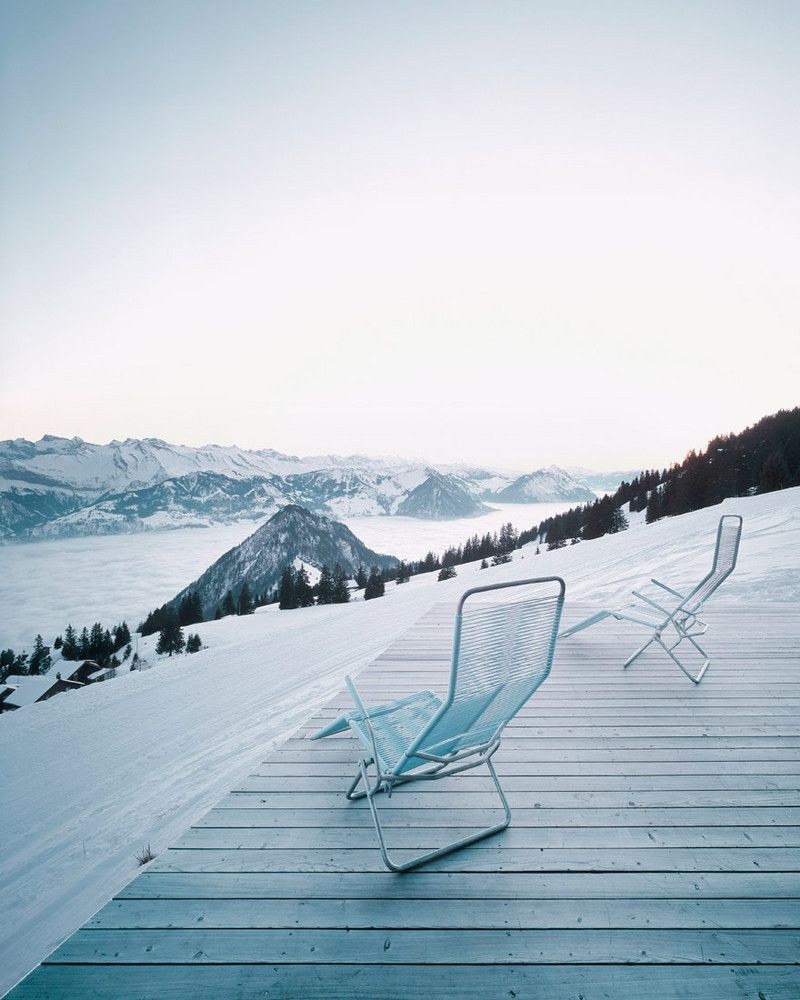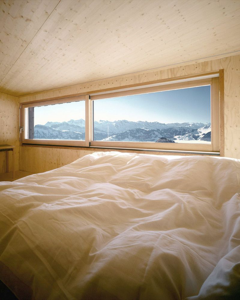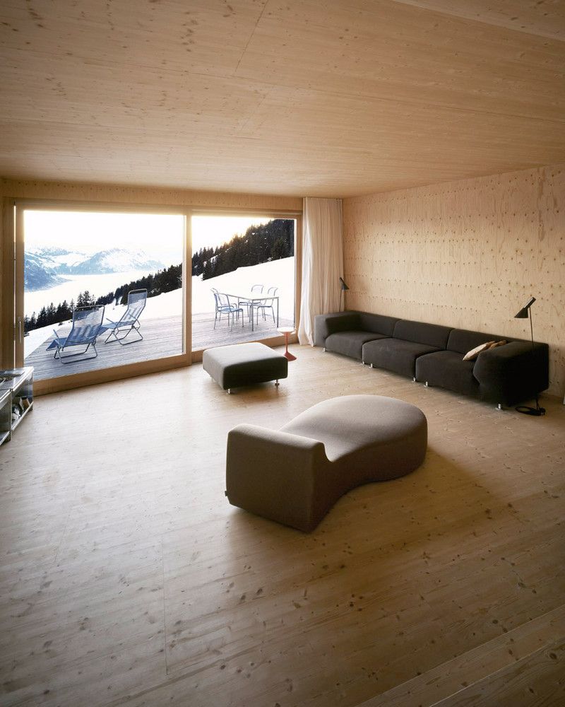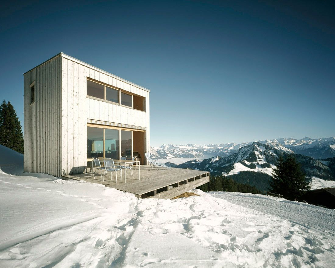 Domek wakacyjny został zrealizowany na stromym zboczu Rigi w miejscowości Scheidegg, w taki sposób, aby maksymalnie oddalić go od sąsiednich zabudowań i zachować możliwość przyszłej rozbudowy działki. Betonowa piwnica, pełniąca funkcję fundamentu i zaplecza technicznego, stabilnie zakotwicza budynek w pochyłym terenie i mieści główne wejście. Na niej osadzono lekką, drewnianą konstrukcję, która swoją dynamiczną formą przywodzi na myśl sylwetkę statku. Bryła wysunięta w kierunku wschodnim tworzy zadaszoną, osłoniętą strefę wejściową, a połączenie betonu i drewna podkreśla dialog pomiędzy architekturą a górskim krajobrazem.