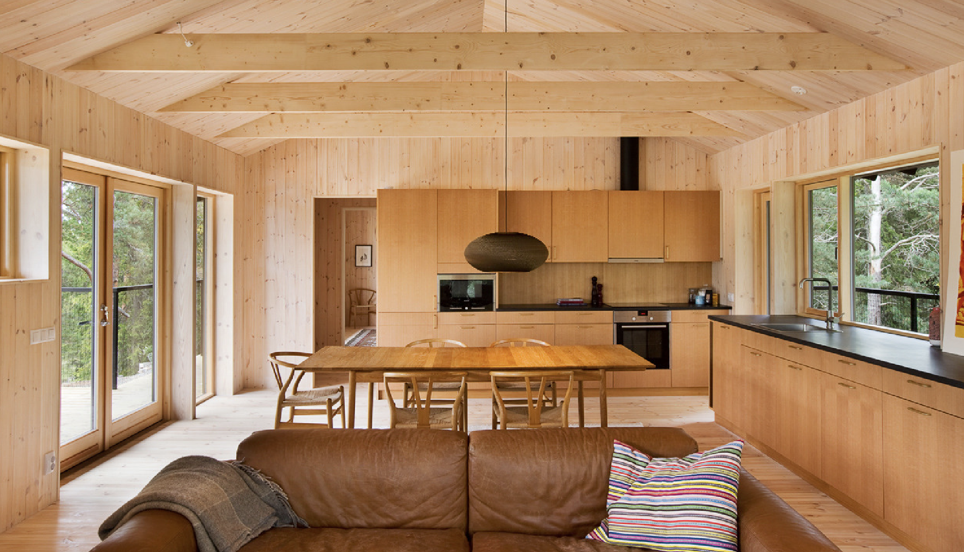 Paleta materiałowa domu jest oszczędna i głęboko zakorzeniona w lokalnych tradycjach budowlanych. Ciemna, drewniana elewacja nadaje bryle spokojny, naturalny charakter i dobrze współgra z leśnym otoczeniem. We wnętrzu drewno pokrywa ściany, sufity i podłogi, budując ciepłą, jednolitą atmosferę. Uzupełniają je drewniane meble i zabudowa kuchenna, dzięki czemu całość pozostaje bardzo spójna.