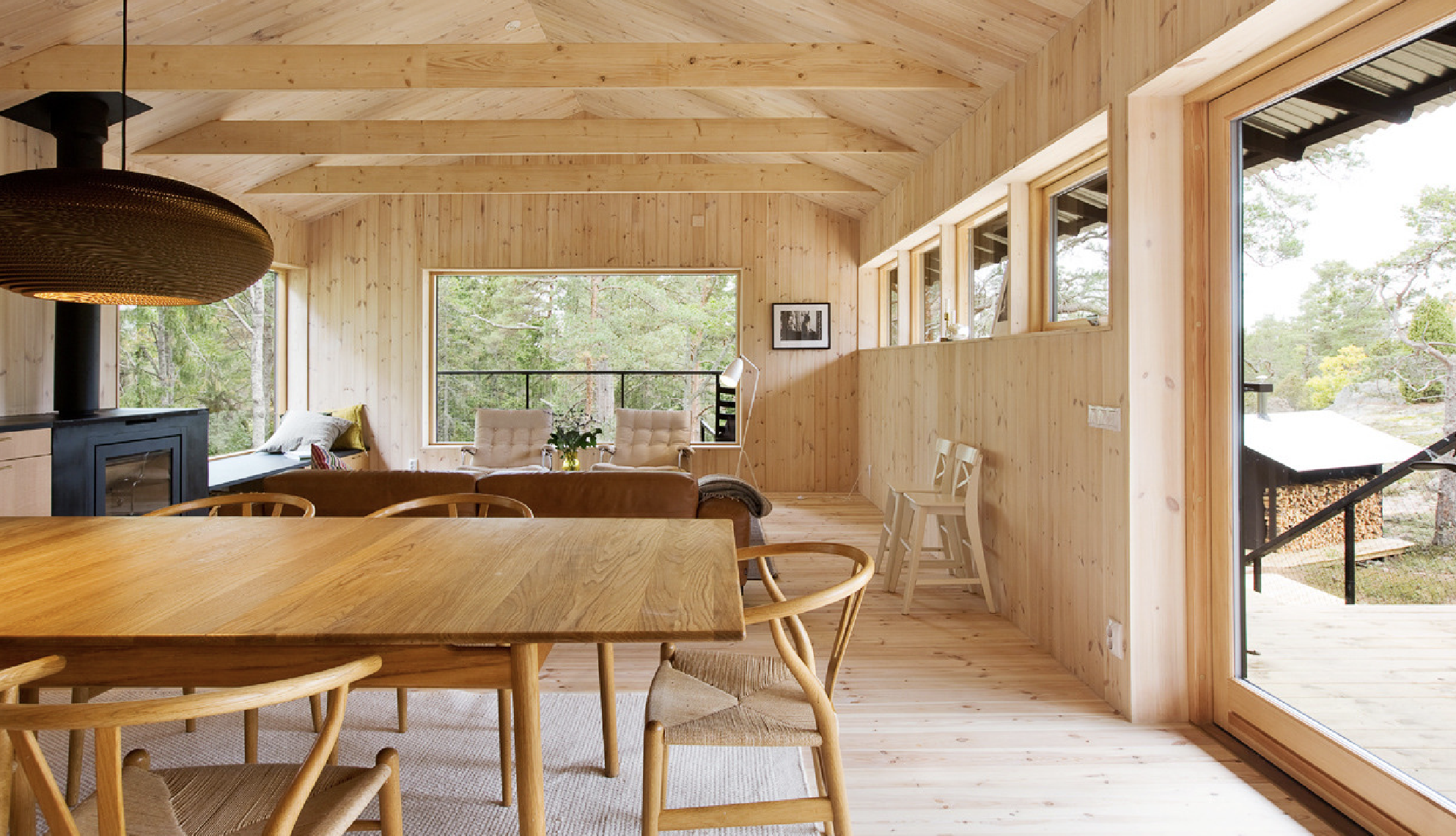 Duże okna rozmieszczono ze wszystkich czterech stron budynku, dzięki czemu każde pomieszczenie utrzymuje kontakt z niebem i otaczającym lasem. Widoki nie są tu jedynie dodatkiem, lecz podstawowym budulcem atmosfery domu. Wysokie sosny, skalne zbocza i światło archipelagu stają się równorzędnymi elementami wnętrza.