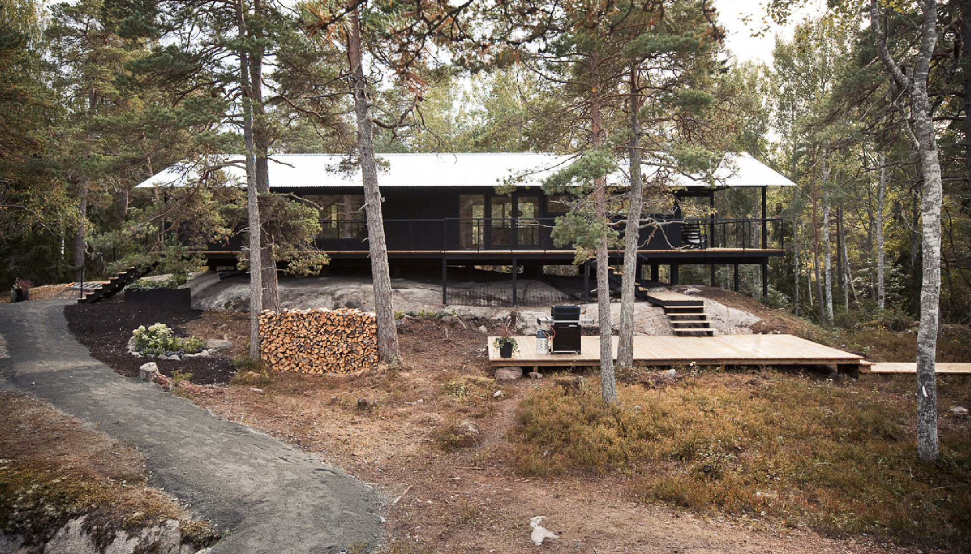 Na pierwszy rzut oka działka przypomina typowy krajobraz szwedzkiego archipelagu: granitowe skały, sosny i niską roślinność. Dopiero po chwili ujawnia się jej bardziej niezwykły charakter. Budynek został wyniesiony na czarnych betonowych plintach ponad opadający teren, dzięki czemu z wnętrz i tarasu korony drzew znajdują się niemal na wysokości wzroku. To rozwiązanie nie tylko otwiera dom na krajobraz, ale też wzmacnia wrażenie zanurzenia w lesie.