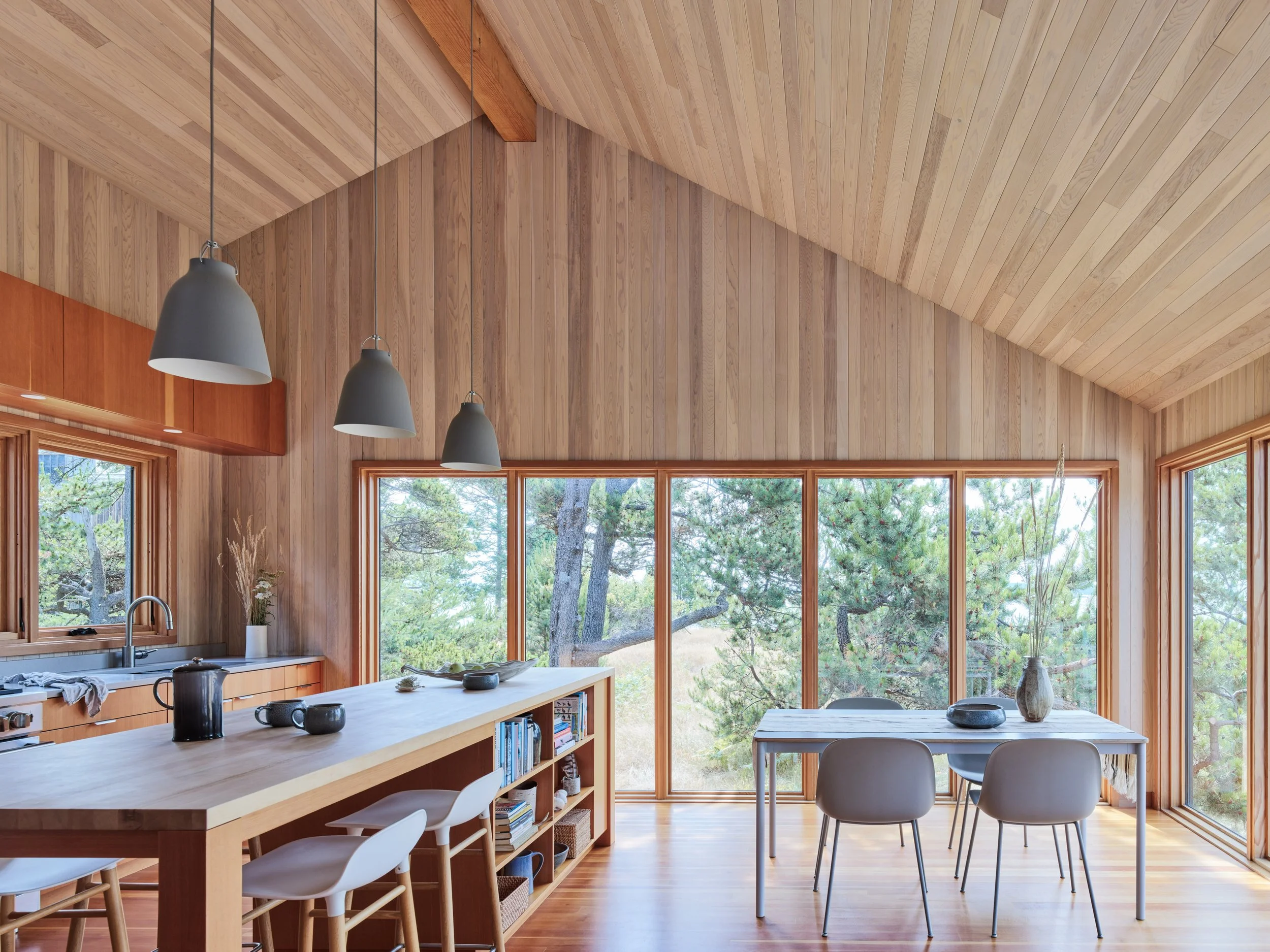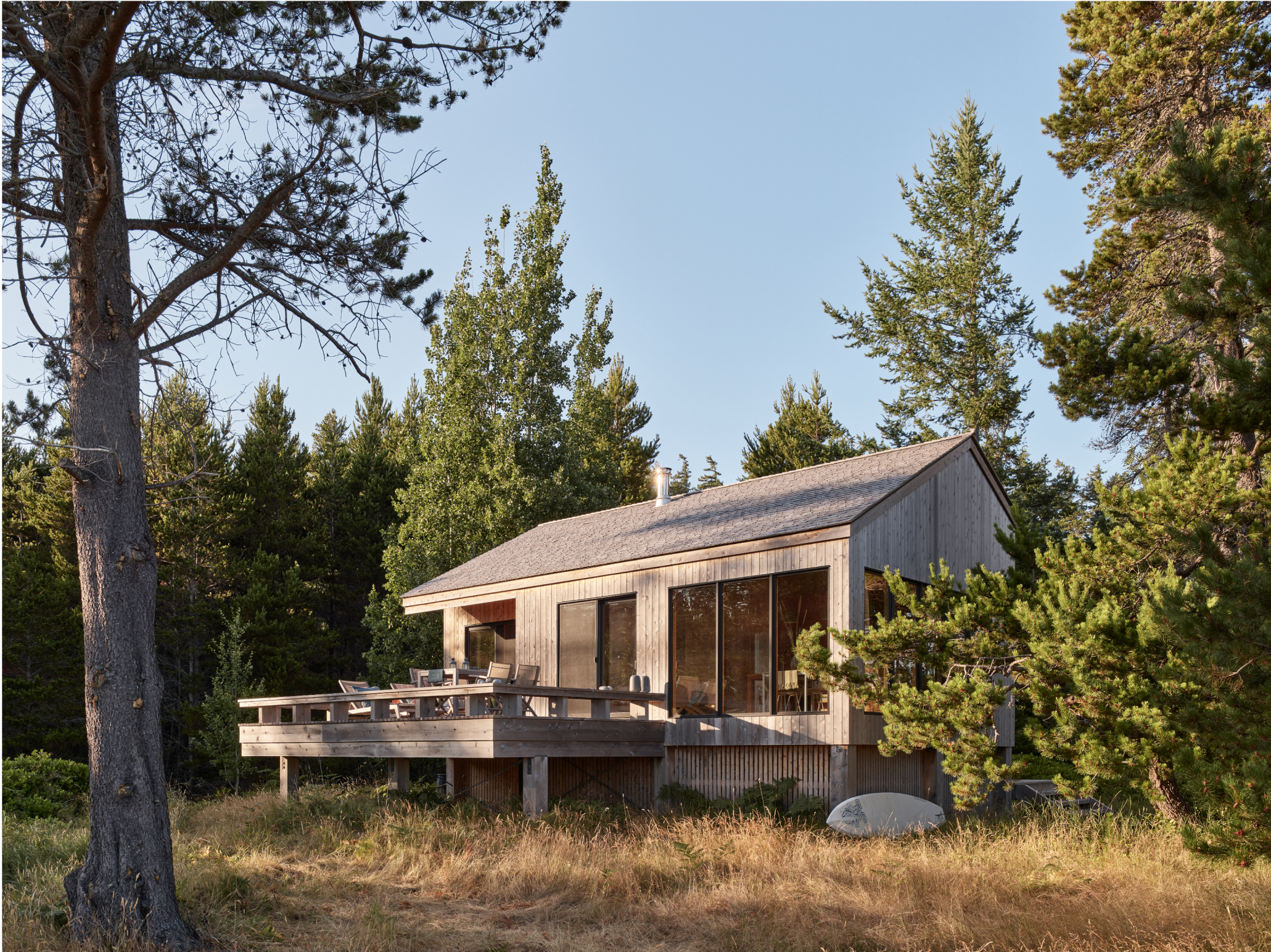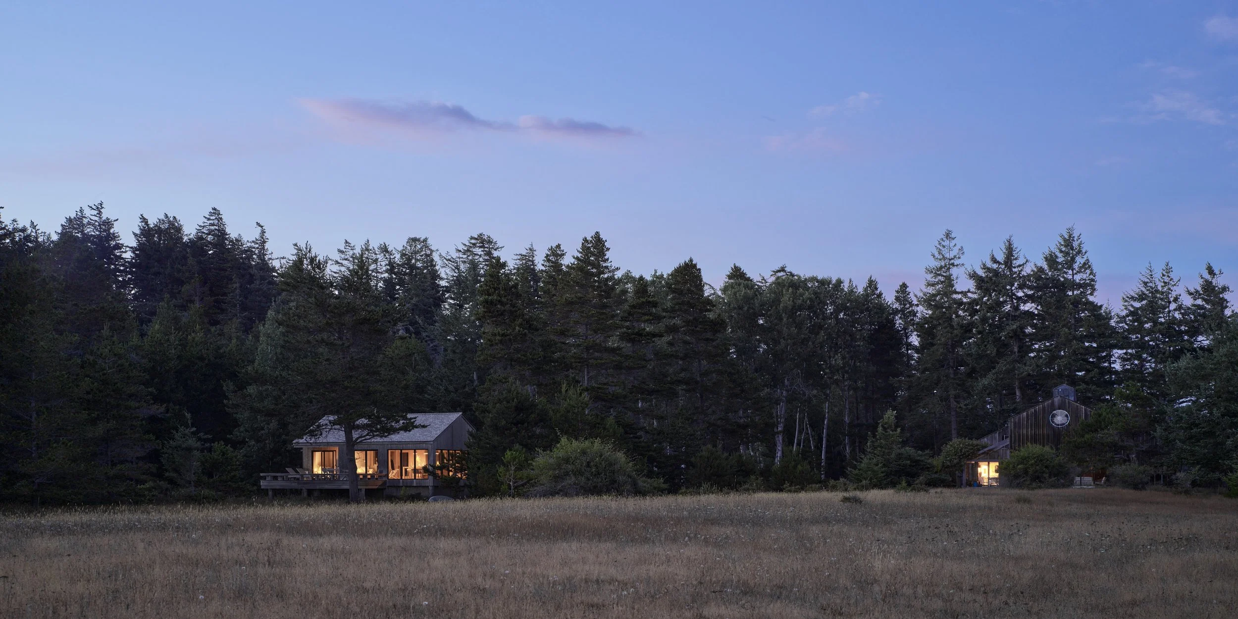 Nowy domek usytuowano przy krawędzi łąki, pod osłoną nadmorskich sosen Shore Pine. Budynek prowadzi do siebie wąską ścieżką, a jego położenie pozwala otworzyć wnętrze na rozległe widoki na łąkę, morze i wyspy rozświetlane zachodzącym słońcem. Architektura nie dominuje krajobrazu, lecz niemal wtula się w jego skraj.