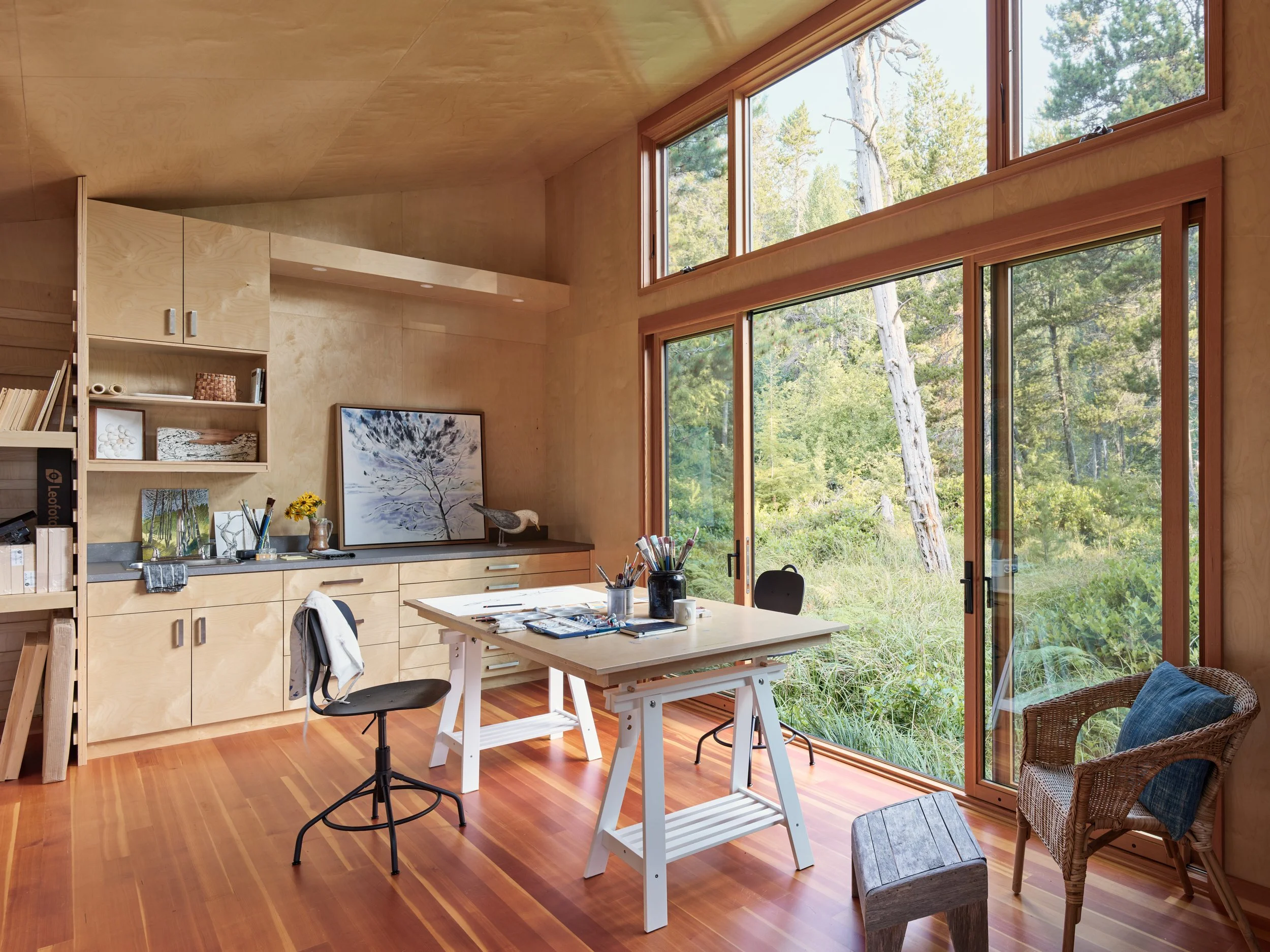 Budynek został skierowany na północ, aby do wnętrza wpadało miękkie, równomierne światło idealne do pracy artystycznej. Duże przeszklenia i przesuwne drzwi pozwalają otworzyć pracownię bezpośrednio na otoczenie, dzięki czemu malarka może pracować niemal plenerowo, nie rezygnując z komfortu wnętrza.