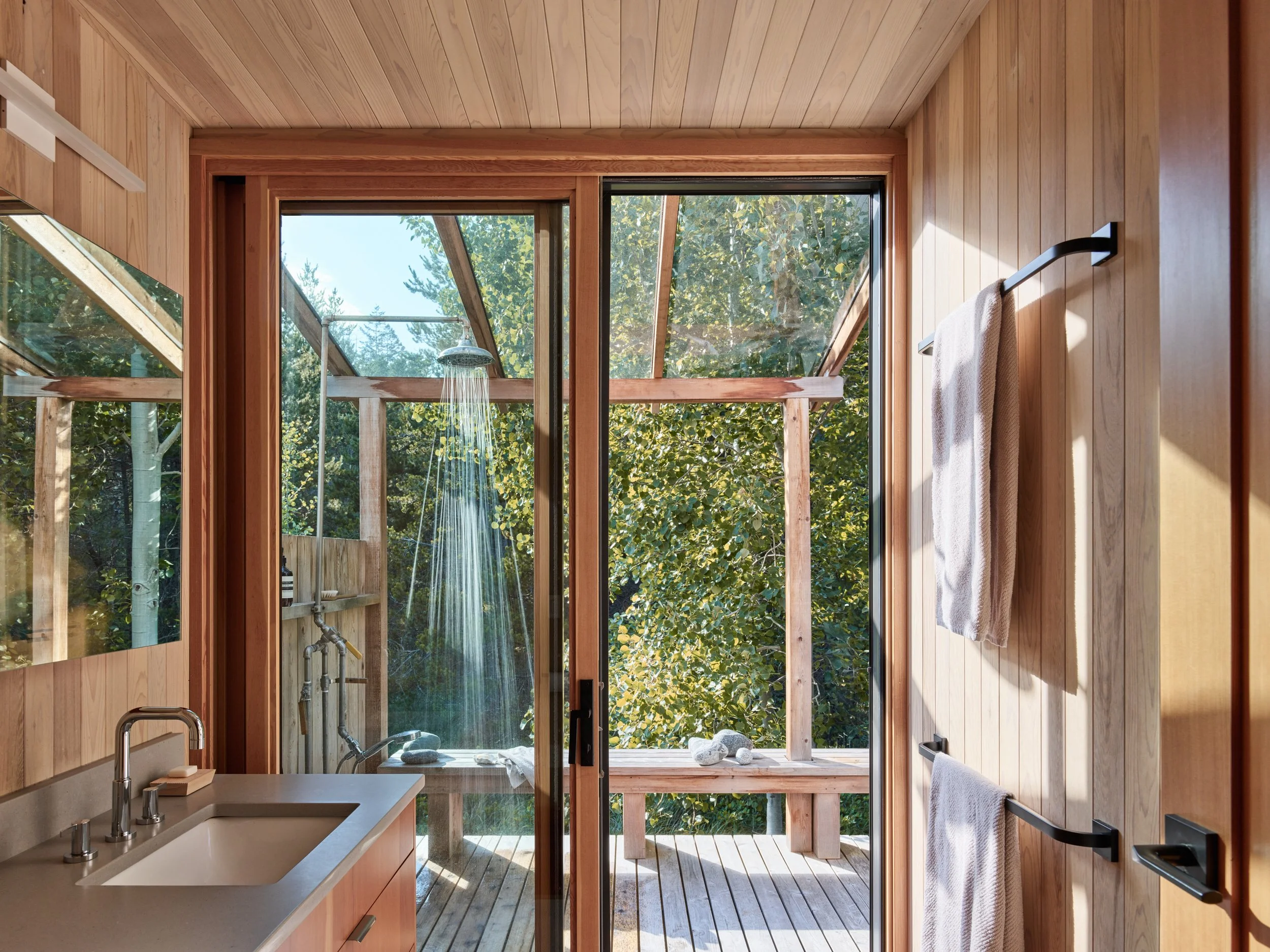 Pełnowysokie przeszklenia wciągają widok łąki głęboko do wnętrza, a duże przesuwne drzwi prowadzą do prywatnego prysznica zewnętrznego osłoniętego szklanym daszkiem. Dzięki temu codzienne rytuały zostają powiązane z naturą i klimatem wyspy.