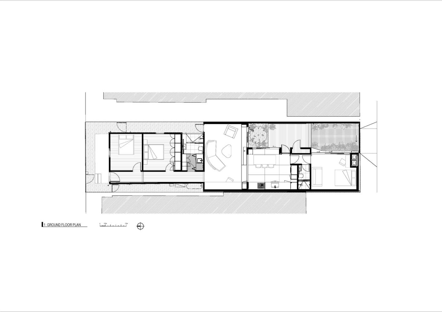 Nowoczesna forma budynku zainspirowana została kształtem stodoły – wydłużona bryła umożliwia czytelny podział funkcji, zachowując jednocześnie spójność kompozycyjną. Strefa dzienna, sypialnie, oraz obszar gościnny łączą się poprzez kuchnię, która stanowi rdzeń domu. Kontrastujące materiały, takie jak surowe drewno, beton oraz gumowa sklejka w cętki, wzmacniają wizualne i funkcjonalne granice pomiędzy poszczególnymi strefami. Projekt architektoniczny skupia się na świetle – jego obecność definiuje atmosferę i dynamikę wnętrza. Kompresja i ekspansja objętości tworzy dramaturgię przestrzeni, a kontrolowane przejścia pomiędzy pomieszczeniami pobudzają zmysły mieszkańców i odwiedzających. Kolor pojawia się subtelnie, jako tło dla kolekcji sztuki klienta.