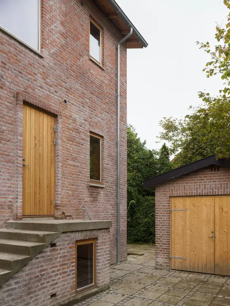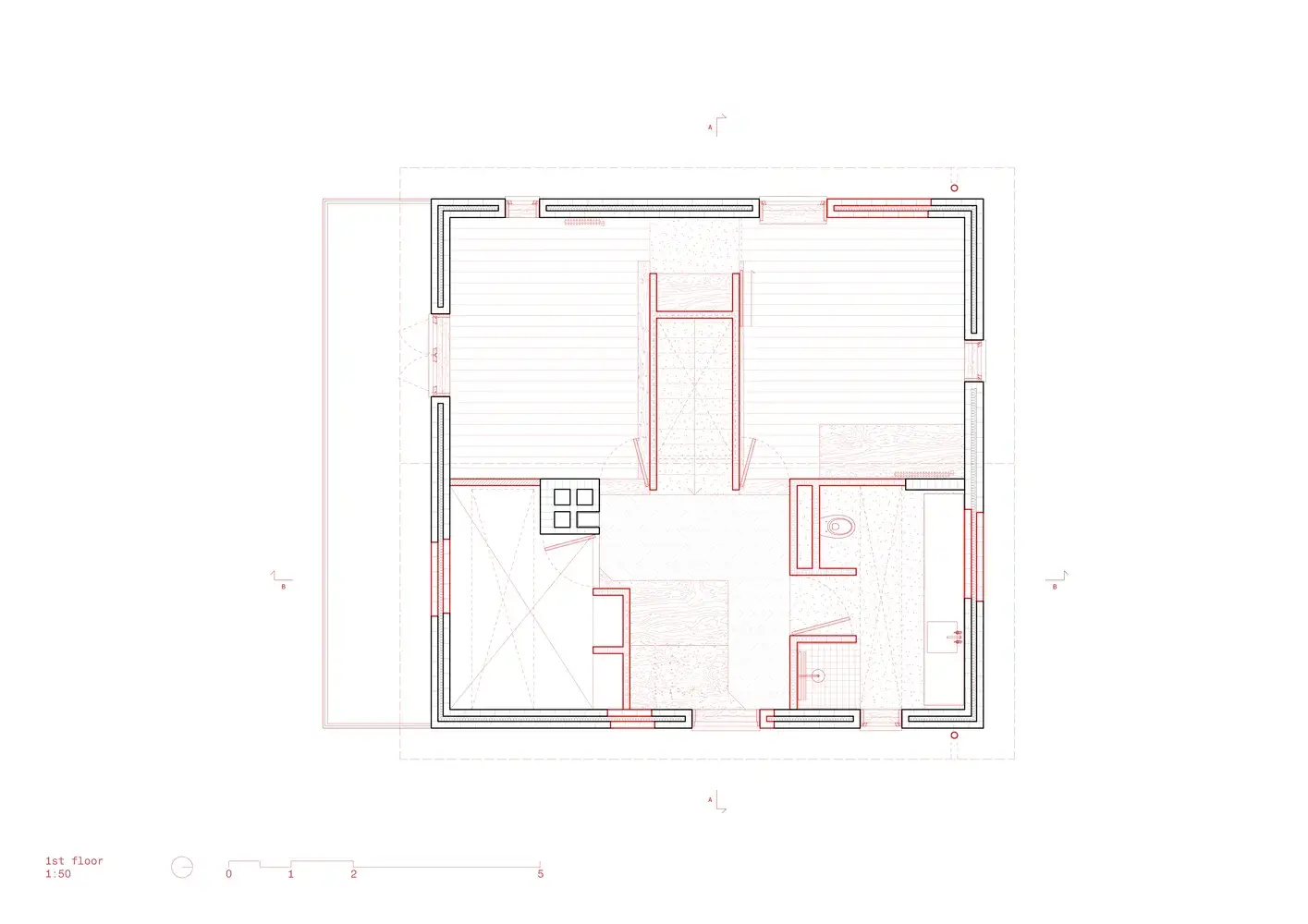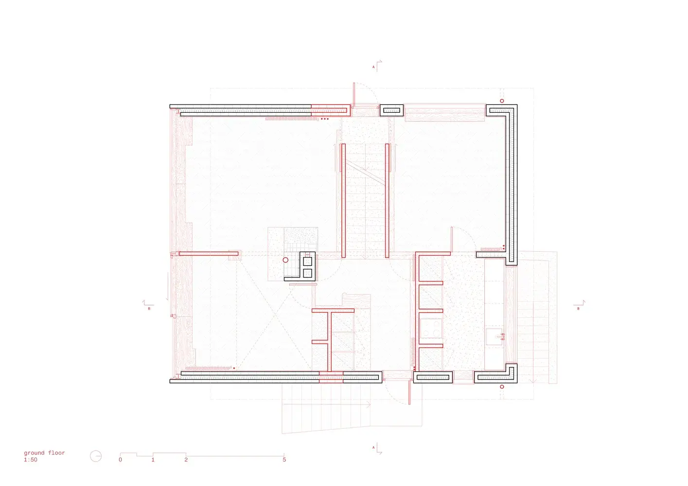 Dom jednorodzinny z cegły, wybudowany w 1951 roku, był uosobieniem powojennego stylu mieszkaniowego. Dwupiętrowa sześcienna bryła z równomiernie rozmieszczonymi oknami, fasadą z czerwonej cegły i dwuspadowym dachem. Pomimo solidności strukturalnej, jego zdolność dostosowywania się do stale zmieniających się sposobów życia była ograniczona. Na wczesnych etapach procesu wprowadzono trzy ułożone obok siebie rdzenie murowe zawierające istotne elementy domu – magazyn, schody i rurociągi. Pomiędzy nimi wyłaniają się resztkowe przestrzenie, nie ograniczone ścianami. Funkcjonują jako płynne byty, które można zamieszkiwać na różne sposoby.