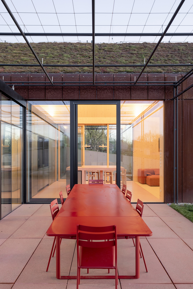 Układ domu został zorganizowany w dwóch kontrastujących ze sobą wolumenach. Strefy dzienne znalazły się w wyższej części budynku o archetypicznej formie z dwuspadowym dachem. To tutaj mieści się przestronny salon, jadalnia i kuchnia, otwarte na krajobraz dzięki panoramicznym przeszkleniom. Część nocna została natomiast umieszczona w niższej, horyzontalnej bryle wtapiającej się w zbocze. Rozmieszczenie obu części na osiach ortogonalnych pozwala każdemu pomieszczeniu uchwycić inne widoki i tworzy przemyślaną kompozycję przestrzenną.