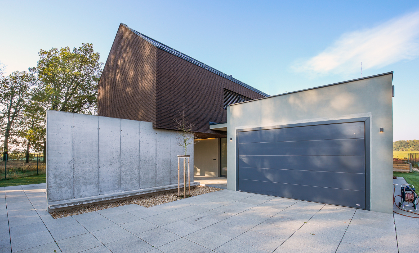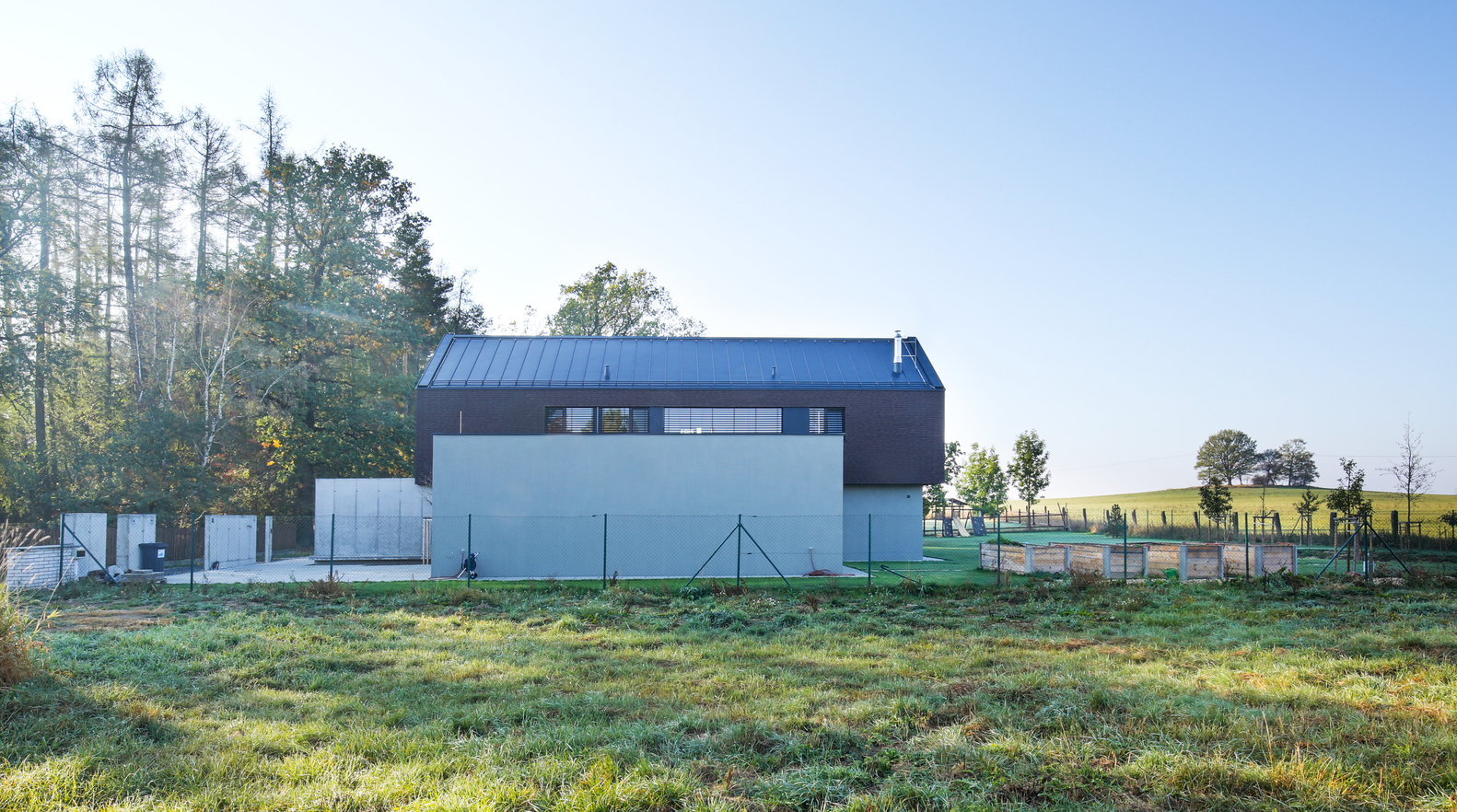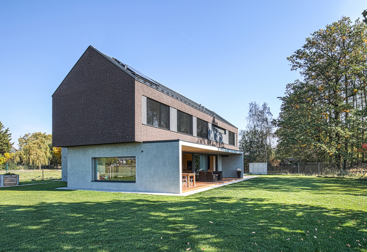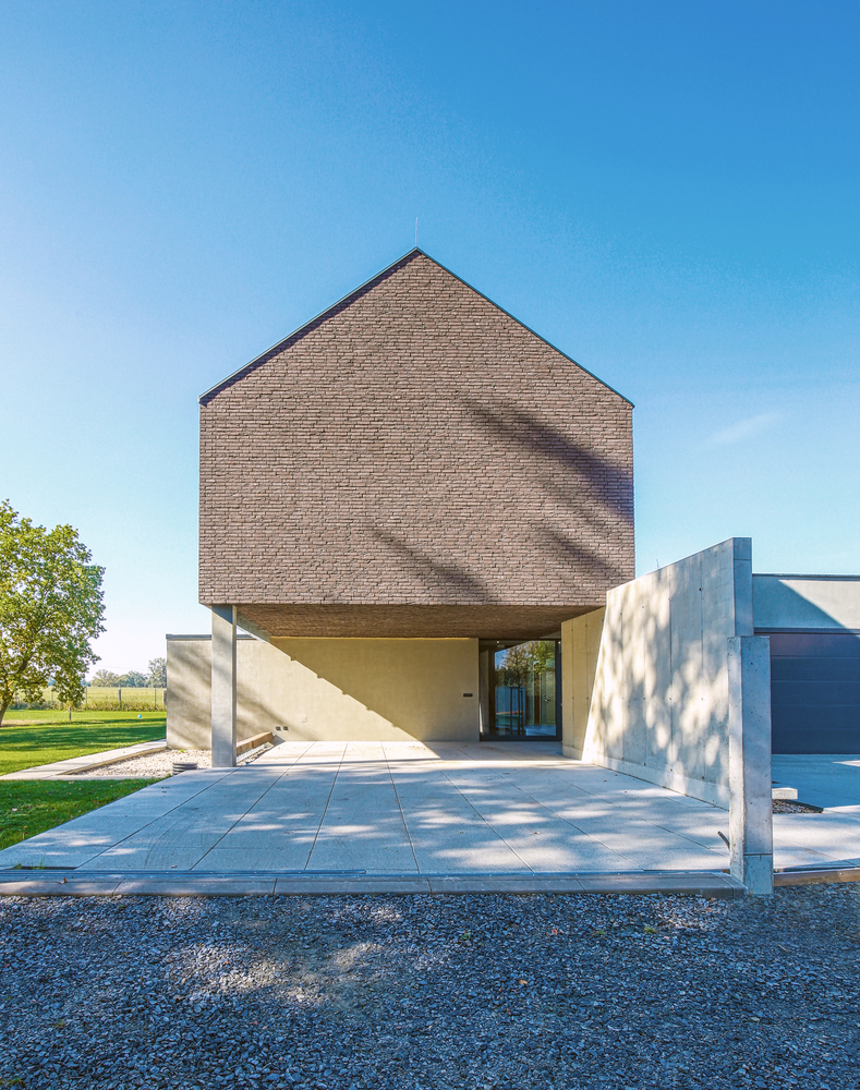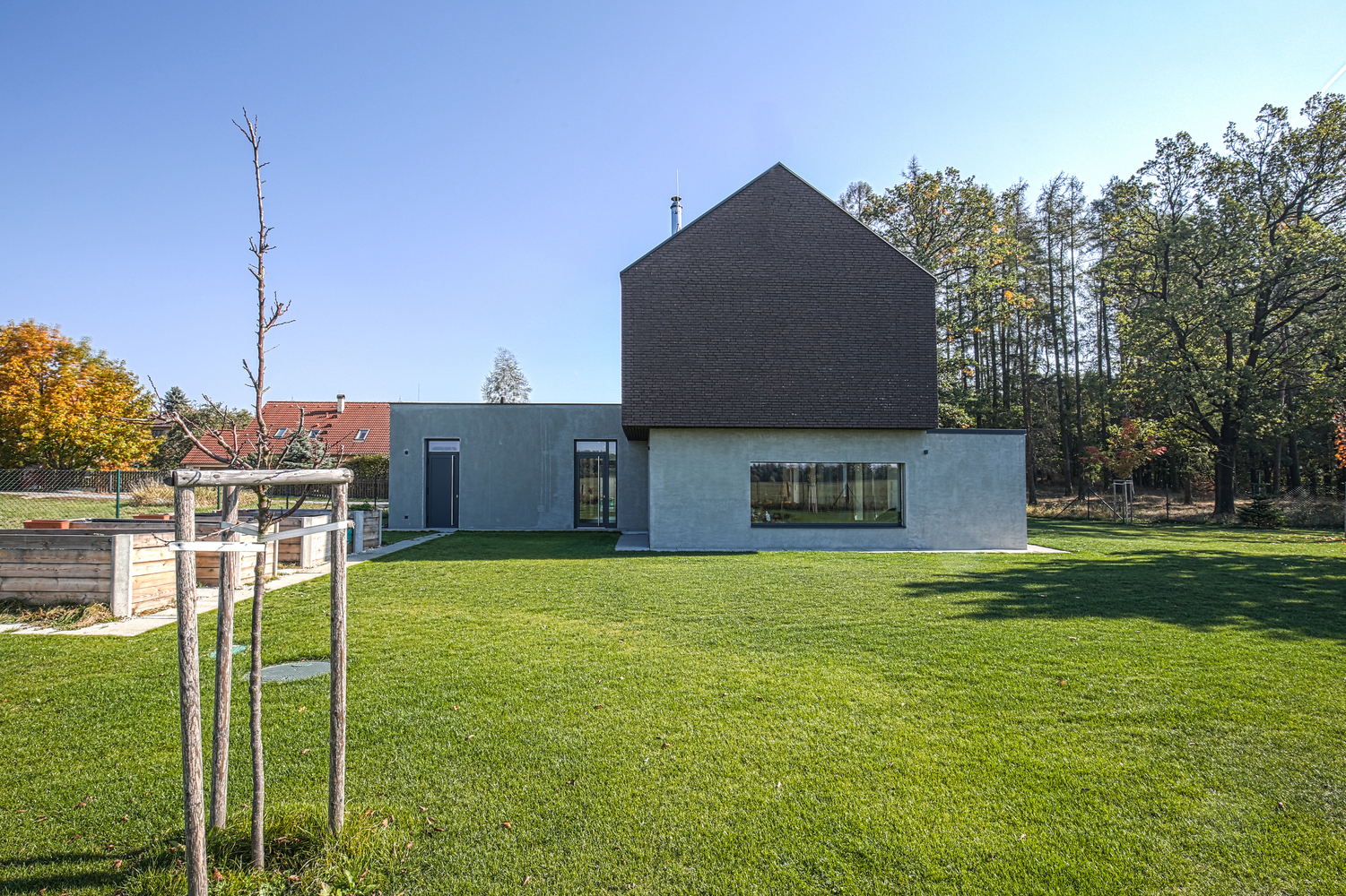 Forma budynku nawiązuje do archetypu wiejskiego domu. Prosta, czytelna bryła z dwuspadowym dachem została zbudowana z cegły i uzupełniona nowoczesnymi rozwiązaniami konstrukcyjnymi. To połączenie tradycyjnej formy z współczesnym detalem sprawia, że dom jest jednocześnie znajomy i świeży.