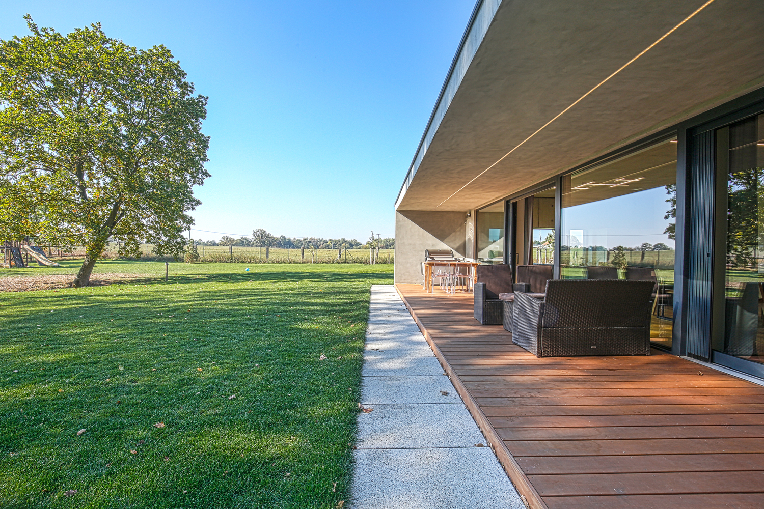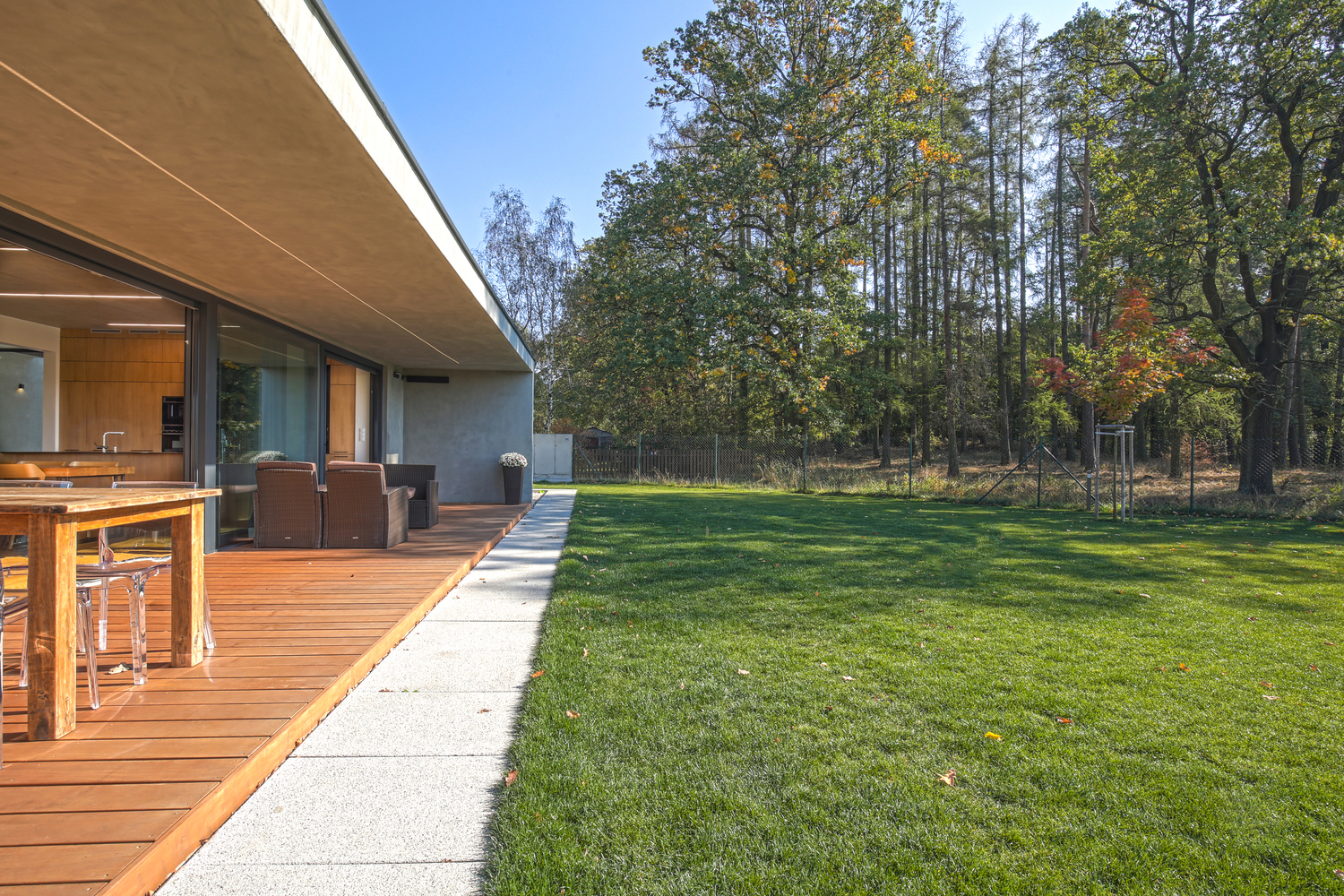 Najważniejszym założeniem projektu była relacja z otoczeniem. Budynek został osadzony w krajobrazie w taki sposób, aby maksymalnie otworzyć się na widoki i jednocześnie zachować intymność. Dom stoi na betonowej podstawie, która z jednej strony otwiera się na panoramę, tworząc naturalne przedłużenie przestrzeni mieszkalnej.
