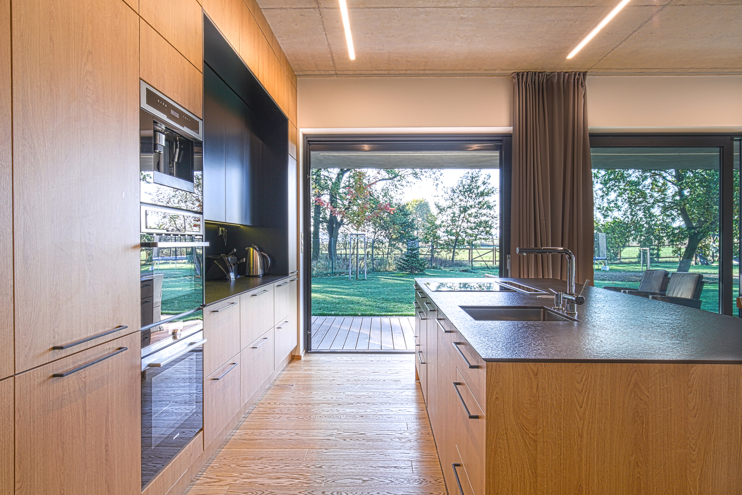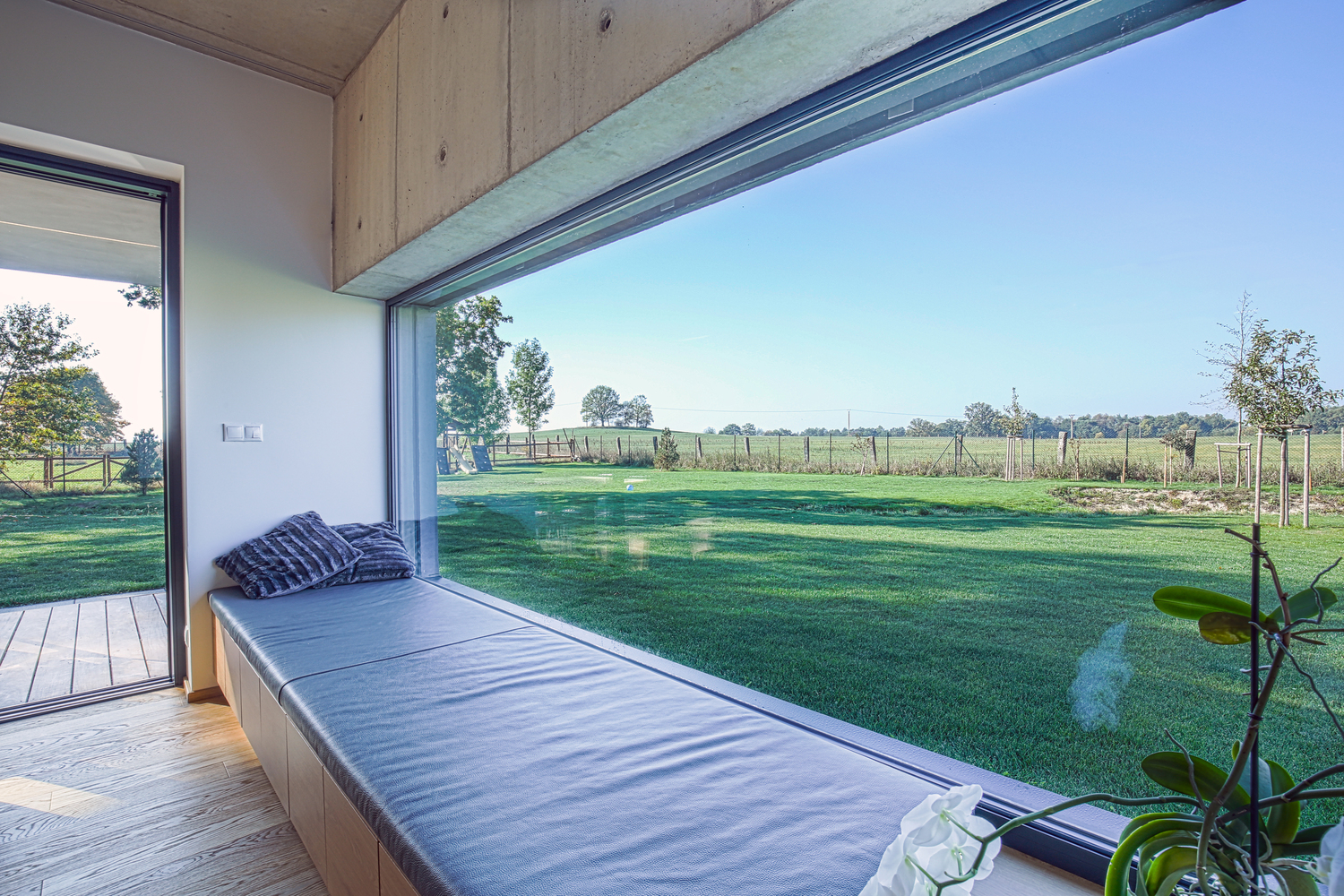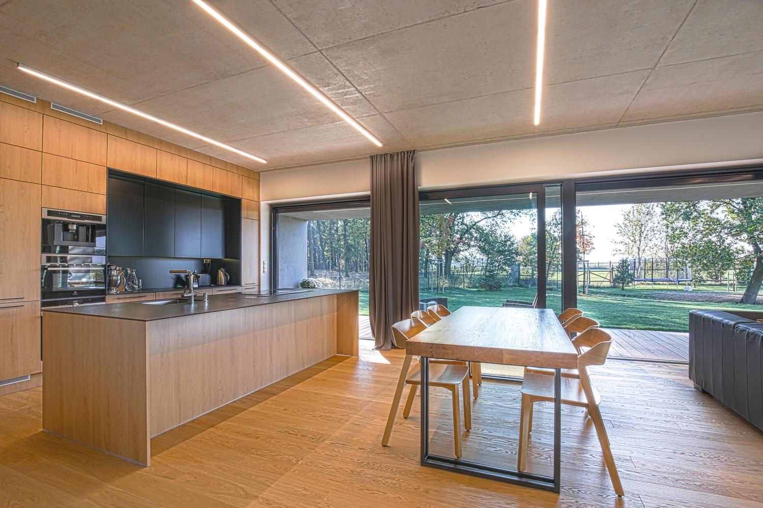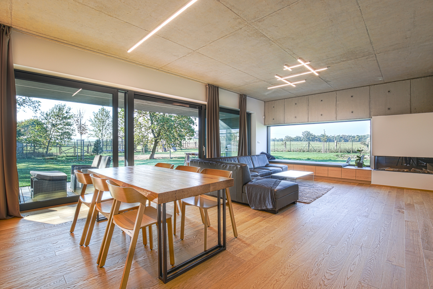 Wnętrze domu podporządkowane jest prostocie i funkcjonalności. Układ przestrzenny jest klarowny, a relacja między strefą dzienną a otoczeniem została maksymalnie otwarta. Duże przeszklenia pozwalają wprowadzić krajobraz do środka, sprawiając, że granica między wnętrzem a naturą staje się niemal niewidoczna.