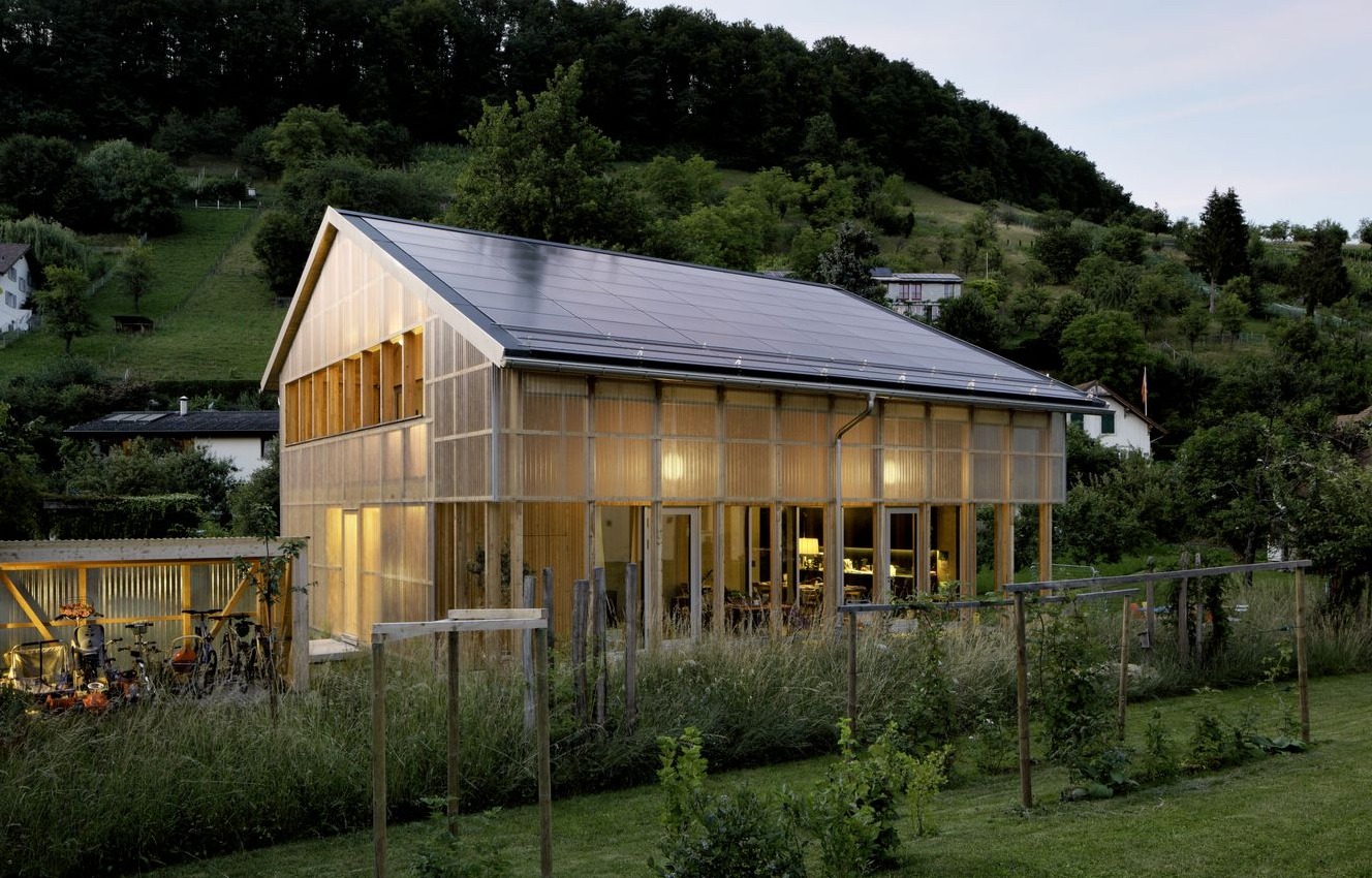 Na parterze zaplanowano przestronne wejście z garderobą w części nieogrzewanej, strefę biurową, sypialnię główną z łazienką oraz jasny, otwarty salon połączony z kuchnią, który dzięki dużym przeszkleniom otwiera się bezpośrednio na werandę i ogród. Piętro mieści trzy sypialnie dziecięce, łazienkę, pralnię oraz otwarte przestrzenie komunikacyjne i dużą loggię od strony zachodniej. Ze względów ekonomicznych budynek nie posiada piwnicy, co jest rzadkością w Szwajcarii, ale wpisuje się w ekologiczne założenia inwestorów. Ta nowoczesna stodoła została wyposażona w zintegrowane z dachem panele fotowoltaiczne oraz gruntowy wymiennik ciepła, a wykorzystanie prefabrykowanych elementów i wyspecjalizowanej technologii budowy pozwoliło zamknąć projekt w bardzo racjonalnym budżecie.