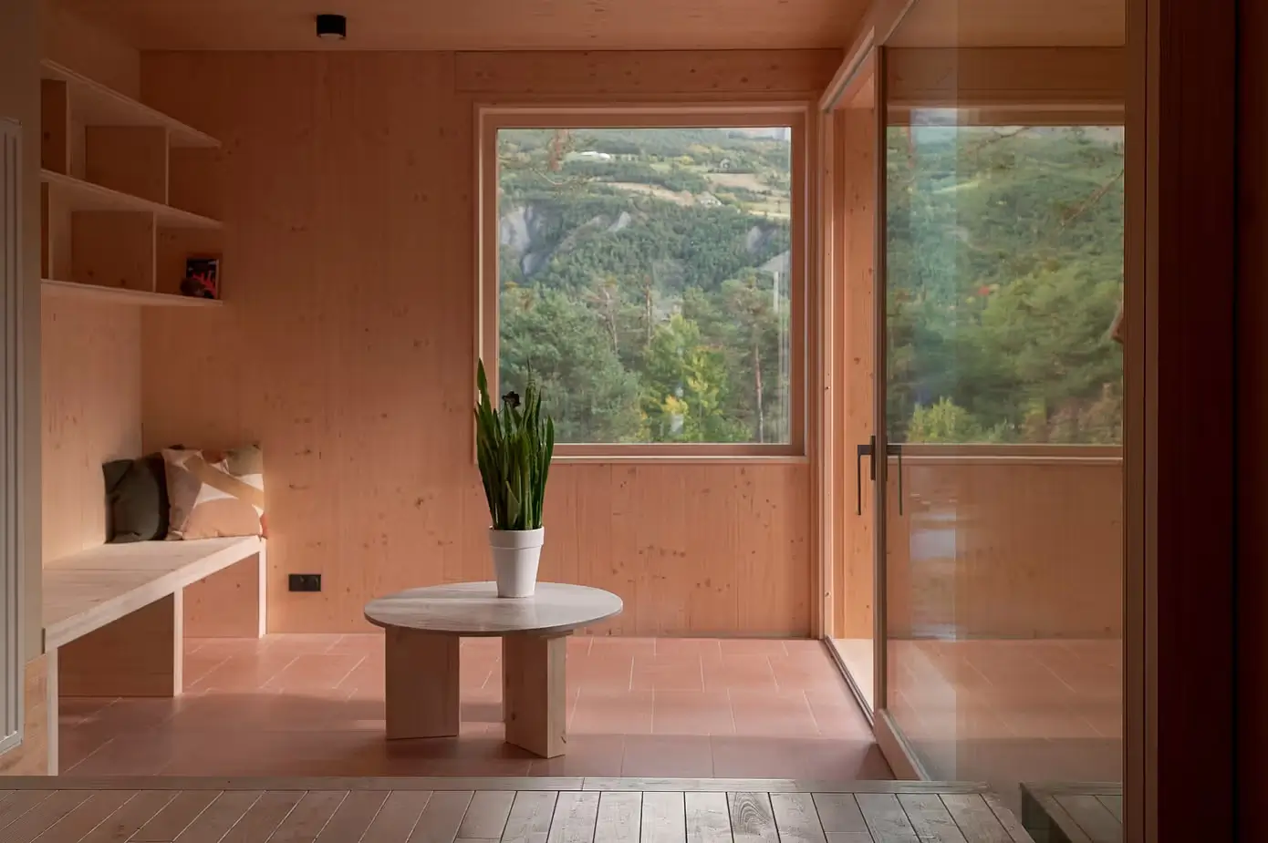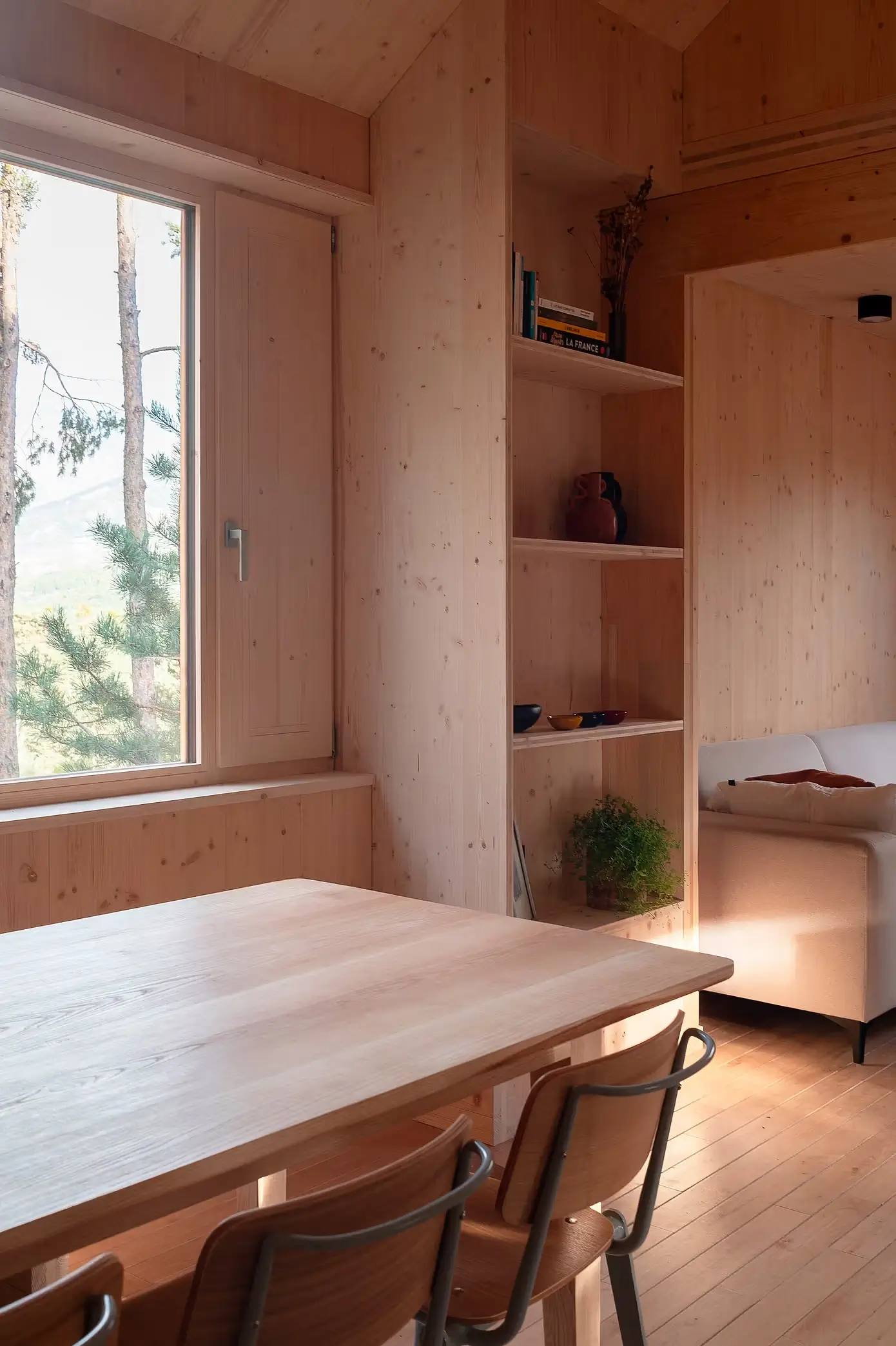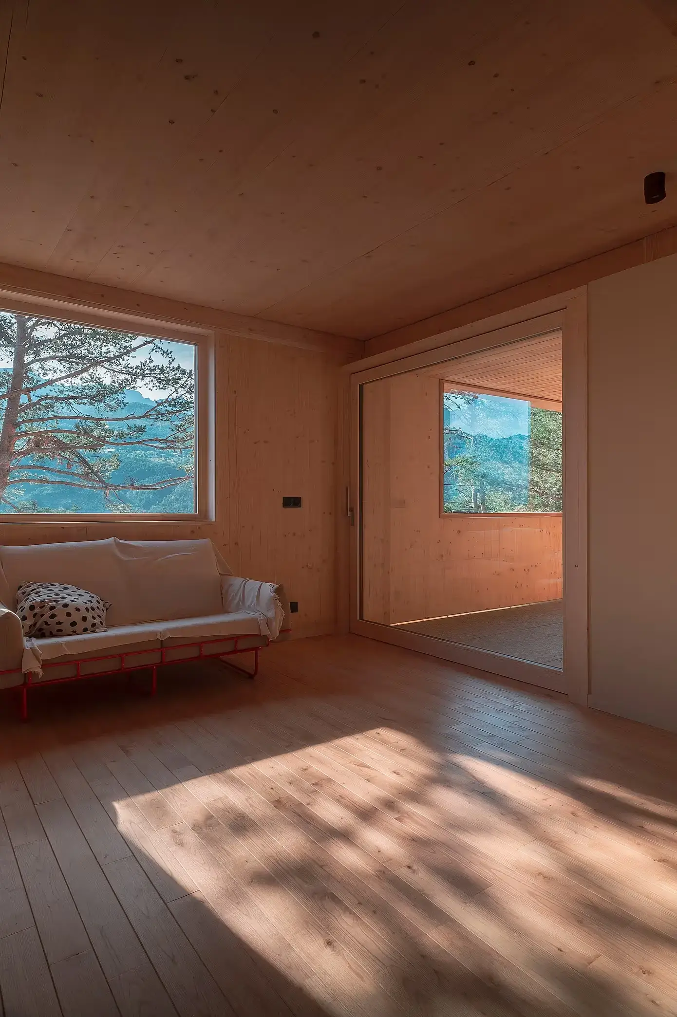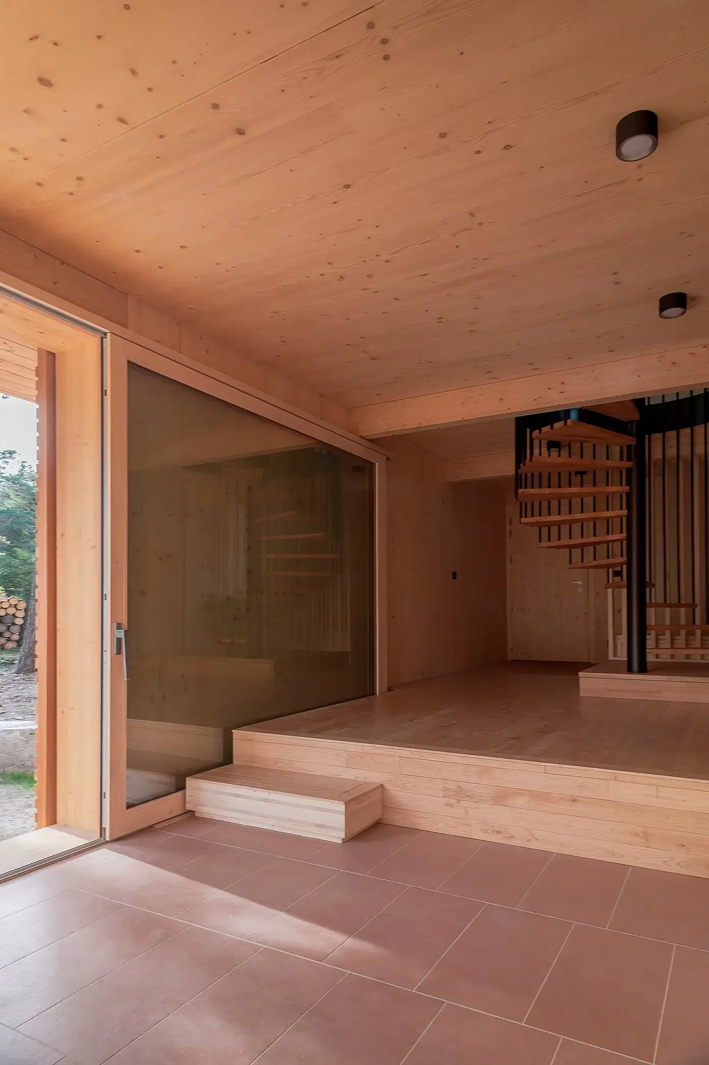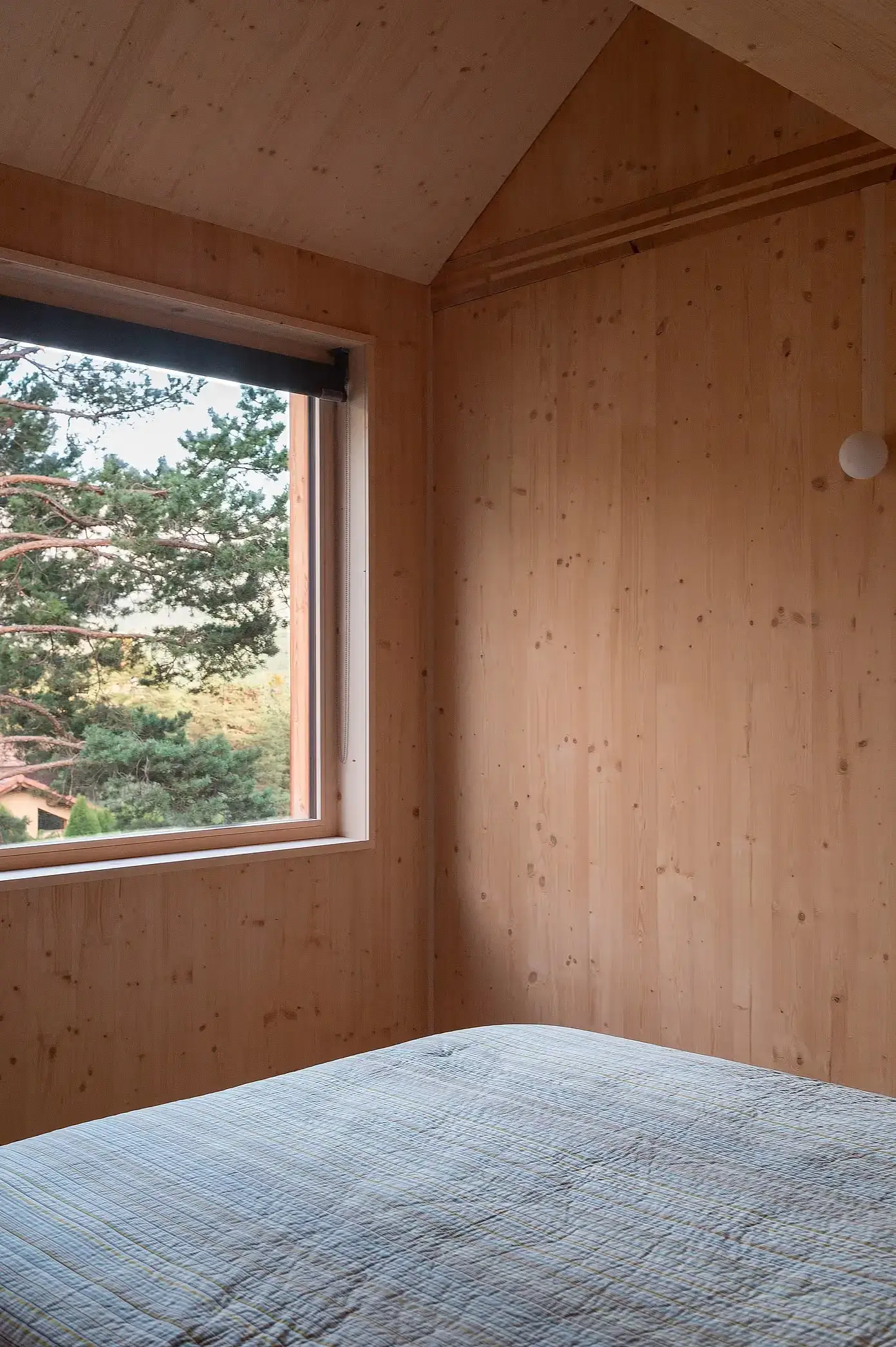 Na północnym wschodzie znajdują się dwie sypialnie i łazienka z widokiem na las i poranne światło. Kompaktowy rozkład przestrzeni eliminuje zbędne korytarze, koncentrując się na funkcjonalnych przestrzeniach przejściowych. Spiralne schody prowadzą na piętro, gdzie znajduje się wspólna przestrzeń, z której roztaczają się widoki na lasy na północy i południu. Zadaszony taras w południowo-wschodnim narożniku umożliwia korzystanie z zewnętrznej przestrzeni przez cały rok, niezależnie od pogody, oferując panoramiczny widok na otoczenie.