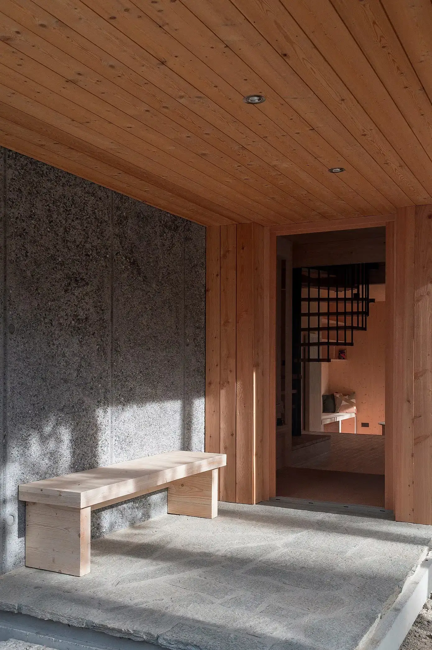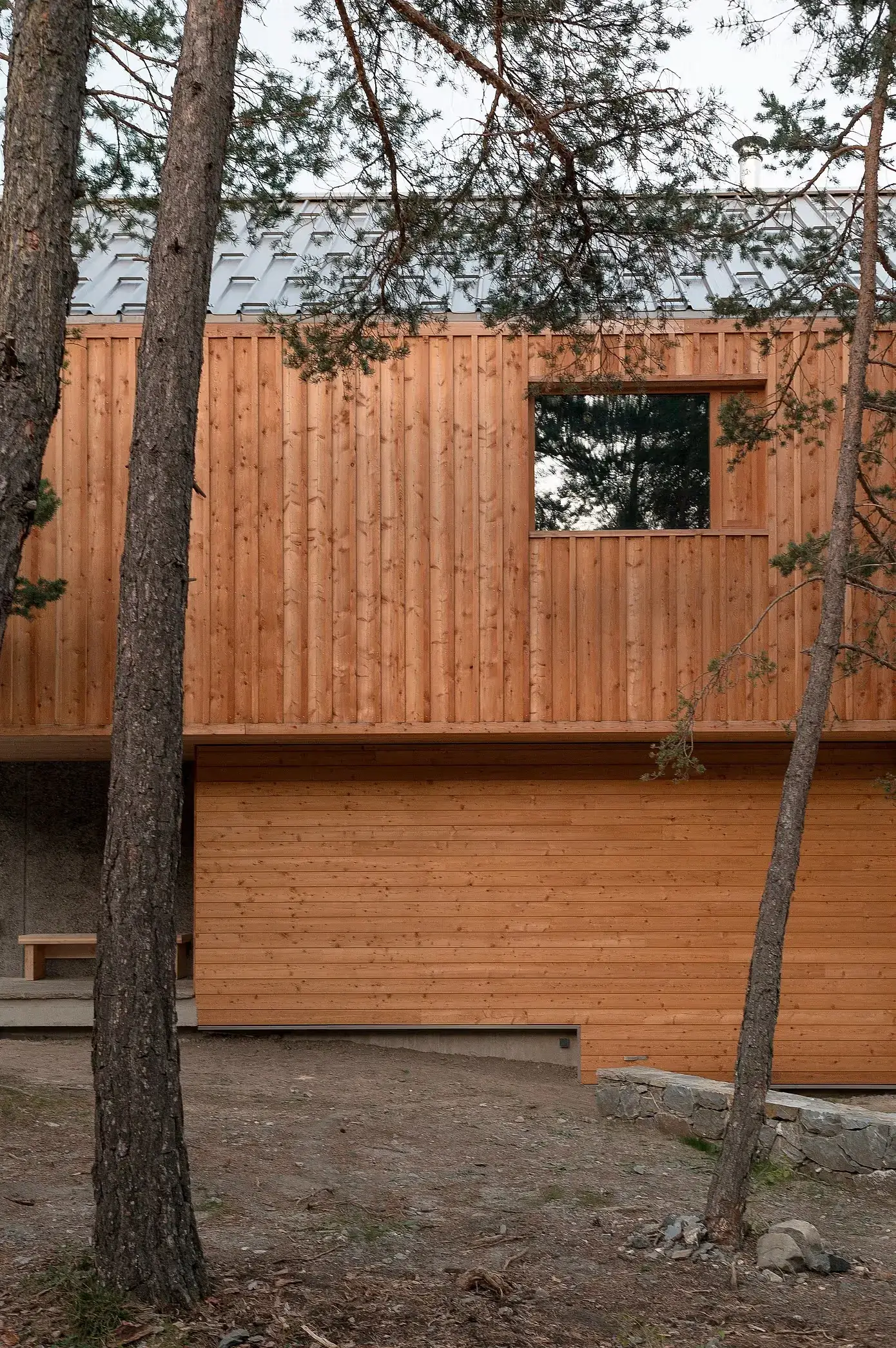 Projekt zakłada umieszczenie domu w pustce pozostawionej przez dawną drogę leśną, pomiędzy dwoma skupiskami drzew, które zostaną zachowane. Objętość domu, złożona z 39 paneli CLT, jest ustawiona na północnym krańcu działki, z południową fasadą integrującą się z naturalnym otoczeniem. Wejście od zachodu prowadzi przez techniczne i magazynowe pomieszczenia, a wnętrze domu odzwierciedla teren, na którym jest osadzone. Przestrzenie parteru prowadzą do ogrodu na południowym wschodzie, gdzie szerokie otwarcie na zewnątrz umożliwia korzystanie z przestrzeni podczas rodzinnych aktywności.