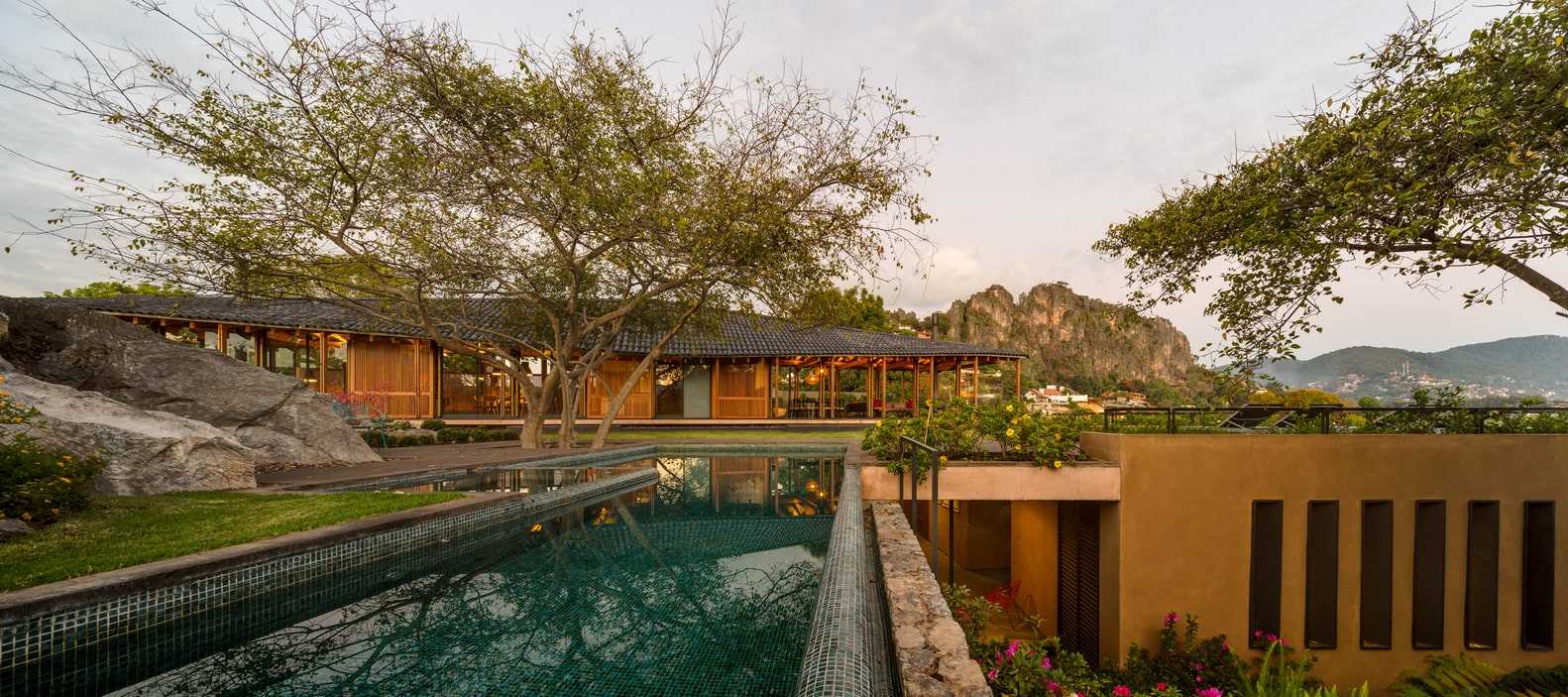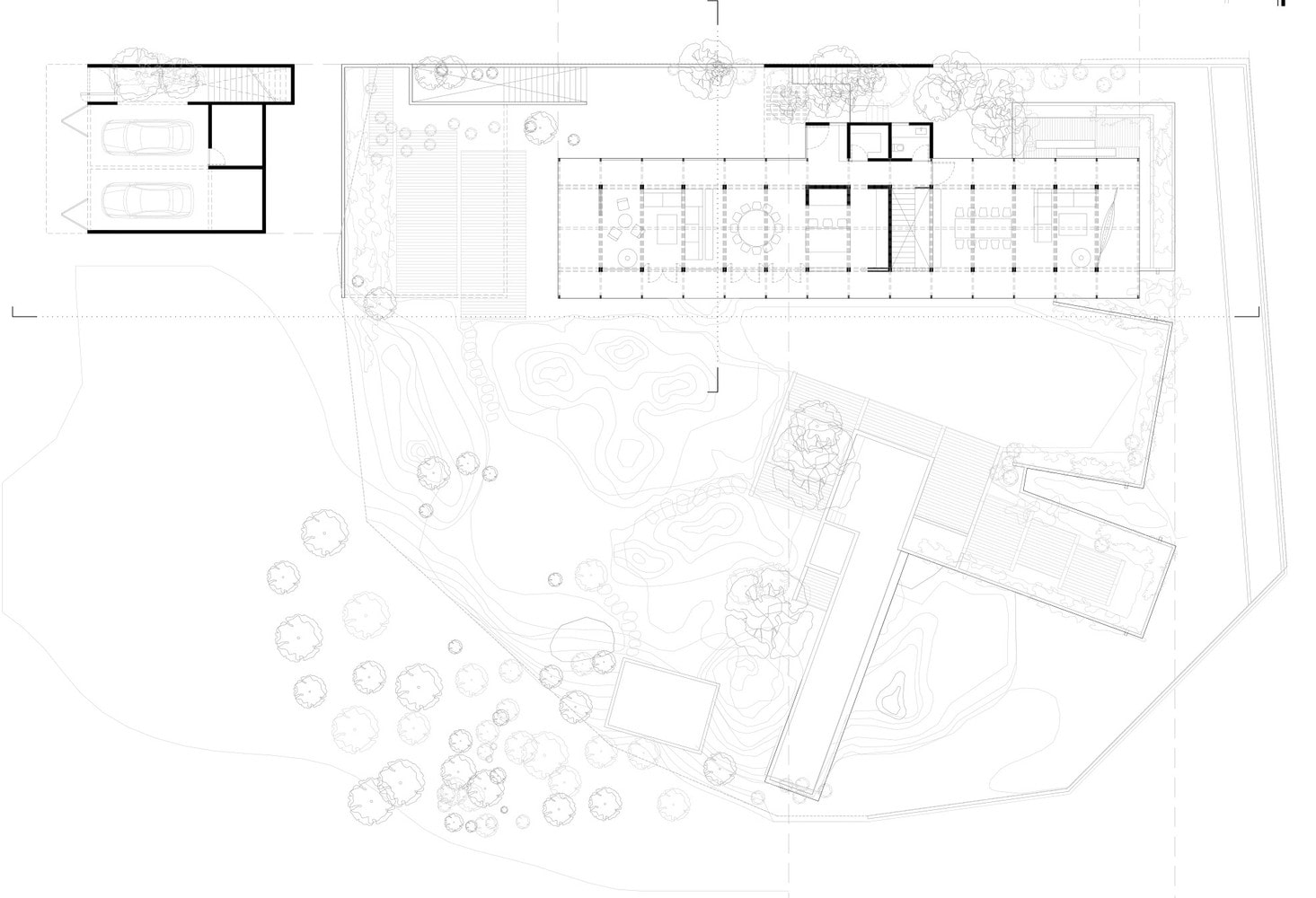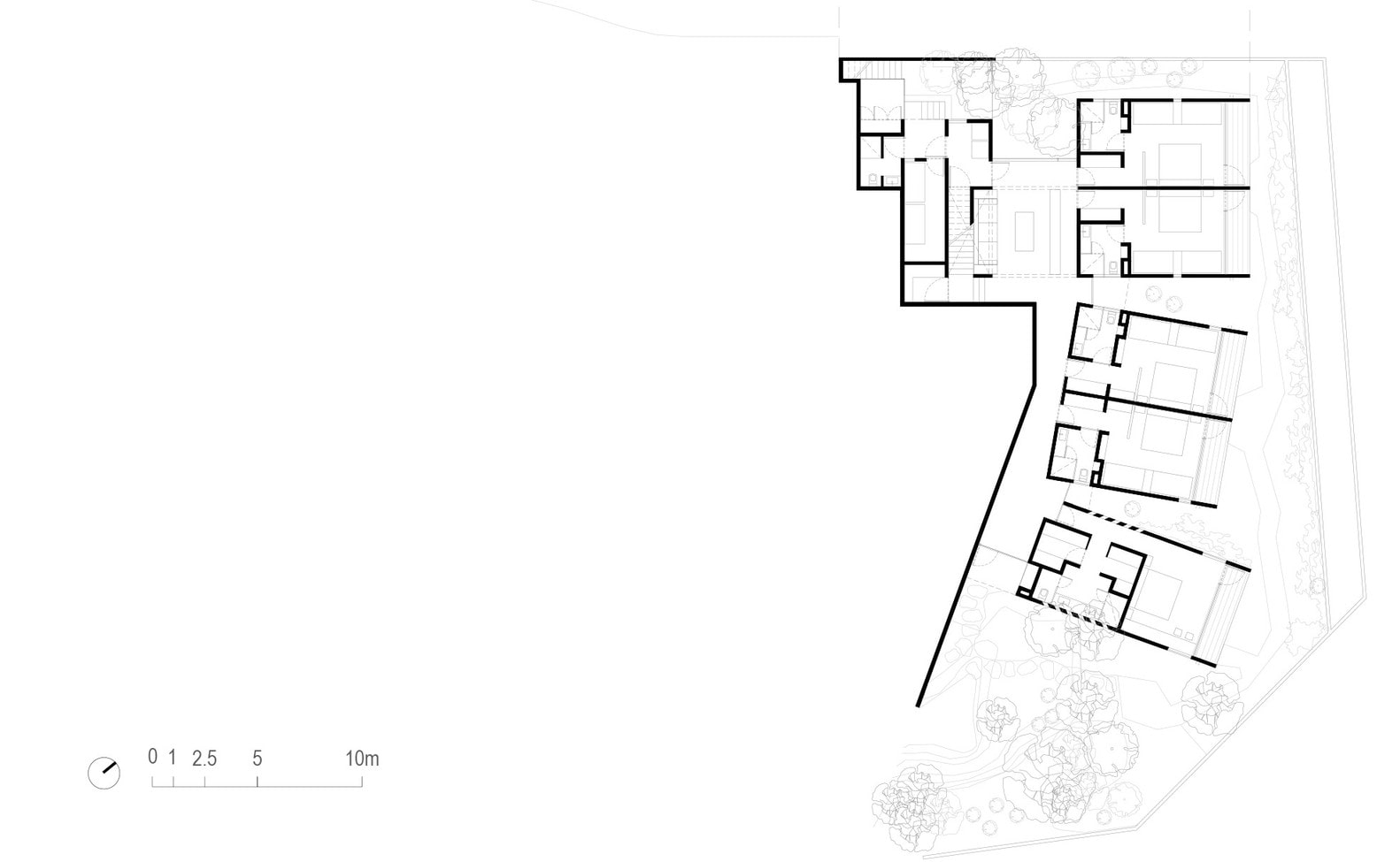 W wyniku tego podejścia, projekt niemal całkowicie rezygnuje z tradycyjnych prywatnych pokoi, umieszczając je na poziomie półpodziemnym. Taki układ pozwala na spektakularne widoki z wnętrz, umożliwiając mieszkańcom kontemplowanie zarówno bliższego, jak i odległego krajobrazu. Wszystkie wspólne przestrzenie zostały zaprojektowane w jednolitą, prostą formę pawilonu, którego celem jest integracja z naturą i zapewnienie ciągłości przestrzennej, a także umożliwienie wzajemnej interakcji przestrzeni z krajobrazem.