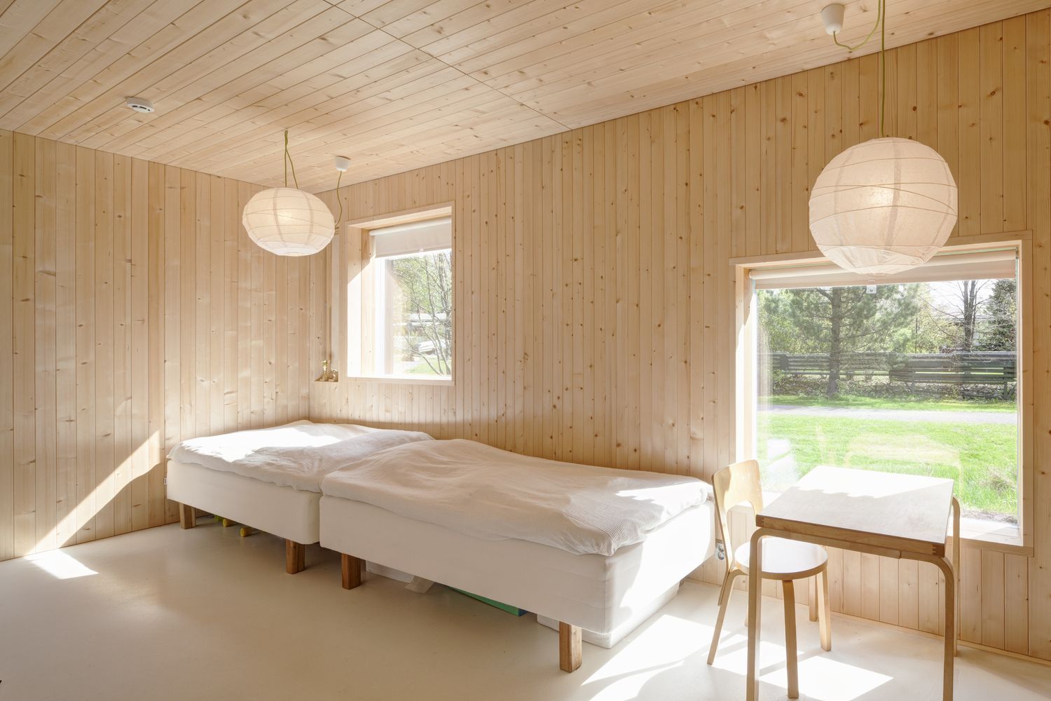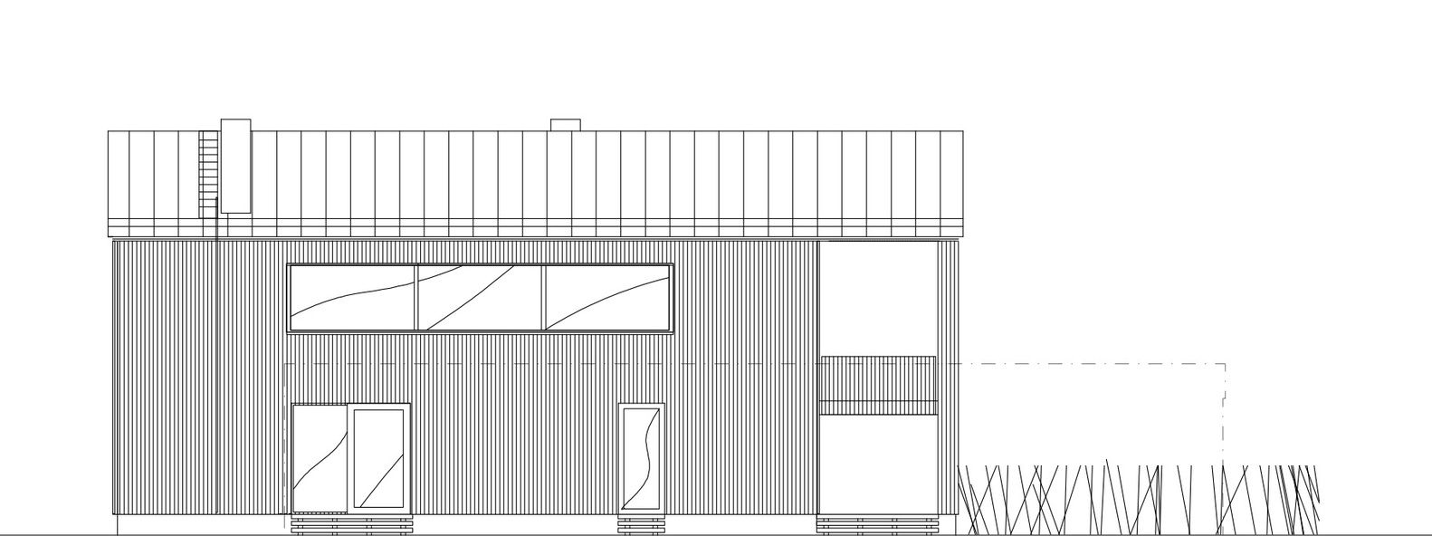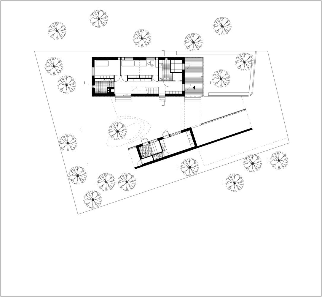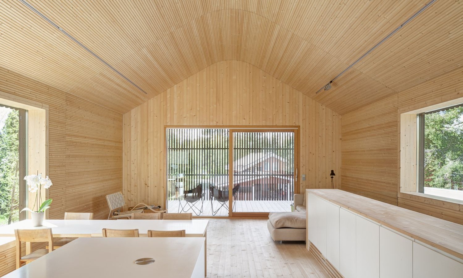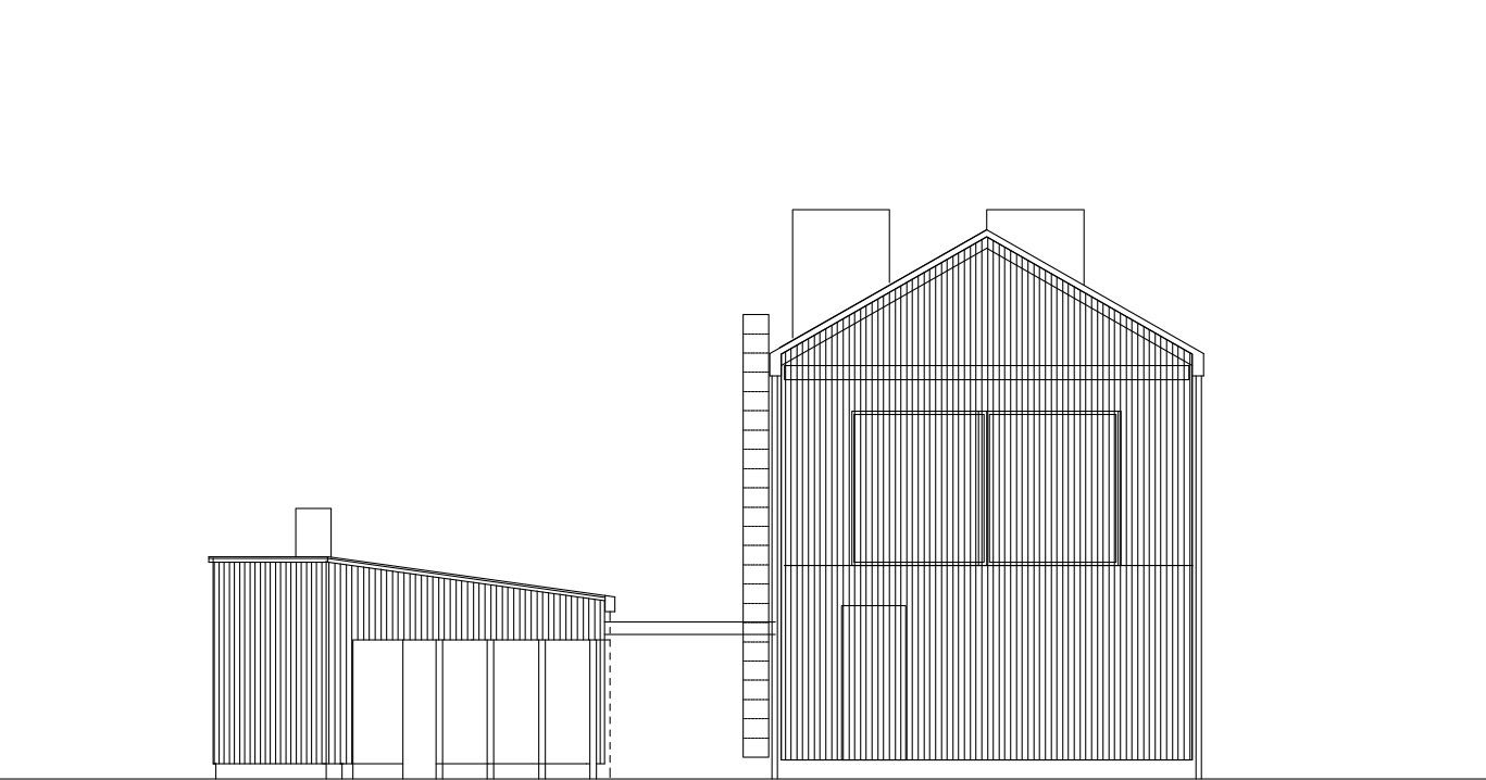 Przybudówka pełni funkcję biura, pokoju gościnnego oraz mieści ogrzewaną drewnem saunę. Pomiędzy budynkami stworzono prywatny, zabudowany ogród, który stanowi idealne miejsce do odpoczynku. Całość projektu charakteryzuje wysoki standard wykonania, osiągnięty dzięki ścisłej współpracy z doświadczonymi rzemieślnikami i dostawcami materiałów.