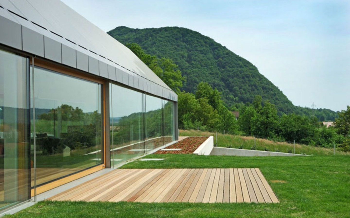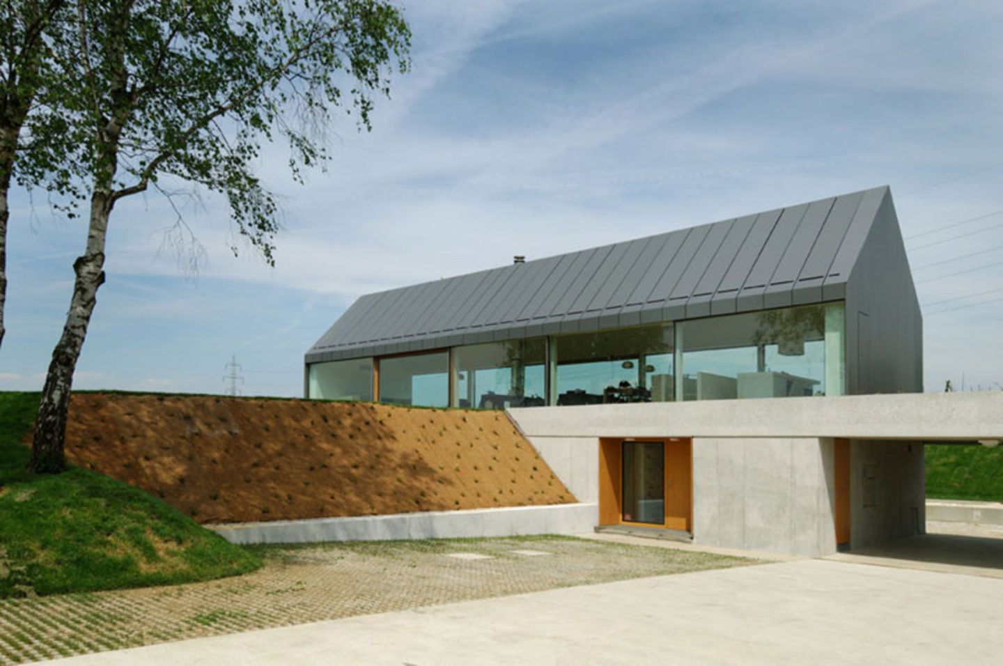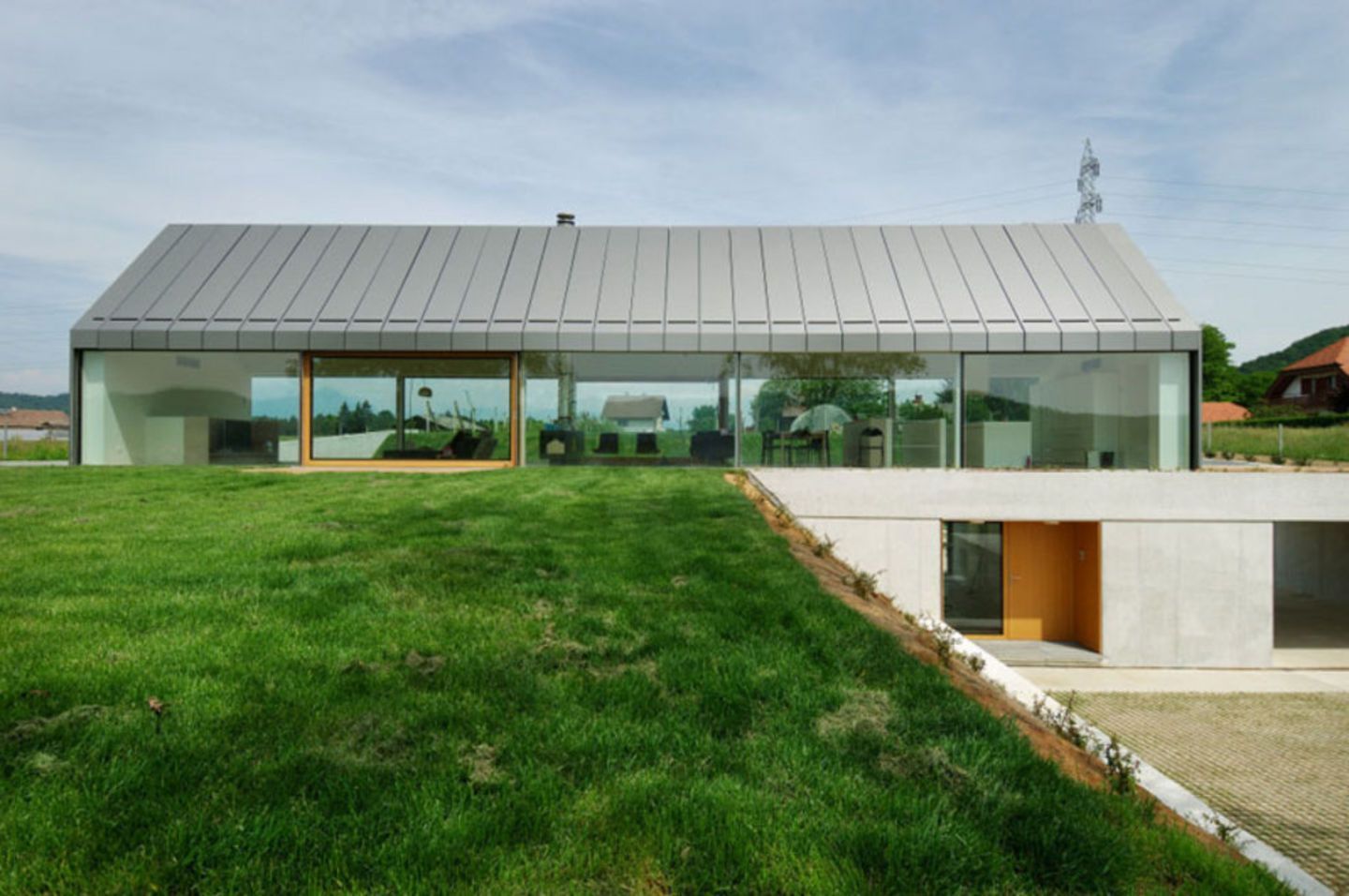 Zlokalizowany na szczycie niskiego wzgórza, dom HB przypomina przezroczystą strukturę unoszącą się nad ziemią. Mimo swojej dominującej pozycji, harmonia z otaczającym krajobrazem jest jednym z kluczowych założeń projektu. Dach i elewacje boczne, pokryte jednolitymi płytami aluminiowymi, tworzą minimalistyczną formę, eliminując zbędne detale dekoracyjne.