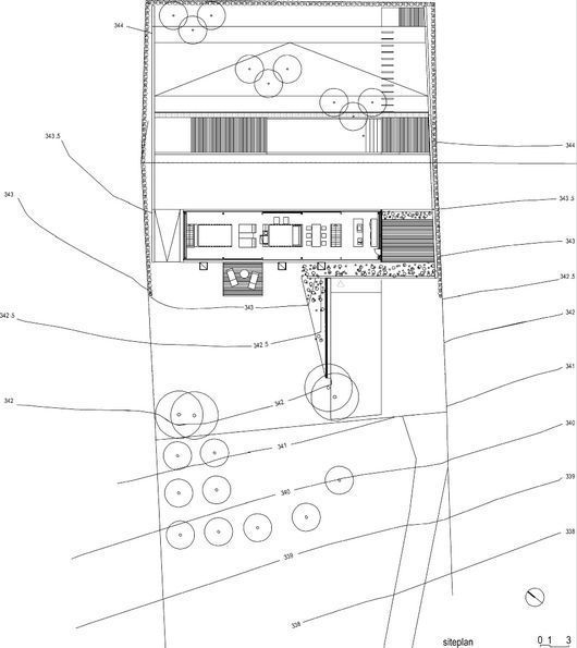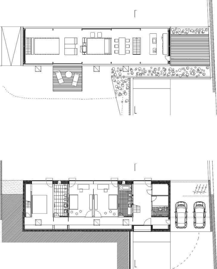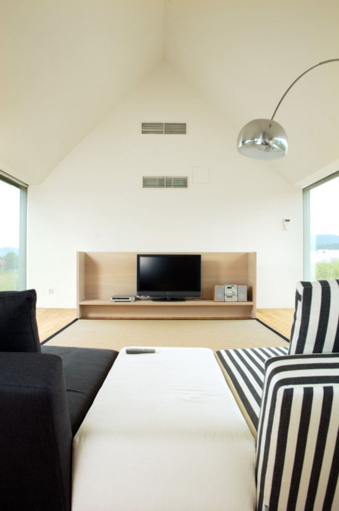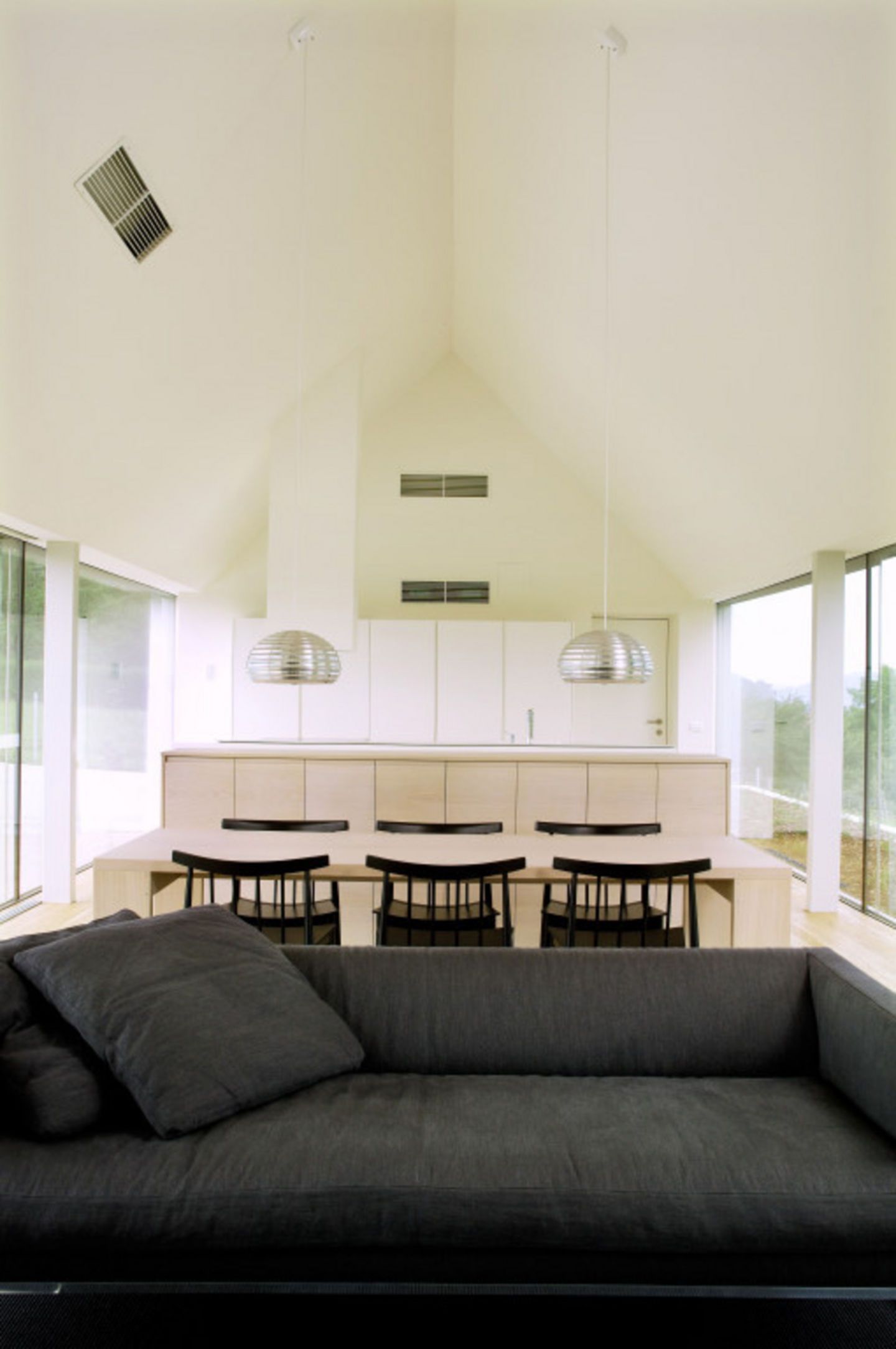 Dolna część budynku, wykonana z betonu, jest zorientowana na ukryte patio, zapewniając prywatność i spokój. Górna konstrukcja, w pełni przeszklona na dłuższej krawędzi, oferuje panoramiczne widoki i doskonałe połączenie wnętrza z zewnętrzem. Otwarte wnętrze bez ścian działowych tworzy przestrzeń wielofunkcyjną, idealną dla współczesnego stylu życia.