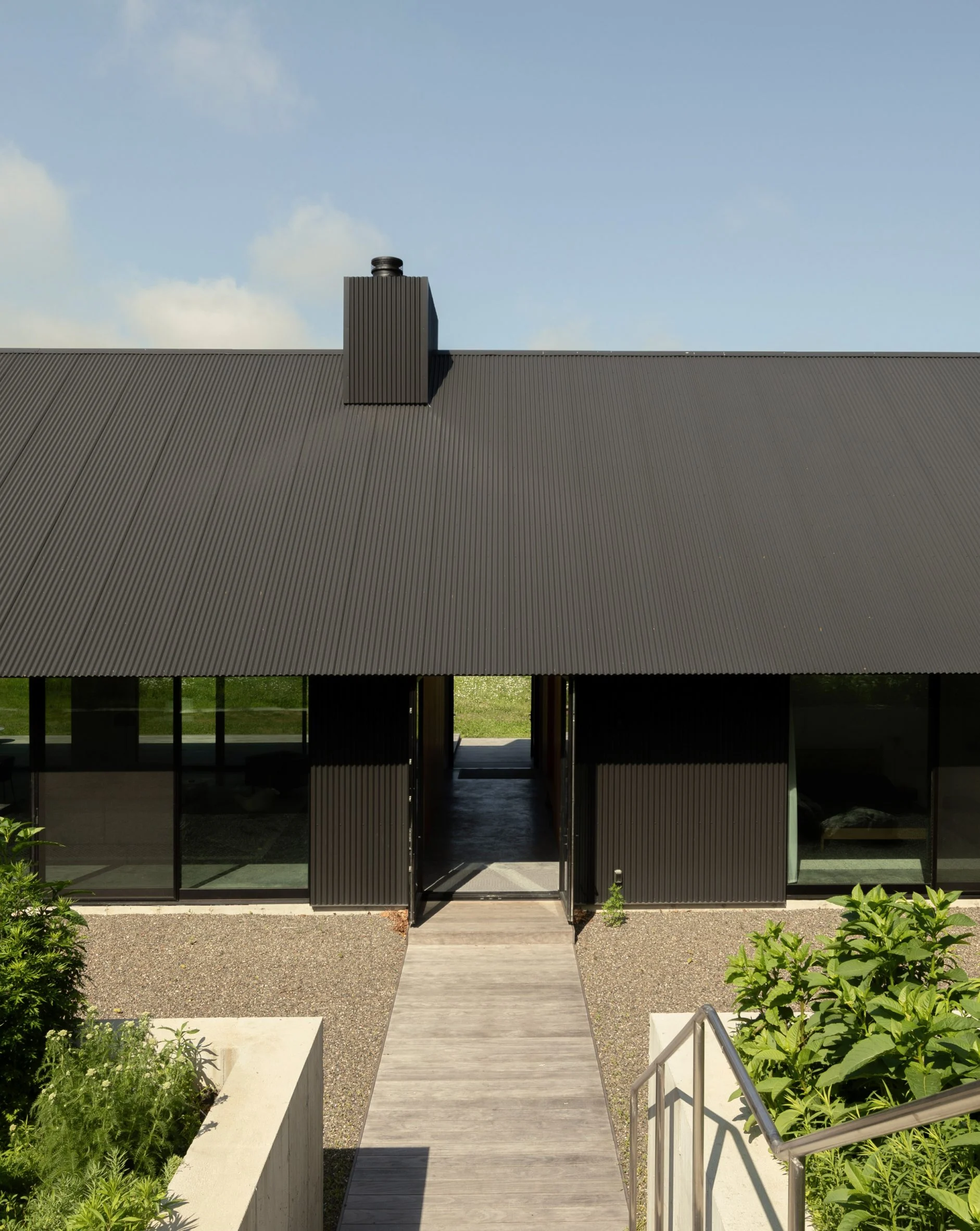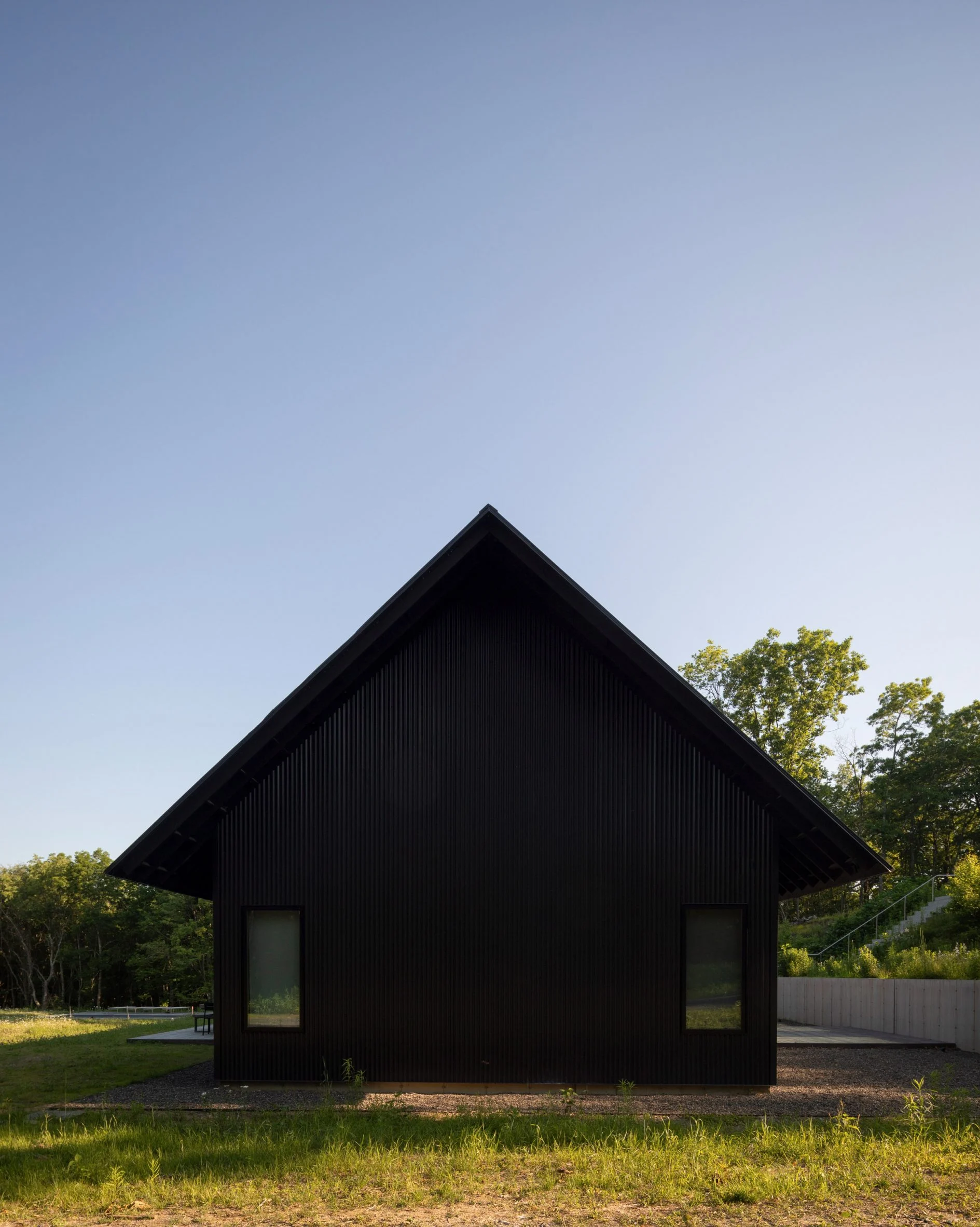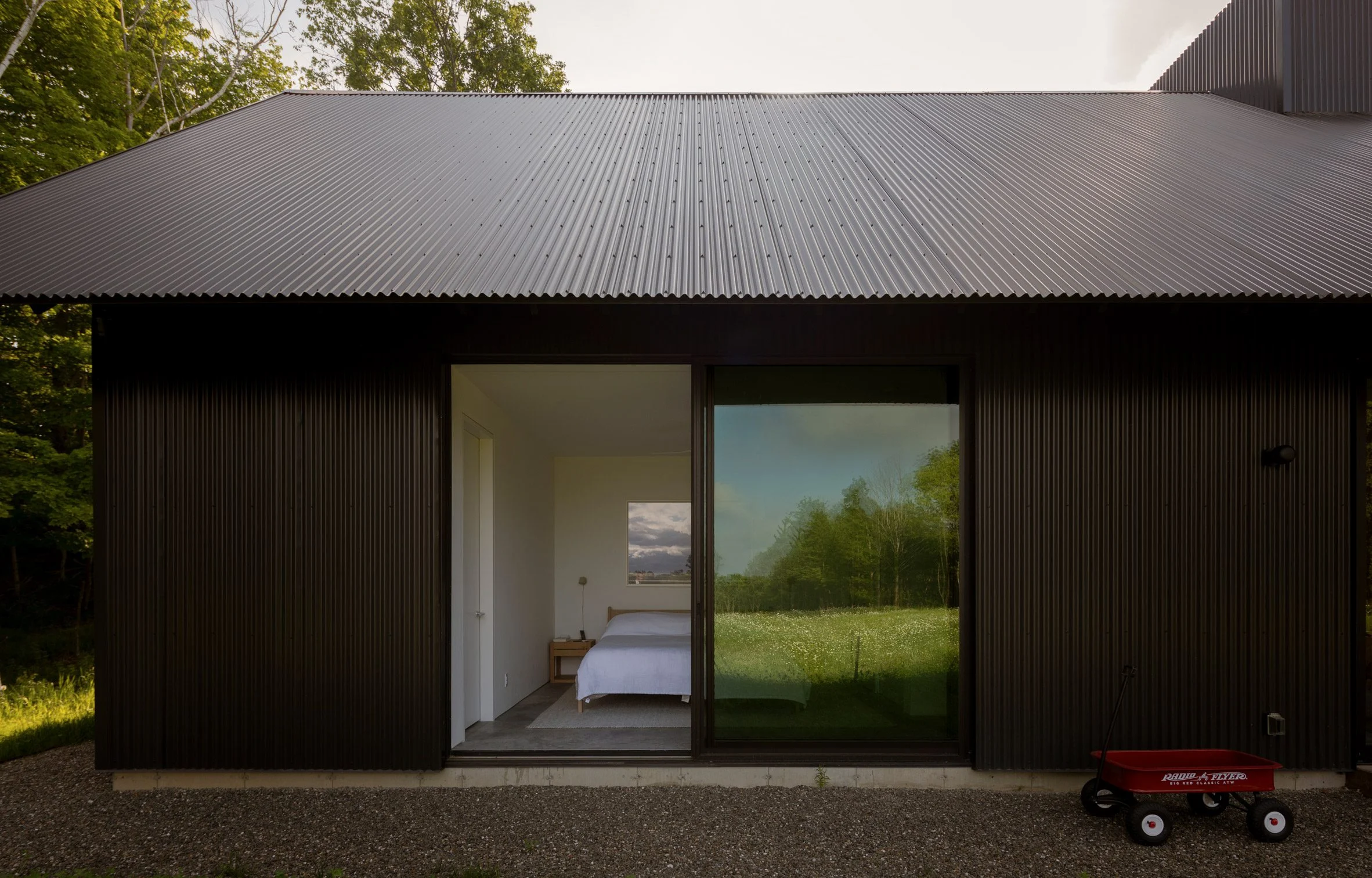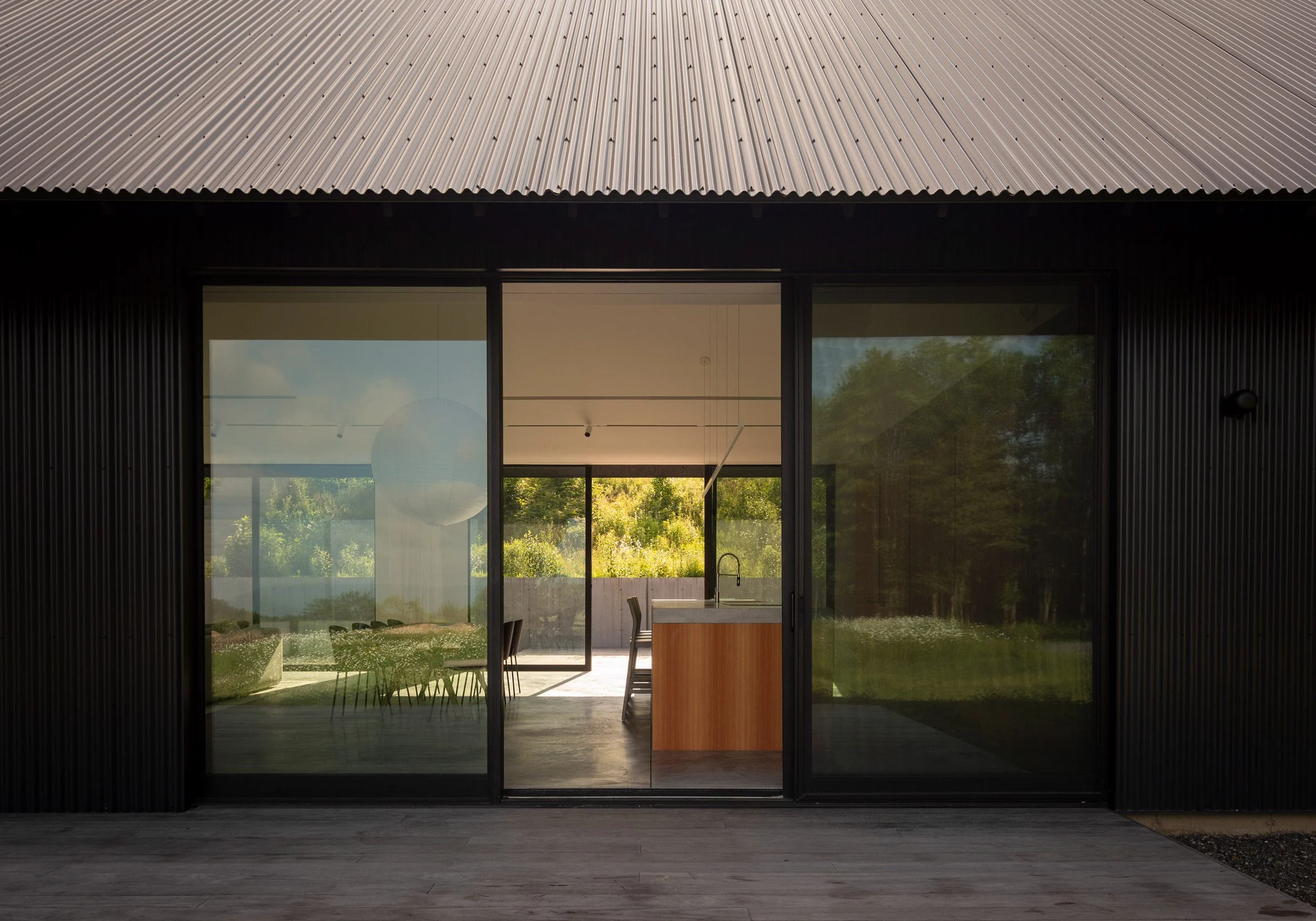Architekci wybrali czarne, dwuspadowe bryły z blachy falistej na elewacji i dachu. Dzięki temu projekt podkreśla kolory i faktury naturalnego otoczenia. Dom otwierają przeszklone, sięgające sufitu ściany wzdłuż dłuższych boków, a krótsze fasady akcentują symetryczne prostokątne okna.