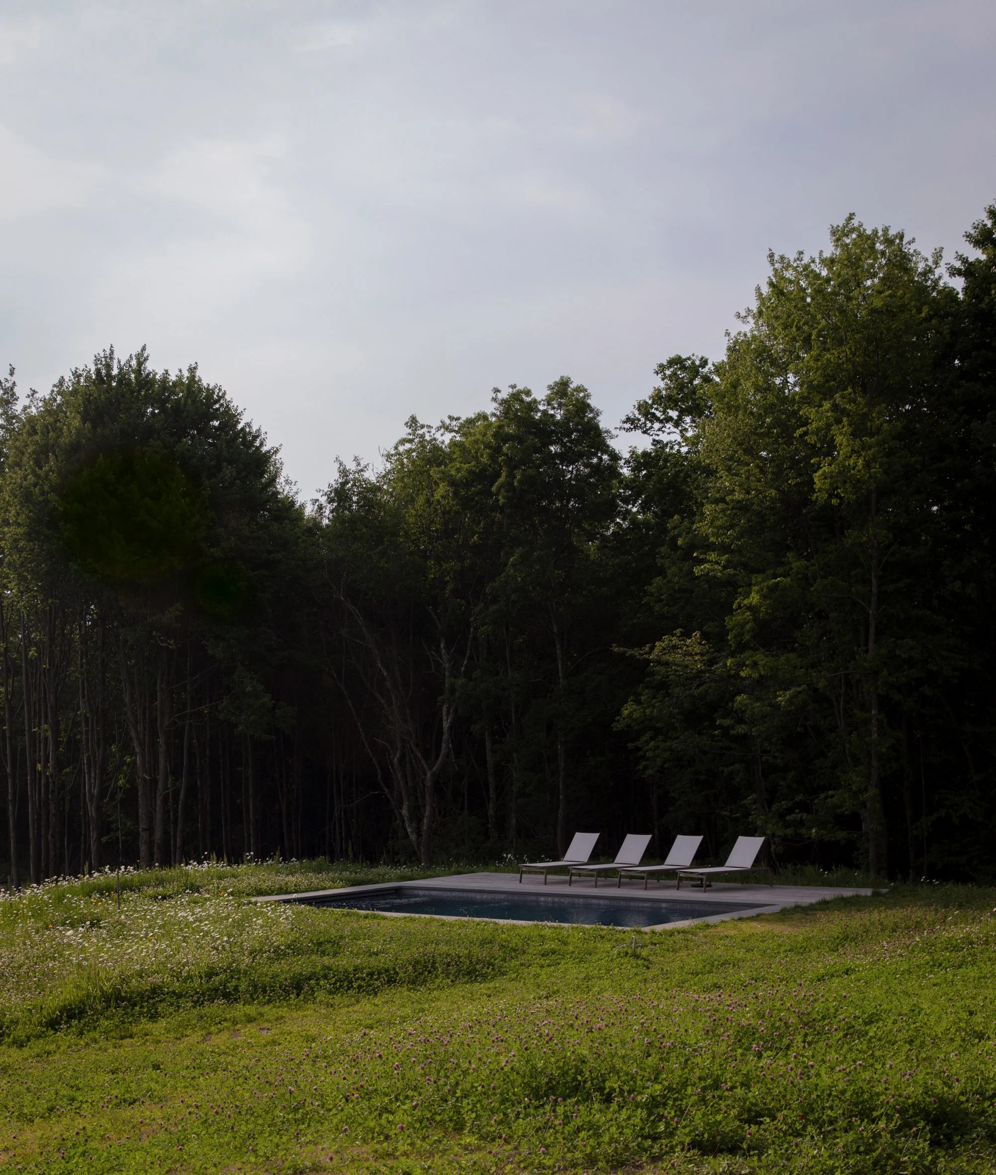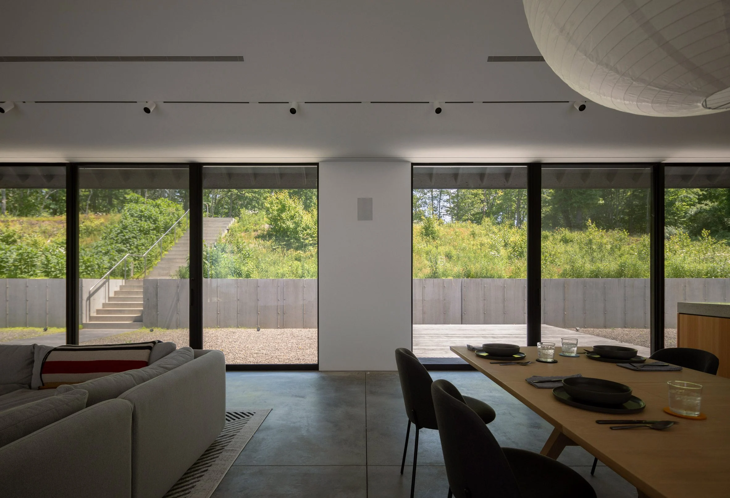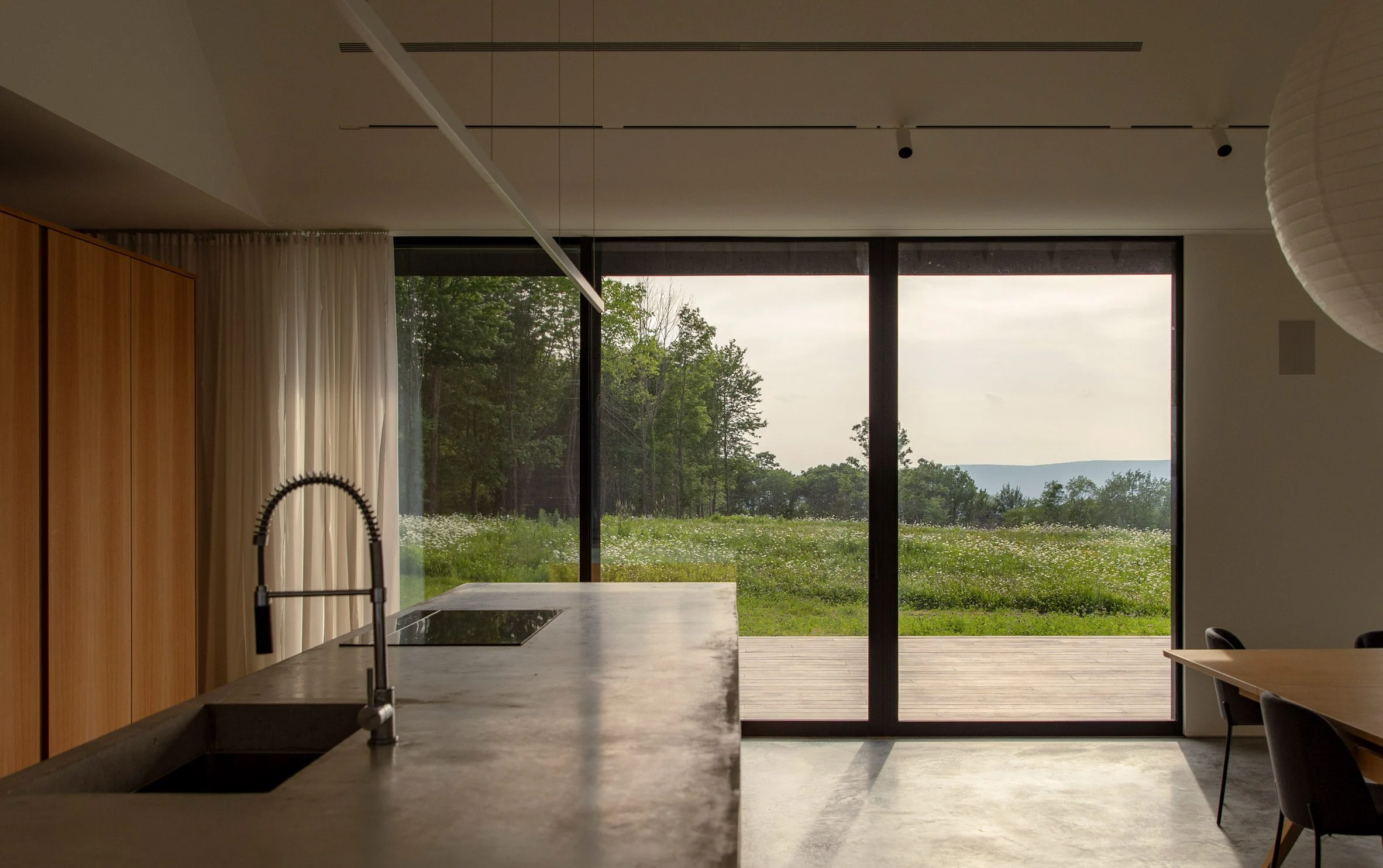 Dom, harmonijnie łączący prostotę formy i funkcjonalność, staje się częścią krajobrazu dzięki przemyślanemu projektowi i użyciu materiałów podkreślających naturalne piękno otoczenia. To przykład nowoczesnej architektury, która celebruje przestrzeń i światło, wpisując się w malowniczy krajobraz Catskills.