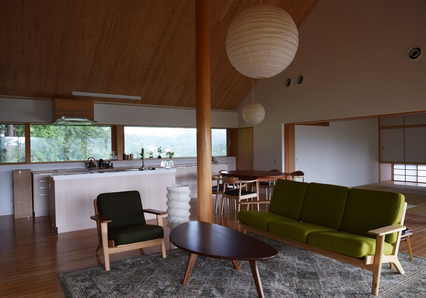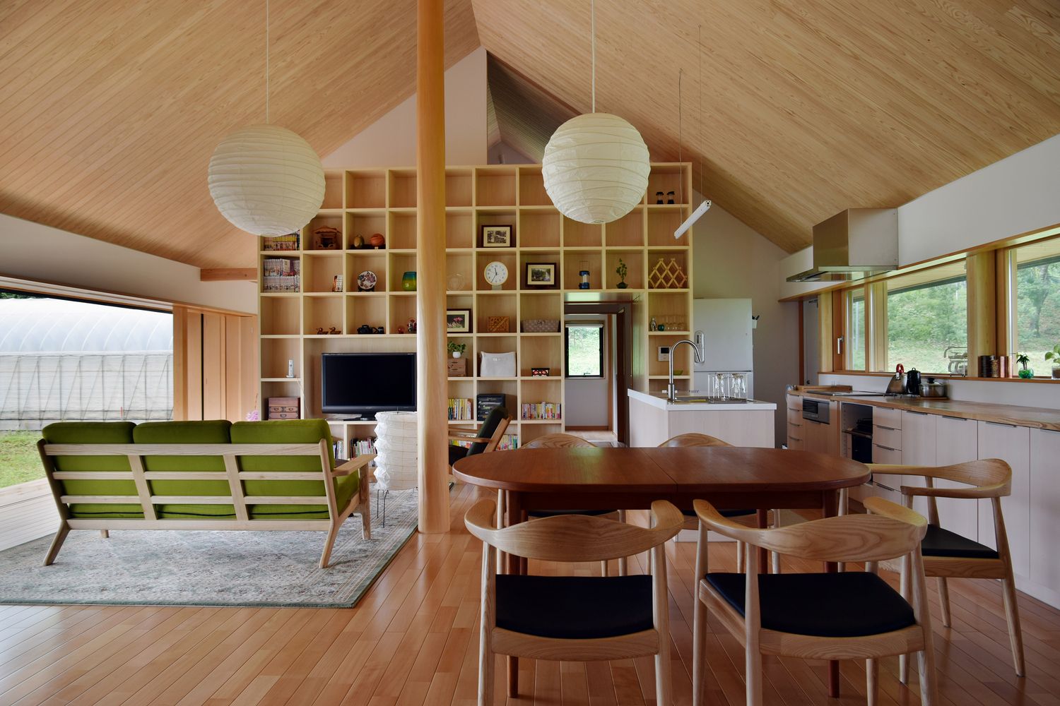 Wnętrze domu zaprojektowano jako niemal jednoprzestrzenną całość, sprzyjającą wspólnemu życiu i stałej obecności domowników, z możliwością elastycznego podziału dzięki przesuwnym drzwiom. Od strony południowej umieszczono imponujące, ponad 12-metrowe przeszklenie, które zapewnia nieprzerwany kontakt z krajobrazem, naturalną wentylację latem i pasywne dogrzewanie zimą. Zróżnicowana wysokość wnętrz – od 4,8 m w salonie po bardziej kameralne 2,4 m w strefach prywatnych – buduje równowagę między przestronnością a przytulnością. Niskie okna i starannie rozmieszczone meble wzmacniają poczucie spokoju i intymności. Dom stał się symbolem relacji: człowieka z naturą oraz ludzi między sobą, tworząc spokojną, harmonijną przestrzeń do życia w duchu nowoczesna stodoła.