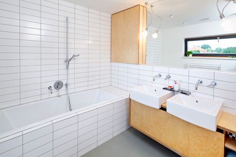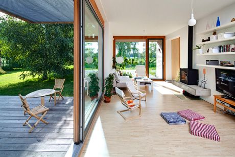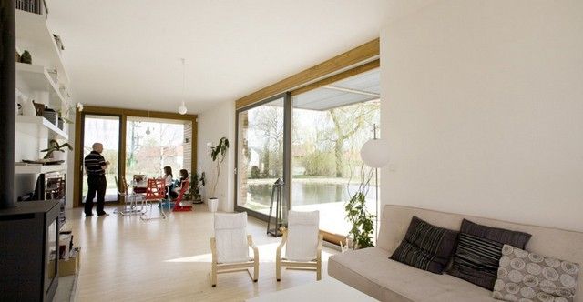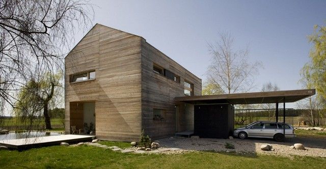 Układ funkcjonalny oparto na osi wschód–zachód, dzieląc dom na strefę dzienną od strony południowej oraz zaplecze użytkowe po stronie północnej. Parter stanowi otwarta przestrzeń salonu i jadalni, uzupełniona od północy o kuchnię i pomieszczenia robocze, z centralnie usytuowaną klatką schodową i wejściem. Na piętrze zaprojektowano sypialnie z widokiem na krajobraz oraz niewielki gabinet, a także łazienkę i toaletę. Drewniana elewacja kontrastuje z jasnym, minimalistycznym wnętrzem, w którym kolory otaczającej zieleni przenikają do środka, zmieniając charakter domu wraz z porami roku.