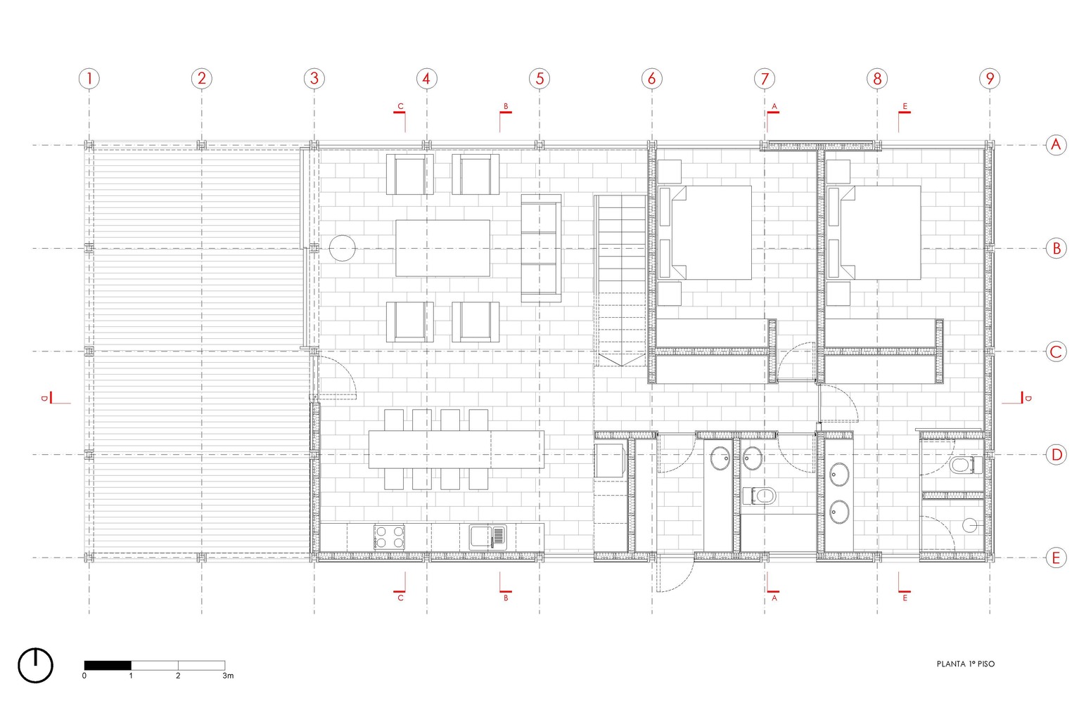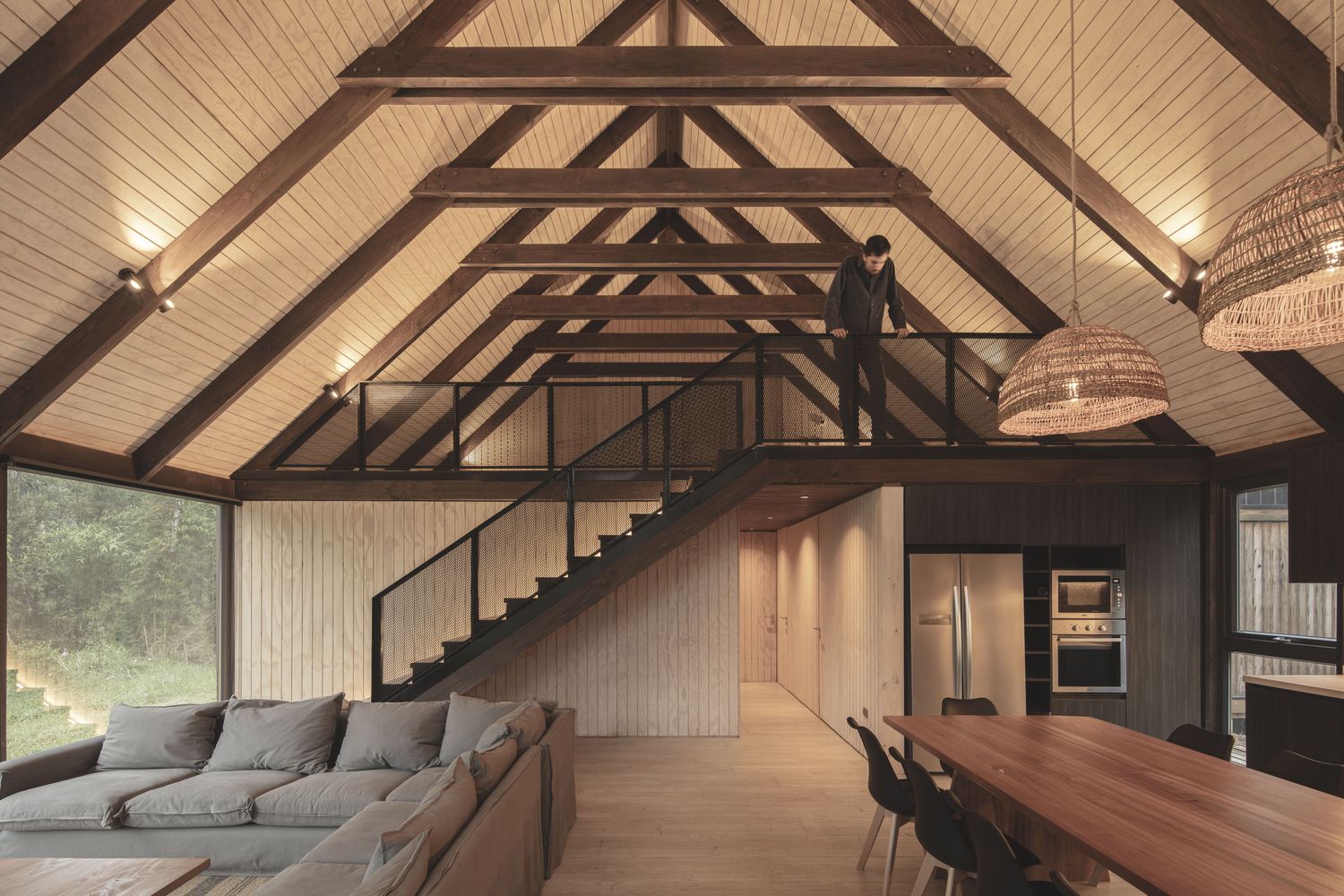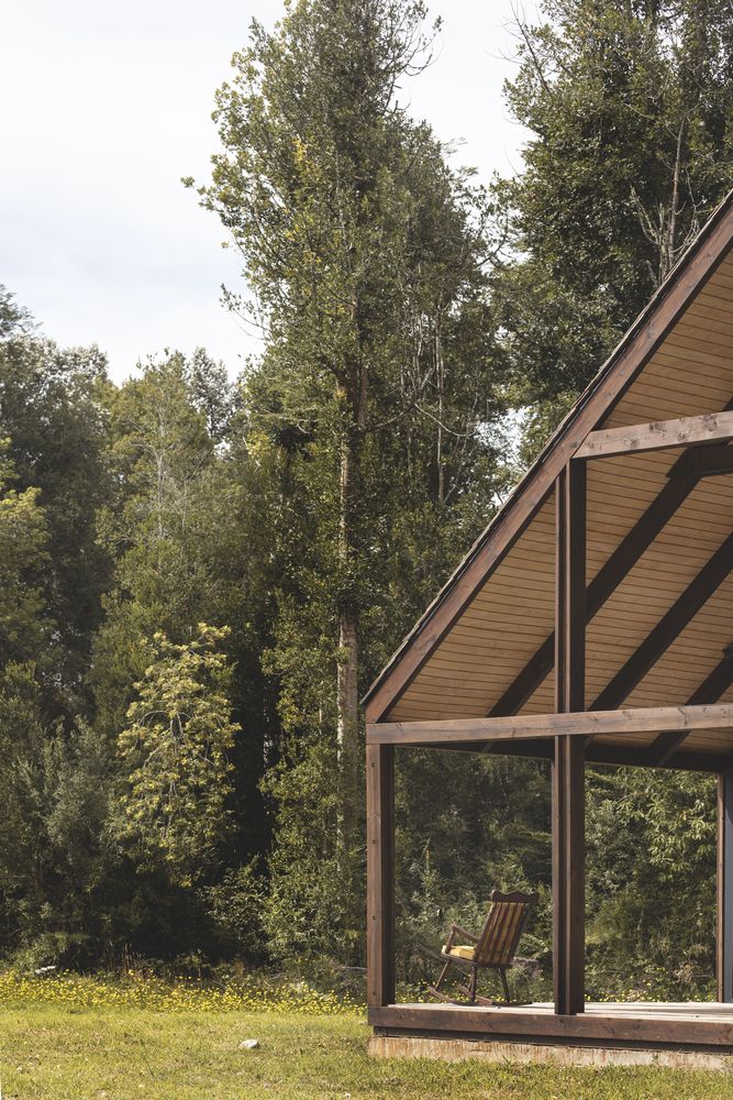 Struktura domu opiera się na module o szerokości 8,8 metra, zbudowanym z drewnianych słupów i wiązarów rozstawionych co 2,4 metra – wymiar ten odpowiada standardowym formatom drewna konstrukcyjnego dostępnego na rynku chilijskim. Pierwsza kondygnacja ma wysokość 2,4 metra, również zgodnie ze standardami, natomiast dachowy wiązar wznosi się na 4 metry, co umożliwia efektywne odprowadzanie wody deszczowej oraz pozwala stworzyć przestrzeń o podwójnej wysokości w części dziennej domu.