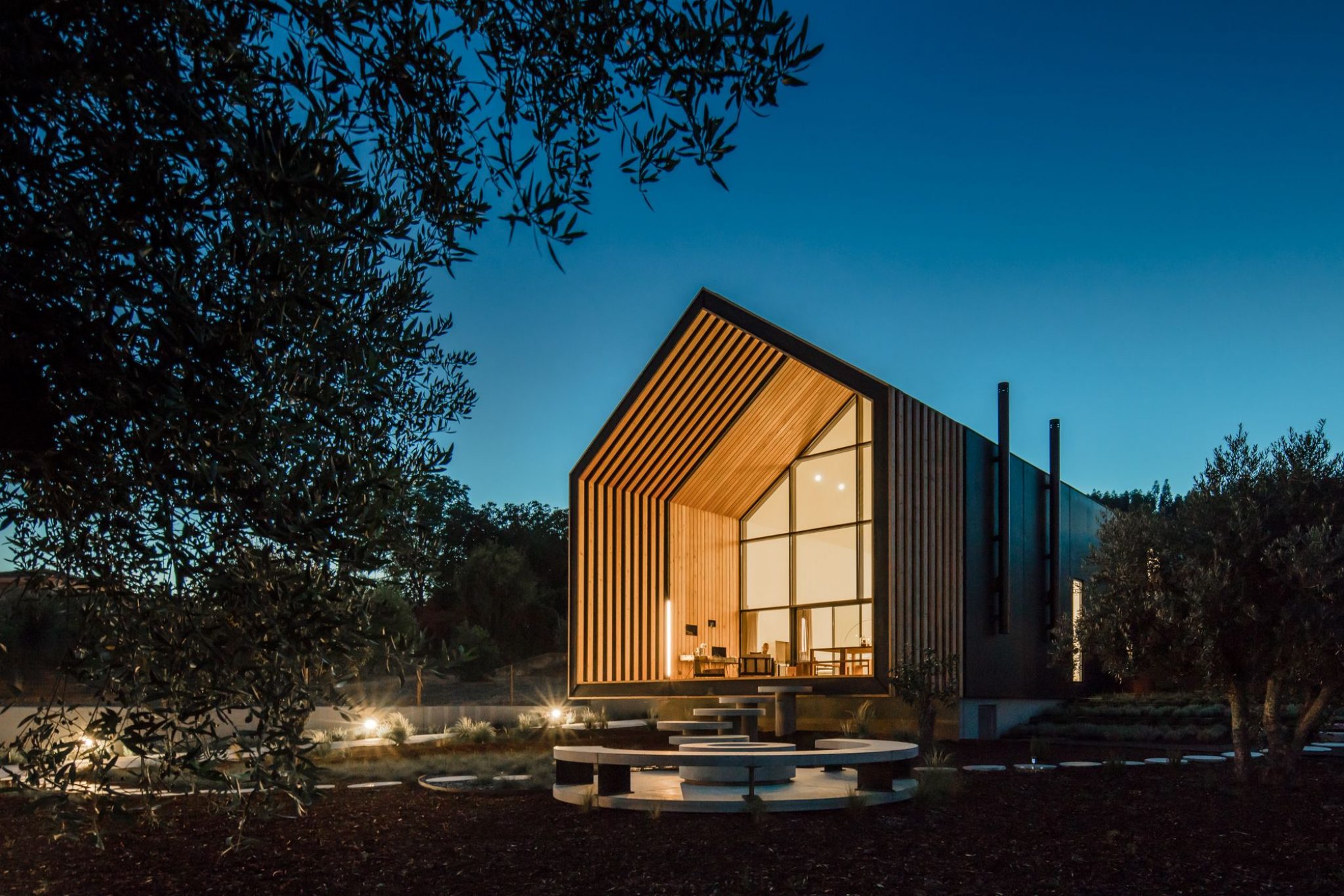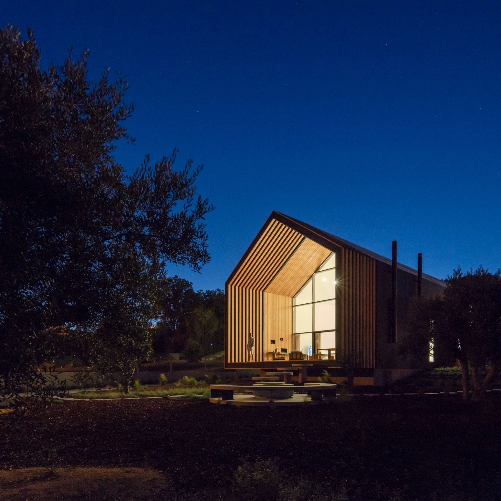 Dom zaprojektowano w oparciu o zasadę modularnej kompozycji, co wprowadziło rytm do elewacji i dachów. Konstrukcja bazuje na prefabrykowanych czarnych panelach betonowych, które definiują stereotomię budynku. Ten materiał nie tylko harmonijnie wpisuje się w krajobraz, ale również minimalizuje koszty utrzymania.