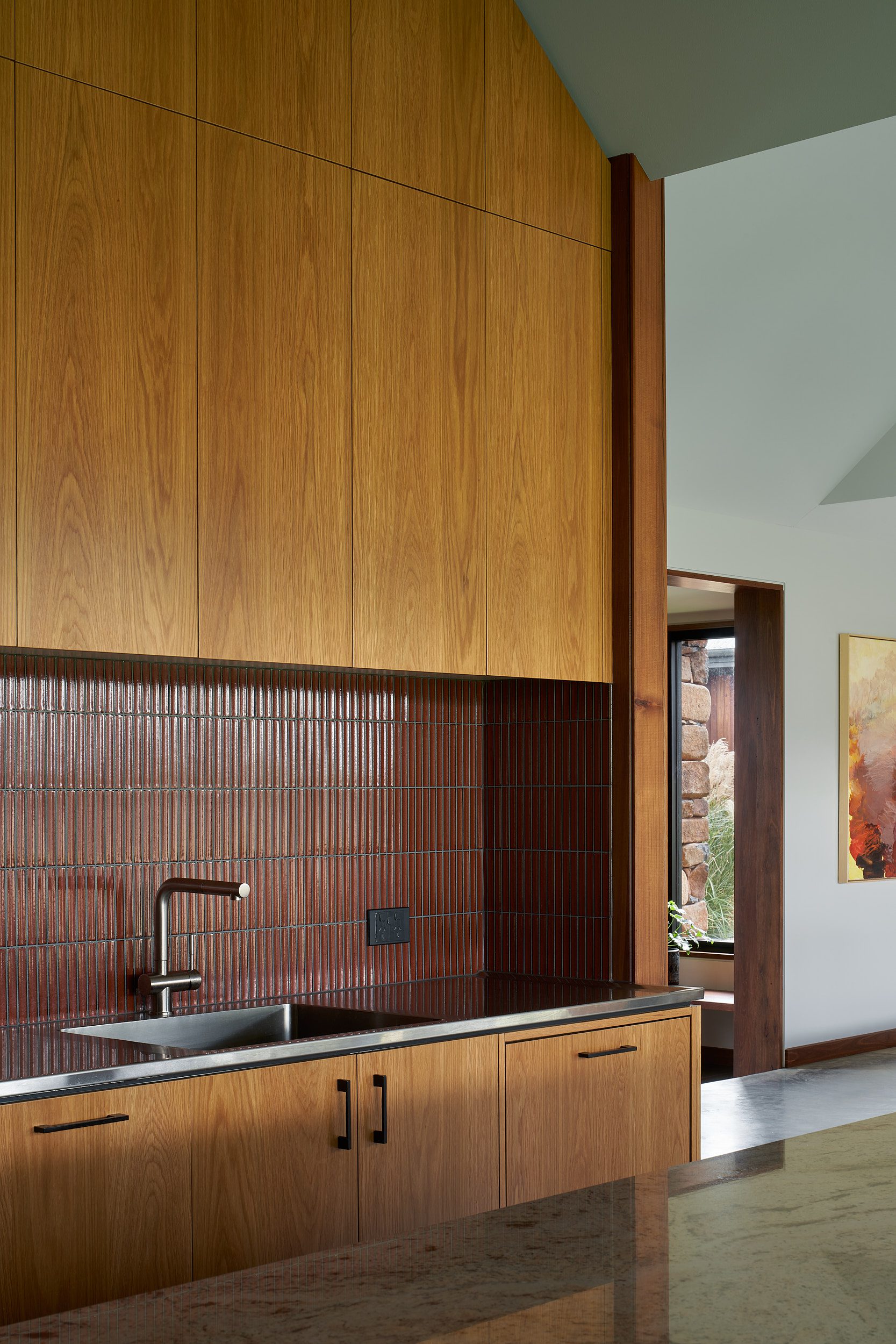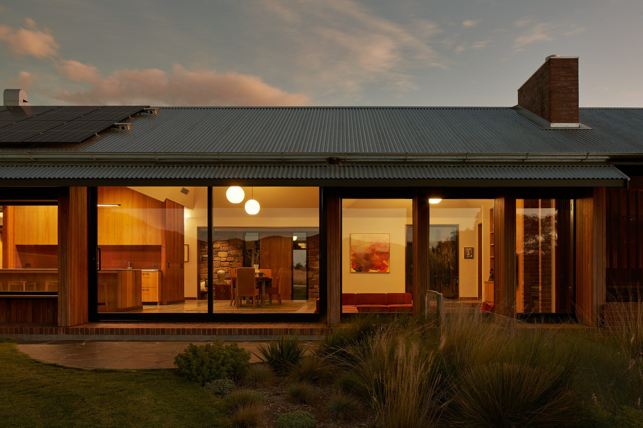 Architektura domu nawiązuje do języka gospodarczego – wykorzystano metal, drewno i kamień. Dach o matowym, srebrzystym odcieniu oraz ciemne panele elewacyjne sprawiają, że bryła wtapia się w otoczenie, a drewno ironbark dodaje jej naturalnego charakteru. Wnętrza rozróżniono pod względem funkcji – „wewnętrzne” wykończono tynkiem, drewnem i płytkami, a „zewnętrzne” przestrzenie podkreślono cegłą, kamieniem i drewnem.