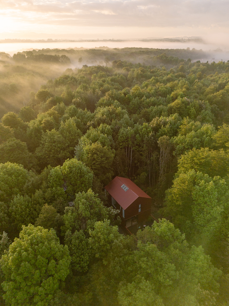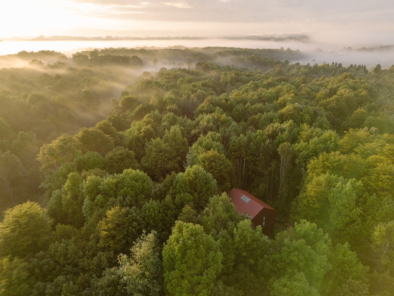 Prosta i regularna kompozycja, przypominająca pionek z gry Monopoly na nieokreślonej planszy, akcentuje napięcie między konstrukcją a otoczeniem. Poprzez trzy kluczowe elementy — łuki w fundamentach, portal wejściowy i centralne pustkowie — nowoczesna stodoła nawiązuje dialog z otoczeniem, harmonizując z leśnym krajobrazem, jednocześnie zachowując swoją unikalną tożsamość.