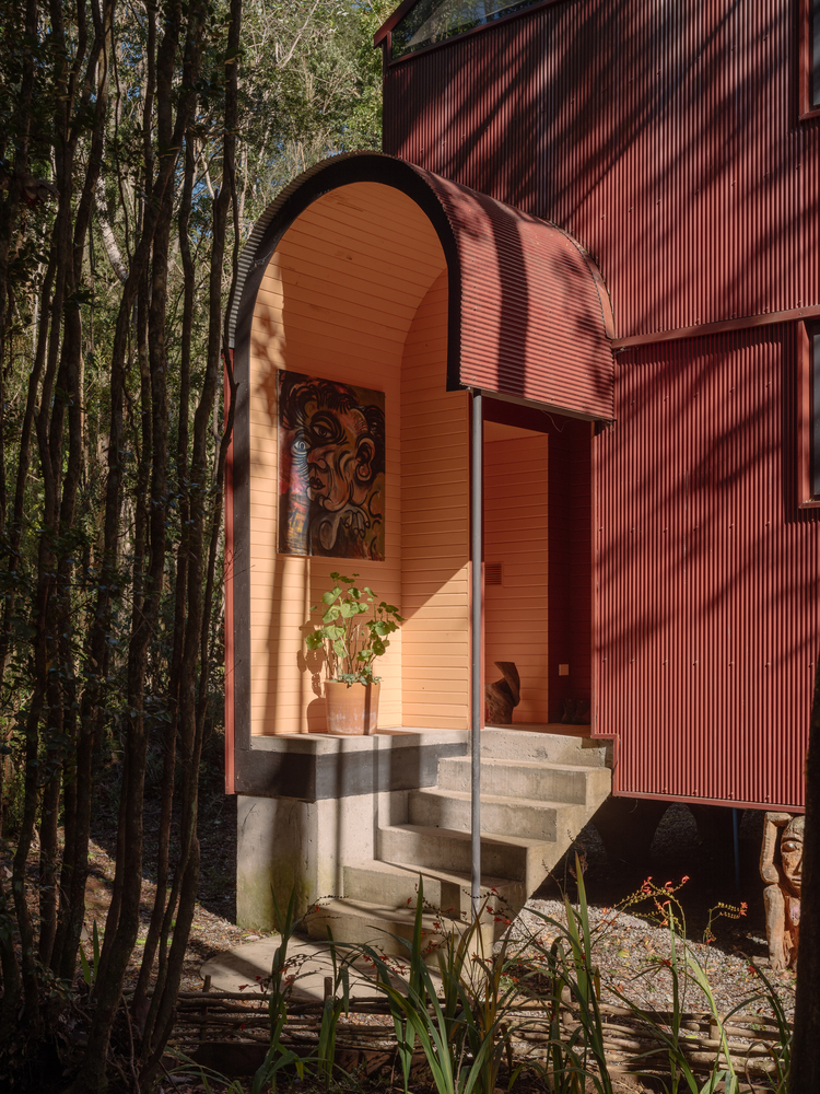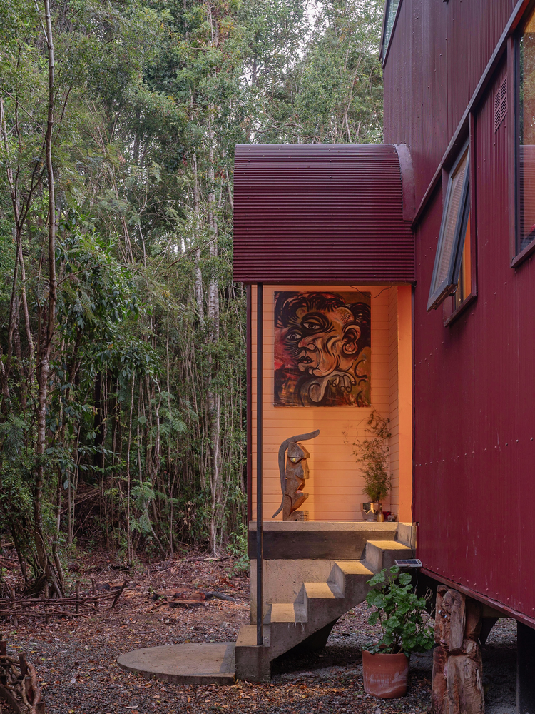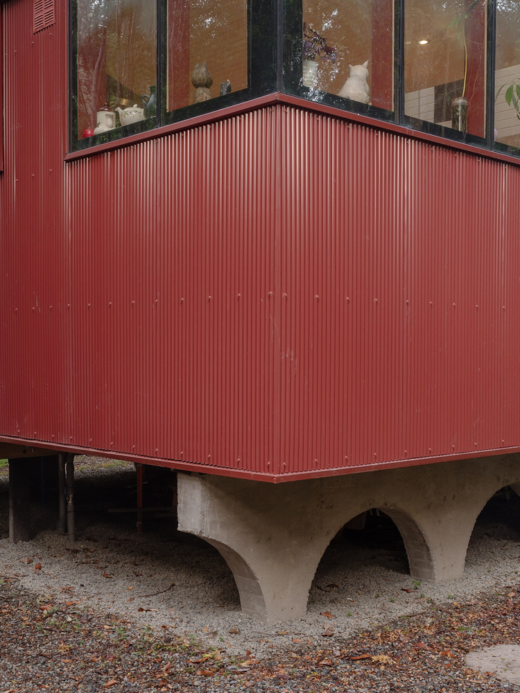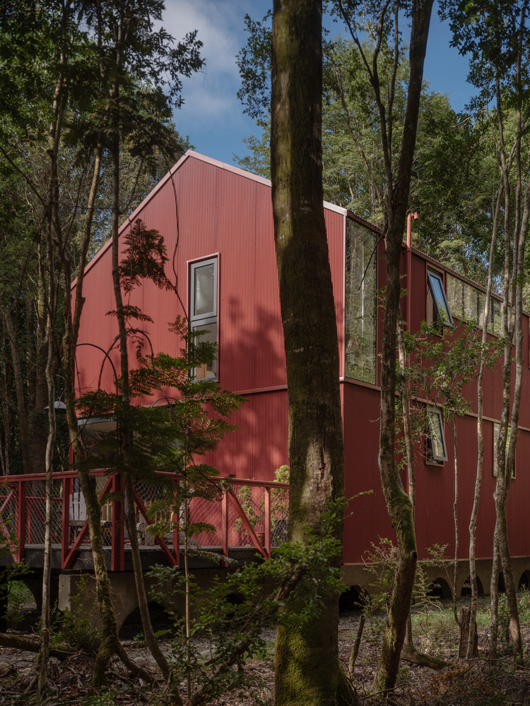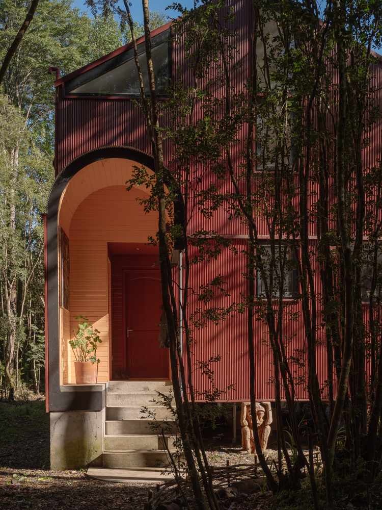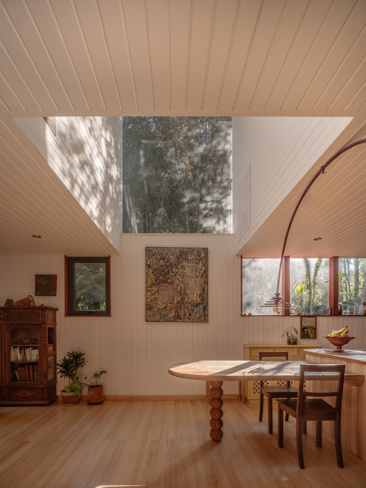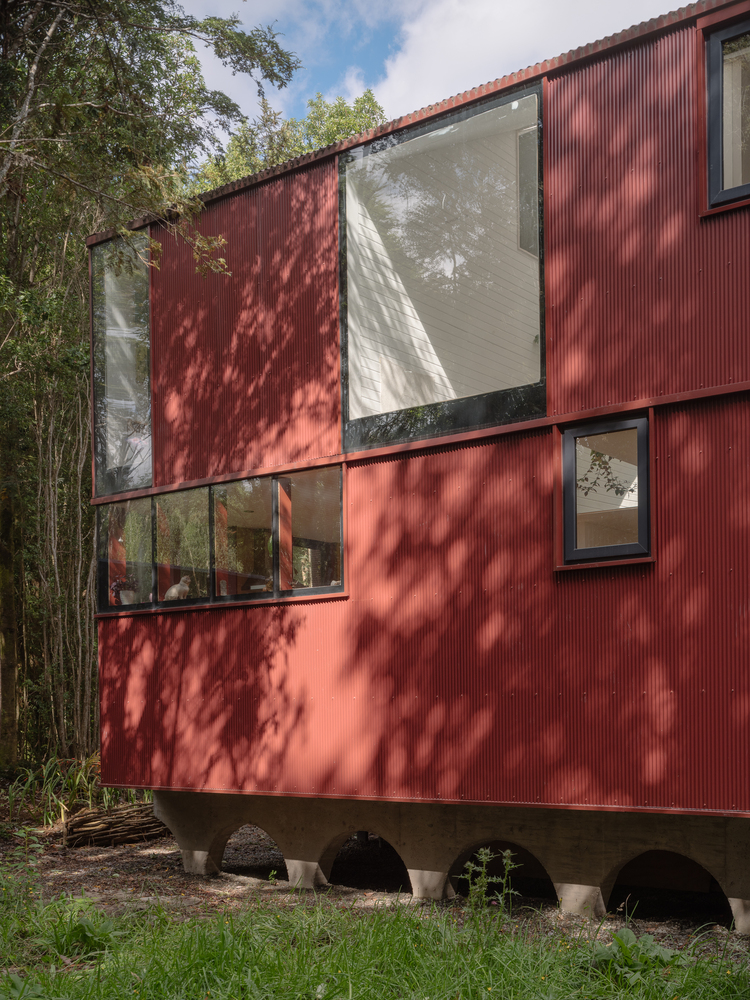 Położony w gęstym lesie w południowym Chile, niedaleko Puerto Varas, ten projekt domu wyróżnia się zwartą formą uniesioną na łukowatych fundamentach, które minimalizują kontakt z podłożem i podkreślają kontrast między dwiema poziomymi płaszczyznami. Na parterze znajdują się przestrzenie wspólne, z minimalną liczbą otworów, co wzmacnia poczucie schronienia i zachowuje filtrowane światło charakterystyczne dla lasu.