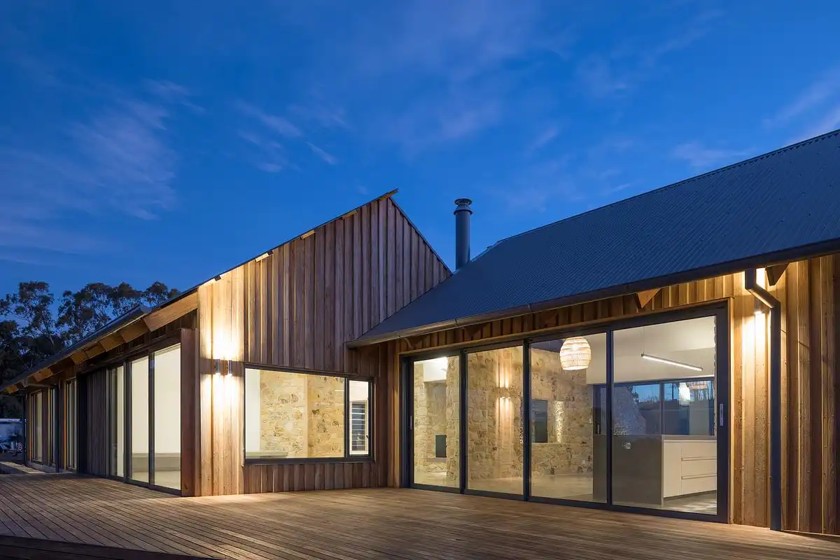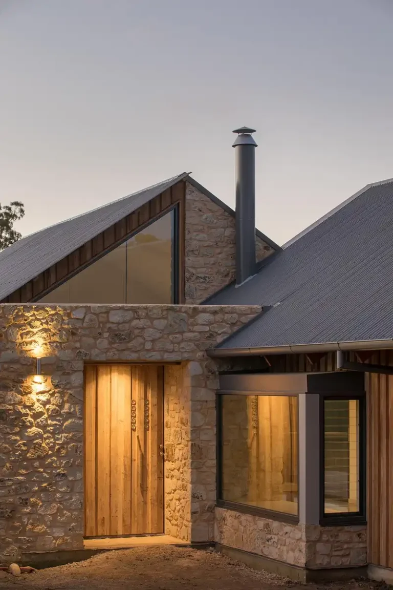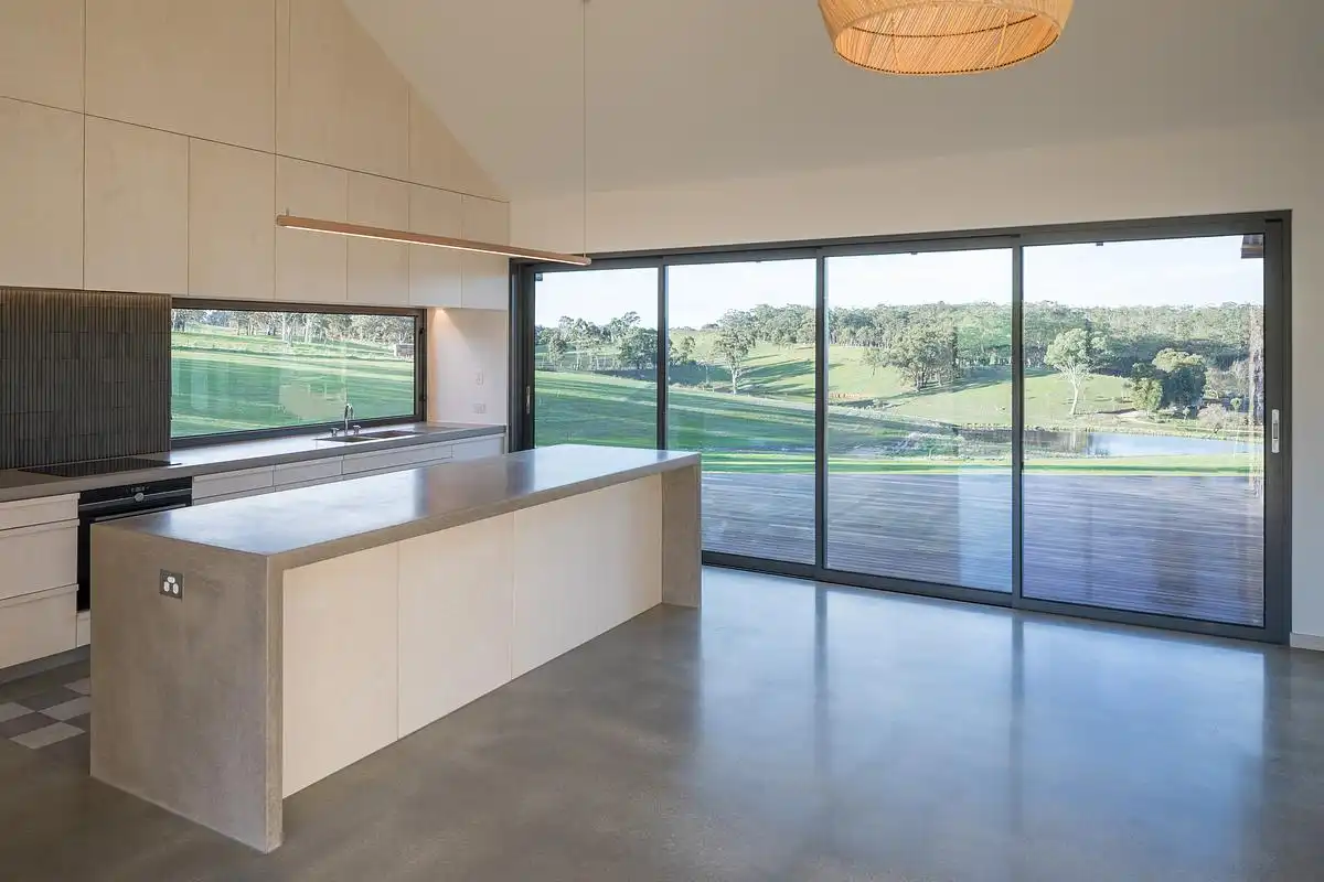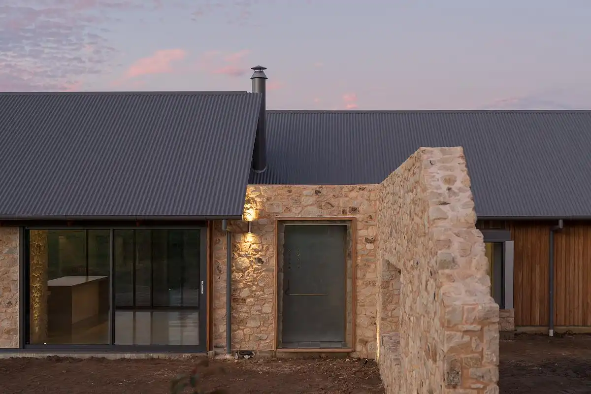 Motyw kamienia konsekwentnie przenika również do wnętrz, gdzie stanowi kontrapunkt dla prostych, trwałych materiałów wykończeniowych. Polerowane posadzki i blaty z betonu, bielone sklejki meblowe oraz białe ściany tworzą spokojne tło dla wyrazistej faktury kamiennych powierzchni. Wnętrza są surowe, ale ciepłe, pozbawione zbędnej dekoracyjności, a ich charakter opiera się na naturalnych materiałach, świetle dziennym i bezpośrednim związku z krajobrazem Adelaide Hills.