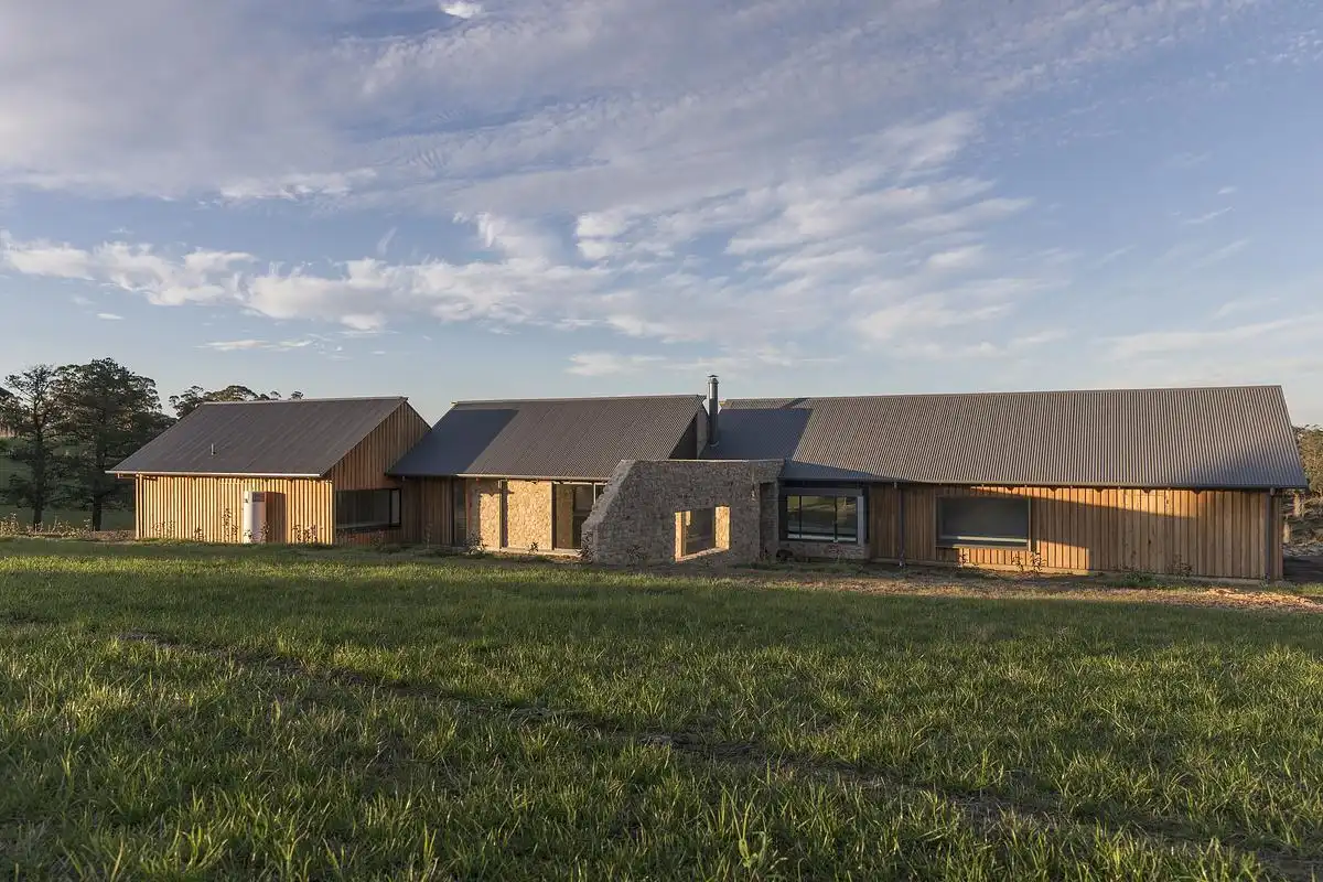 Projekt autorstwa James Allen Architect opiera się na wydłużonym rzucie, który dokładnie podąża za naturalnym ukształtowaniem terenu. Taki układ pozwolił ograniczyć ingerencję w grunt do minimum i zachować płynne przejście pomiędzy architekturą a krajobrazem. Większość pomieszczeń została skierowana w stronę otwartych widoków, dzięki czemu dom nieustannie pozostaje w dialogu z otaczającą go przestrzenią wzgórz i pól.