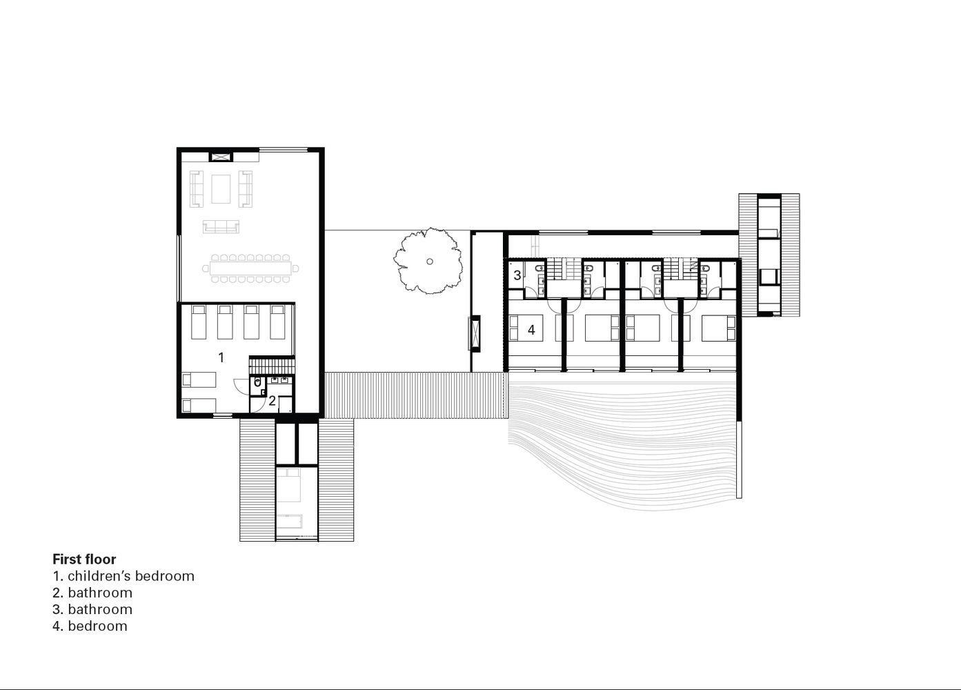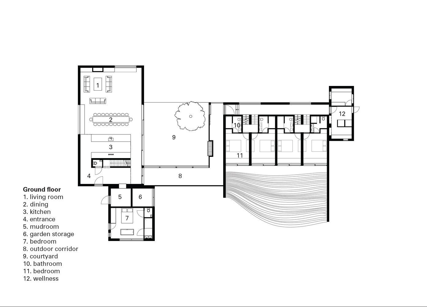 Wnętrze domu zostało zaprojektowane z myślą o wielopokoleniowej rodzinie – nowoczesna stodoła mieści 10 sypialni i 24 łóżka. Szeroki korytarz łączy osiem sąsiadujących ze sobą sypialni, a otwarte klatki schodowe zapewniają przejrzysty układ wnętrza. Każda sypialnia ma wyjątkowy widok na las, a jasna konstrukcja wnętrza ułatwia orientację w przestrzeni, jednocześnie tworząc komfortowe warunki do spędzania czasu wspólnie i prywatnie.
