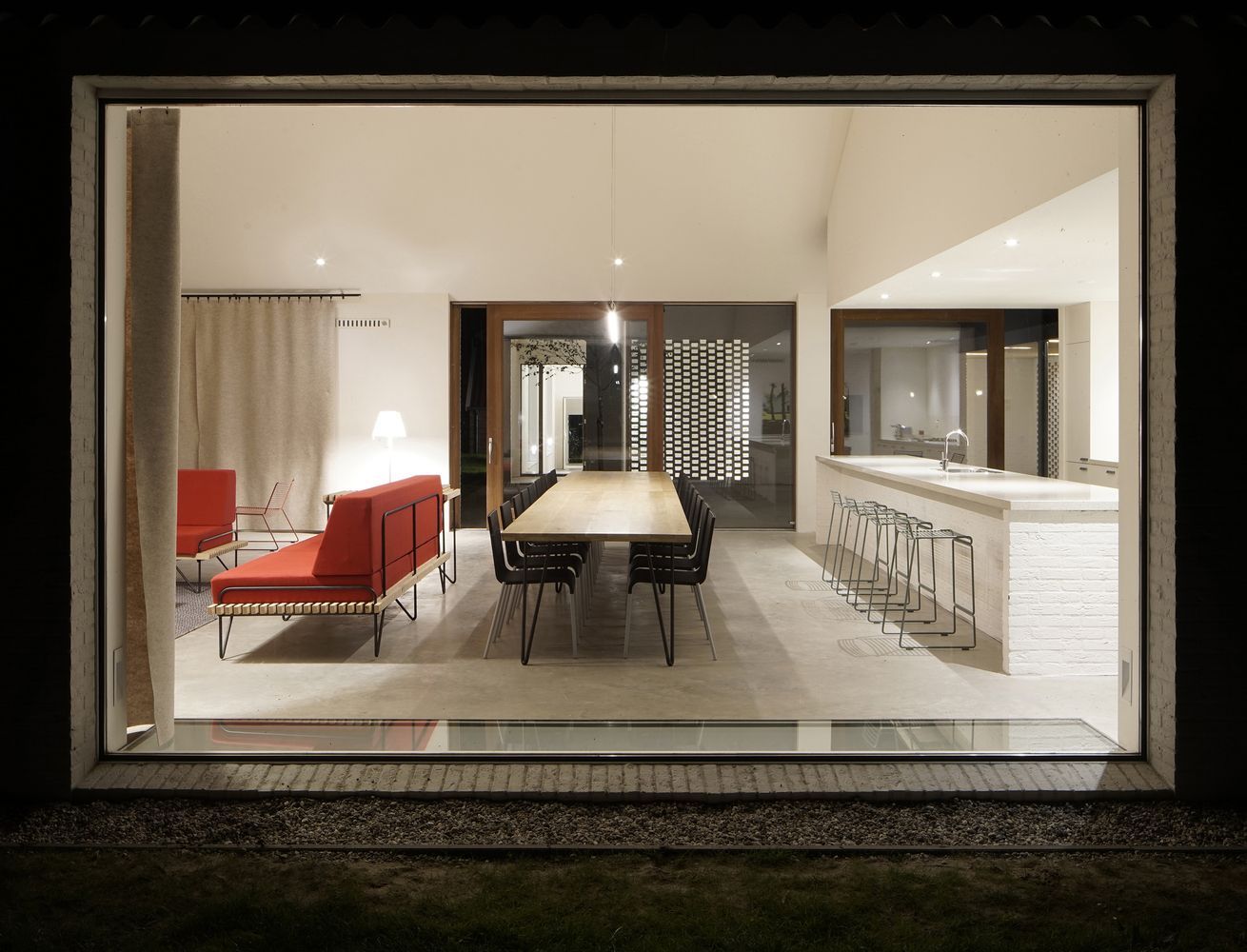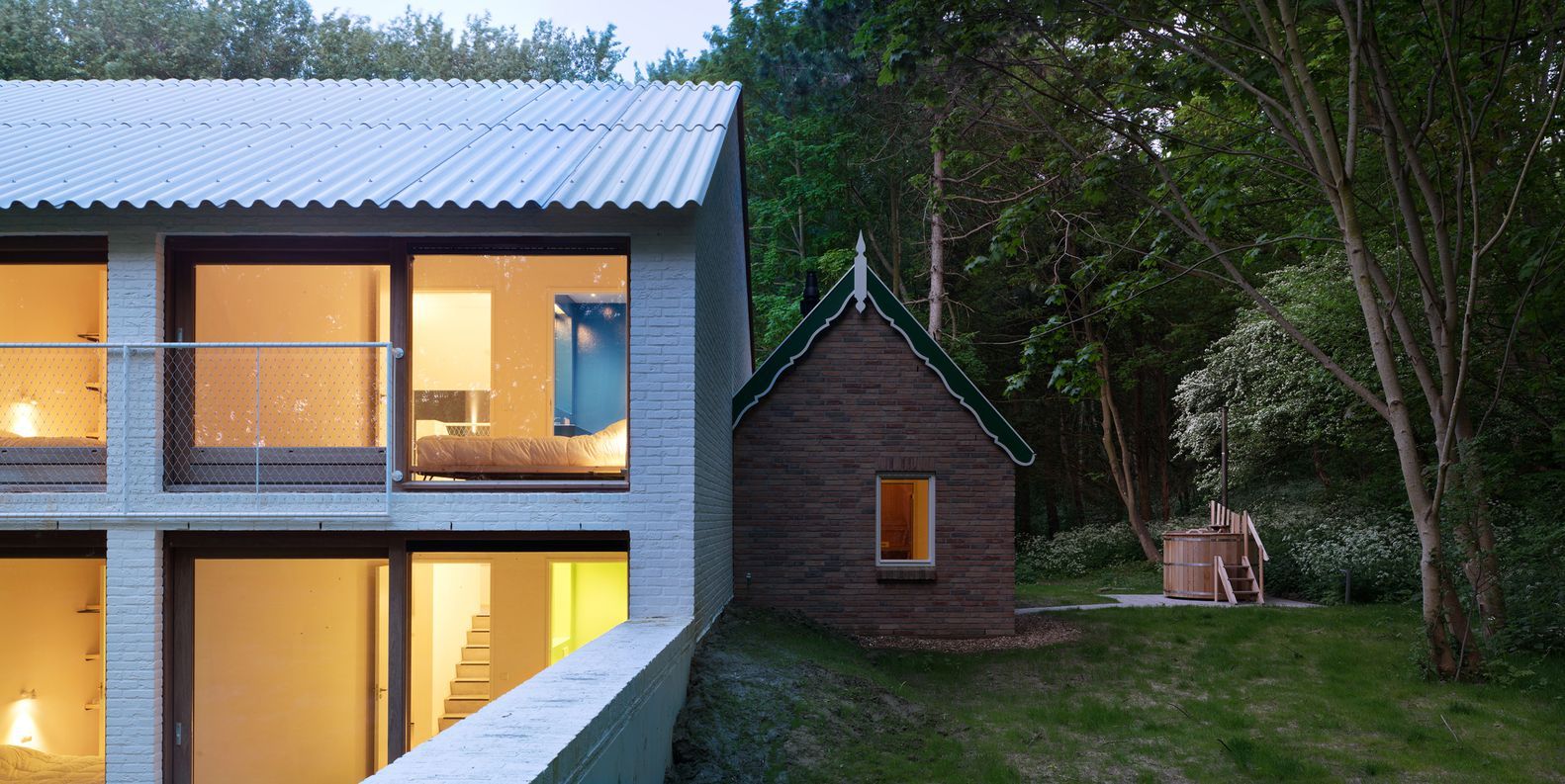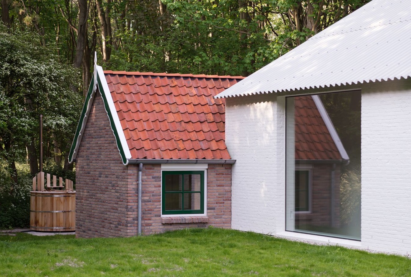 Nowoczesna stodoła o nazwie House in the Woods łączy elegancję z industrialnym charakterem, zachowując jednocześnie tradycyjny kształt budynku. Willa składa się z części dziennej i sypialnej, połączonych otwartym korytarzem, który pozwala na płynne przejście między przestrzeniami. Stare szopy na działce zostały odnowione i zintegrowane z nową konstrukcją, tworząc spójną całość z otaczającym lasem, który przenika do wnętrza domu. Duże okna sięgające podłogi oraz ściana z ażurowej cegły podkreślają bliską więź między przestrzenią wewnętrzną a naturą.