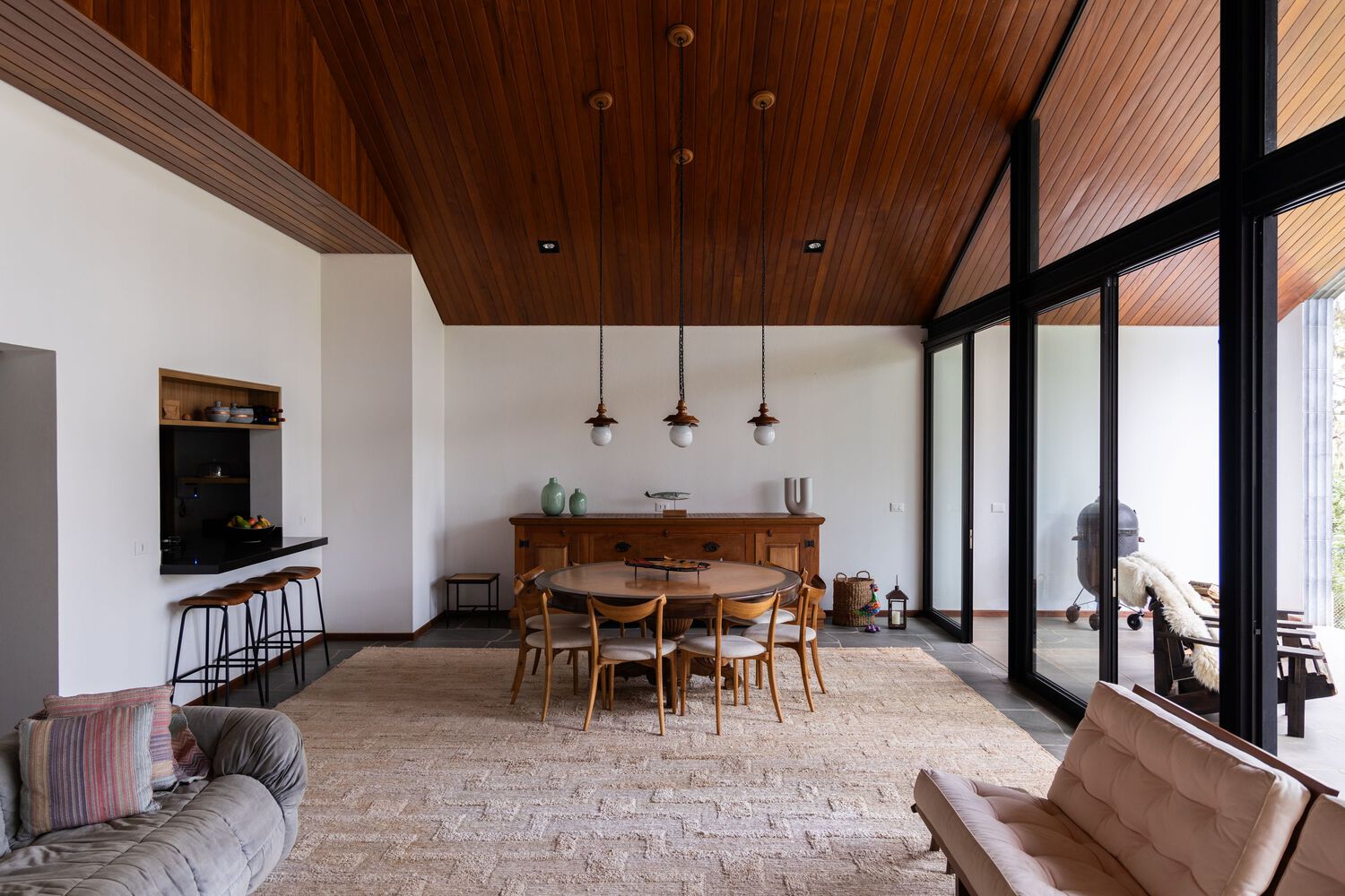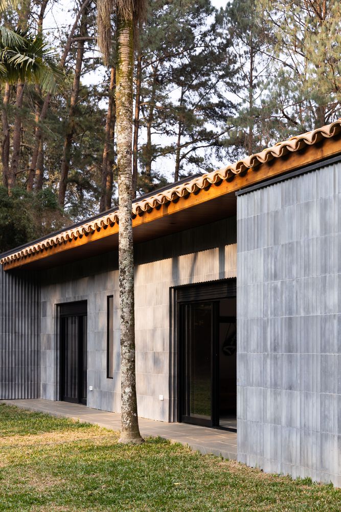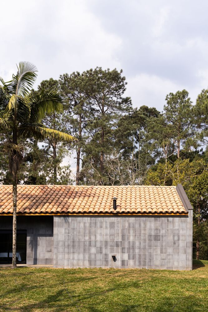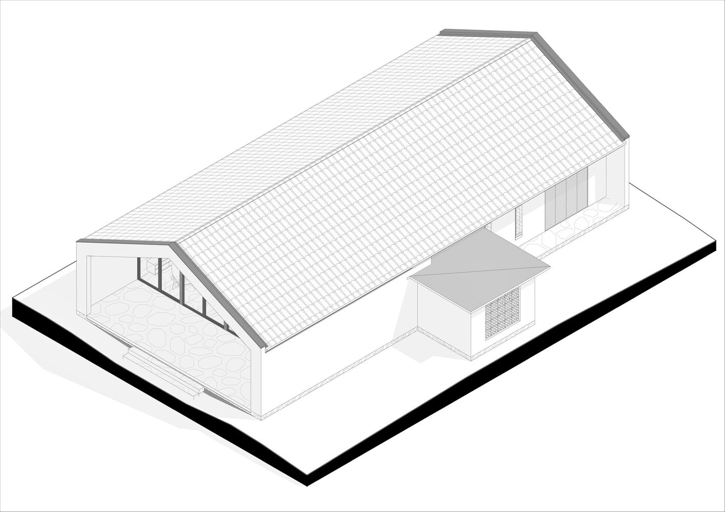 Dom został zaprojektowany tak, aby z każdego pomieszczenia można było łatwo wyjść do ogrodu, a duże okna wzmacniają poczucie harmonii z naturą. Tradycyjny dwuspadowy dach nadaje budynkowi czystą formę, nawiązującą do archetypu wiejskiego domu, a duże gliniane płytki nadają mu charakterystyczny, wiejski styl. Elewacje przednia i tylna domu mają identyczny kształt, ale różnią się materiałami: jedna jest całkowicie przeszklona, a druga pozbawiona otworów, co tworzy subtelną grę kontrastów.
