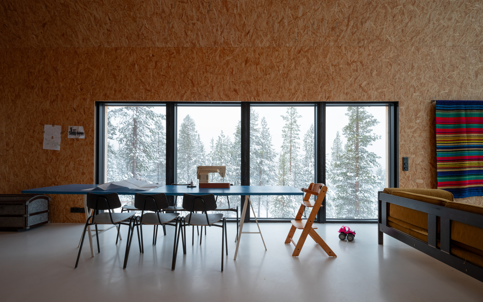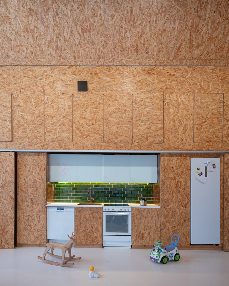 Budowa domu przypadła na trudny moment globalny, naznaczony pandemią COVID-19 oraz wybuchem wojny w Ukrainie, co przełożyło się na gwałtowny wzrost cen materiałów. Aby zmieścić się w założonym budżecie, zdecydowano się na zastosowanie płyt OSB jako głównego materiału wykończeniowego ścian wewnętrznych. Surowość tego rozwiązania została zrównoważona jednolitą, białą posadzką poliuretanową, która rozjaśnia przestrzeń i nadaje jej czysty, współczesny charakter.