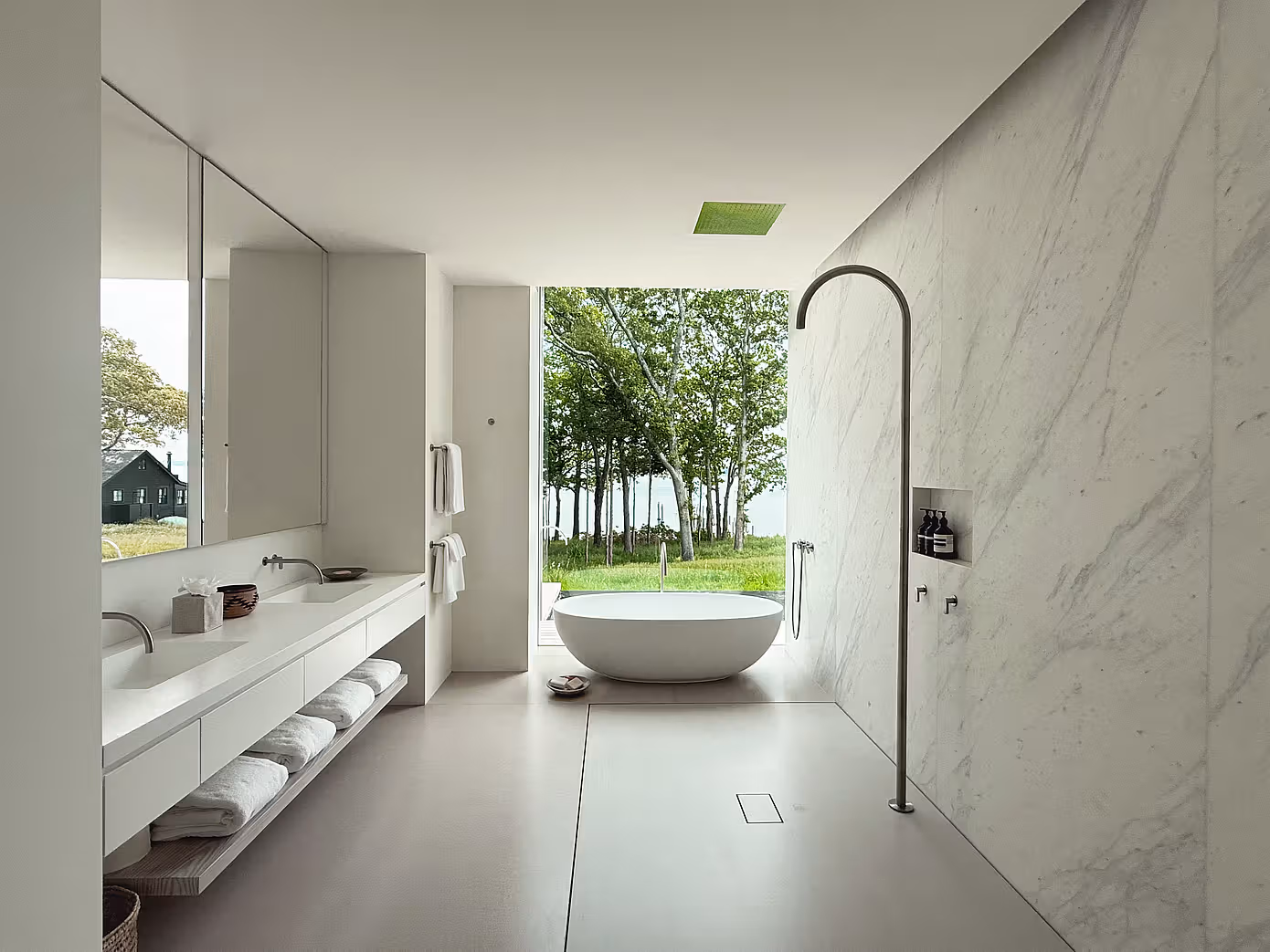 Dłuższe skrzydło domu, ustawione równolegle do linii brzegowej, mieści salon, jadalnię i kuchnię. Wysokie sufity nadają przestrzeni lekkości, a wielkoformatowe przesuwne przeszklenia otwierają wnętrze na 38-metrowy taras. Południowa weranda pozwala cieszyć się świeżym powietrzem bez owadów, a niskie meble nie zakłócają panoramicznych widoków.