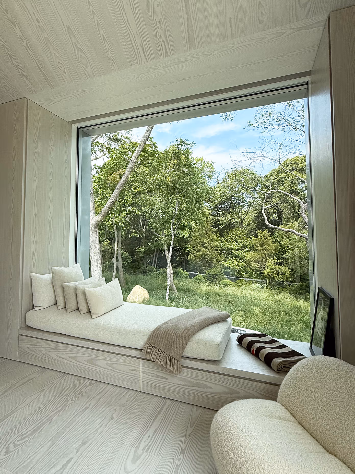 Krótsza bryła pełni funkcję strefy nocnej. Sypialnie otwierają się na las i wodę, a duże okno z wnęką do siedzenia staje się miejscem do czytania czy obserwowania przypływów. Wnętrza utrzymane są w jasnych tonach jesionu, który tworzy atmosferę spokoju i bliskości natury. Drzwi przesuwne prowadzą bezpośrednio do ogrodu.