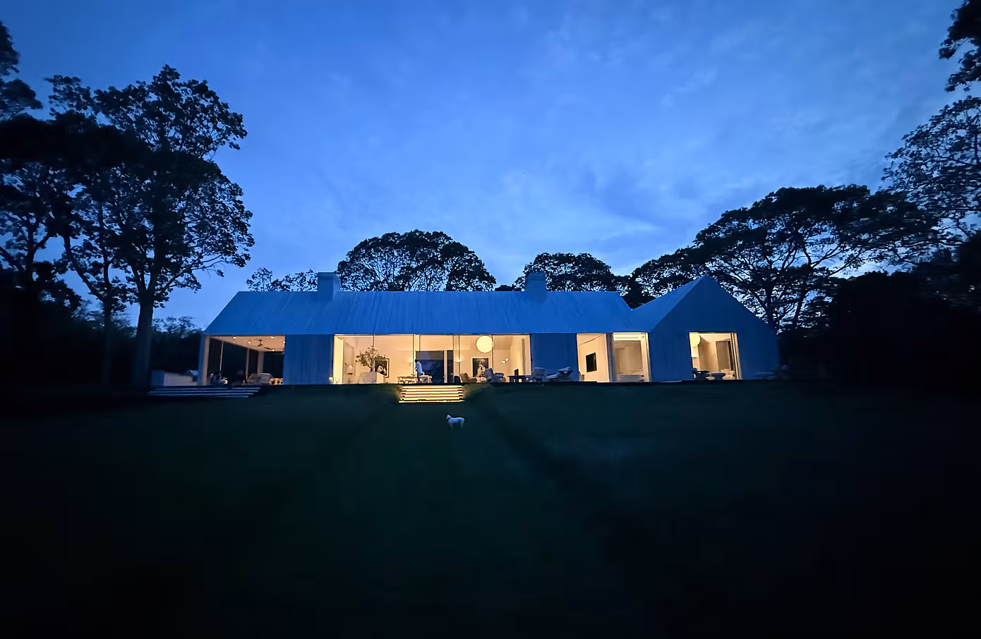 Na zewnątrz architekci stworzyli miejsca integrujące dom z naturą – ciemny basen odbijający niebo i trawy łąkowe oraz kamienny krąg z paleniskiem pod dębami. Wieczorami oba skrzydła domu rozświetlają się niczym dwie latarnie na wzgórzu, wprowadzając atmosferę spokoju i domowego ciepła.