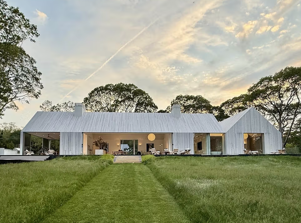 Na zachodnim brzegu Sag Harbor Bay, w Nowym Jorku, powstał House on Sag Harbor – rodzinny dom zaprojektowany przez pracownię 1100 Architect. Jego forma czerpie inspirację z tradycyjnych stodół, a układ przestrzenny łączy codzienne życie z wodą, łąką i otaczającymi drzewami. Dwie prostokątne bryły przecinają się pod kątem prostym, otwierając na taras nad zatoką, werandę i ścieżkę prowadzącą do skromnej, modernistycznej chaty położonej tuż przy brzegu. Wieczorem promienie słońca muskają przyciętą trawę i łąkę, a dom jawi się jako dwie świetliste, dwuspadowe bryły osadzone w krajobrazie.